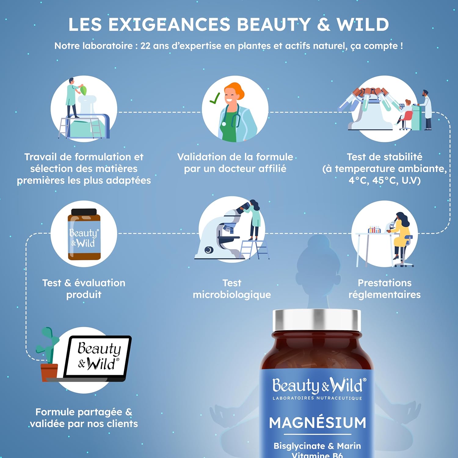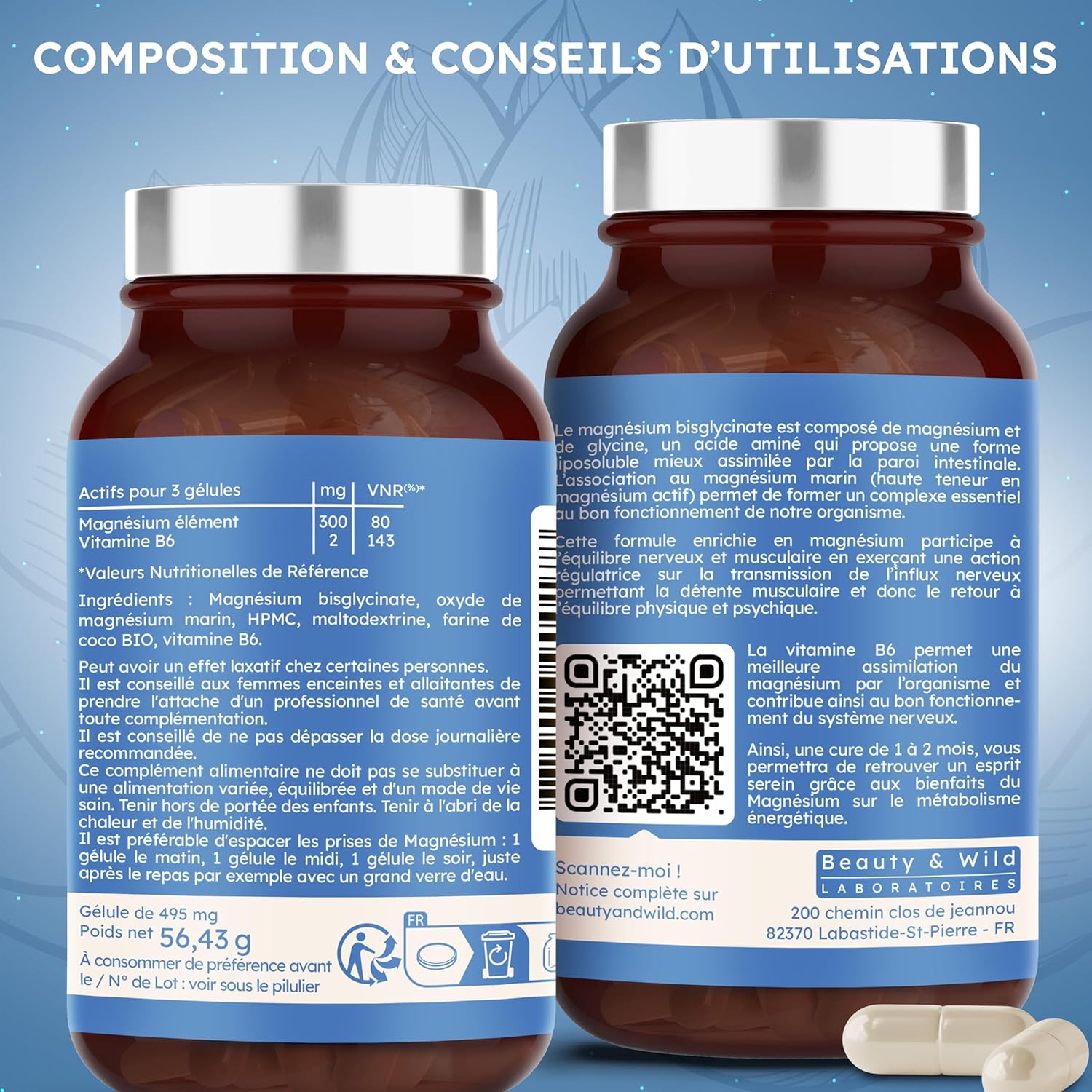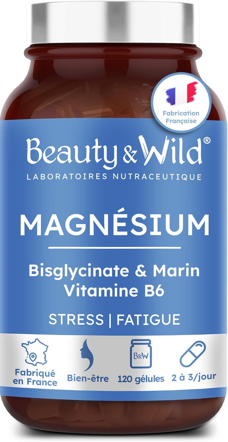 Magnesium + Vitamin B6 | Magnesium Bisglycinate, Marine Magnesium | Anti-Stress, Fatigue, Cortisol | High Content & Absorption | 300mg/day | 120 Capsules | Made in France | Beauty & Wild