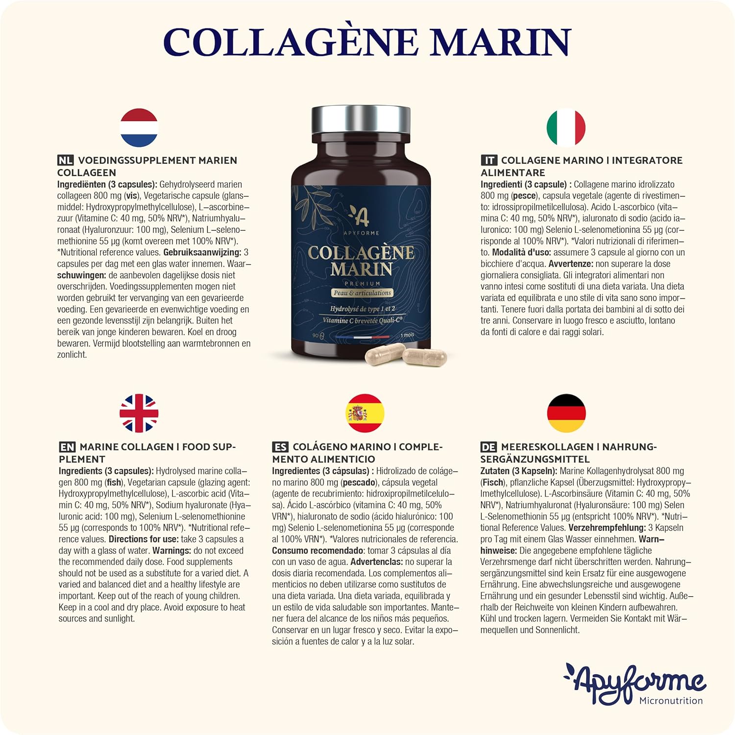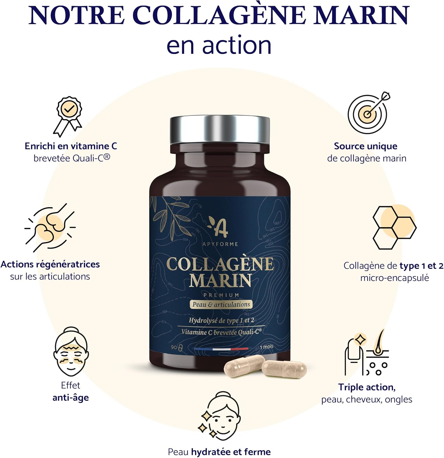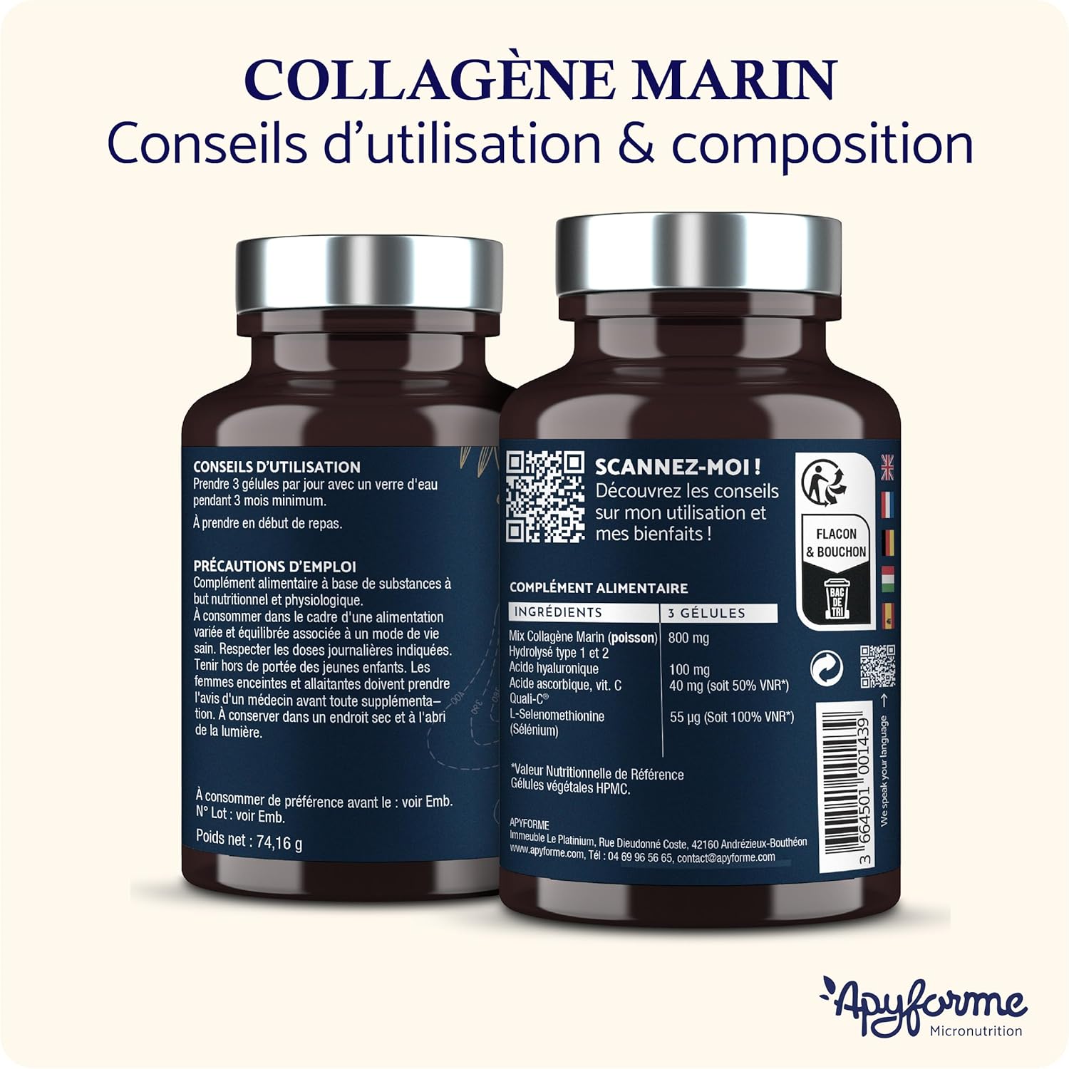 Our experts advise you: Take 3 capsules a day before a meal with a glass of water. Odourless and neutral in taste, easily incorporate Apyforme Marine Collagen into your routine for lasting benefits on your well-being.