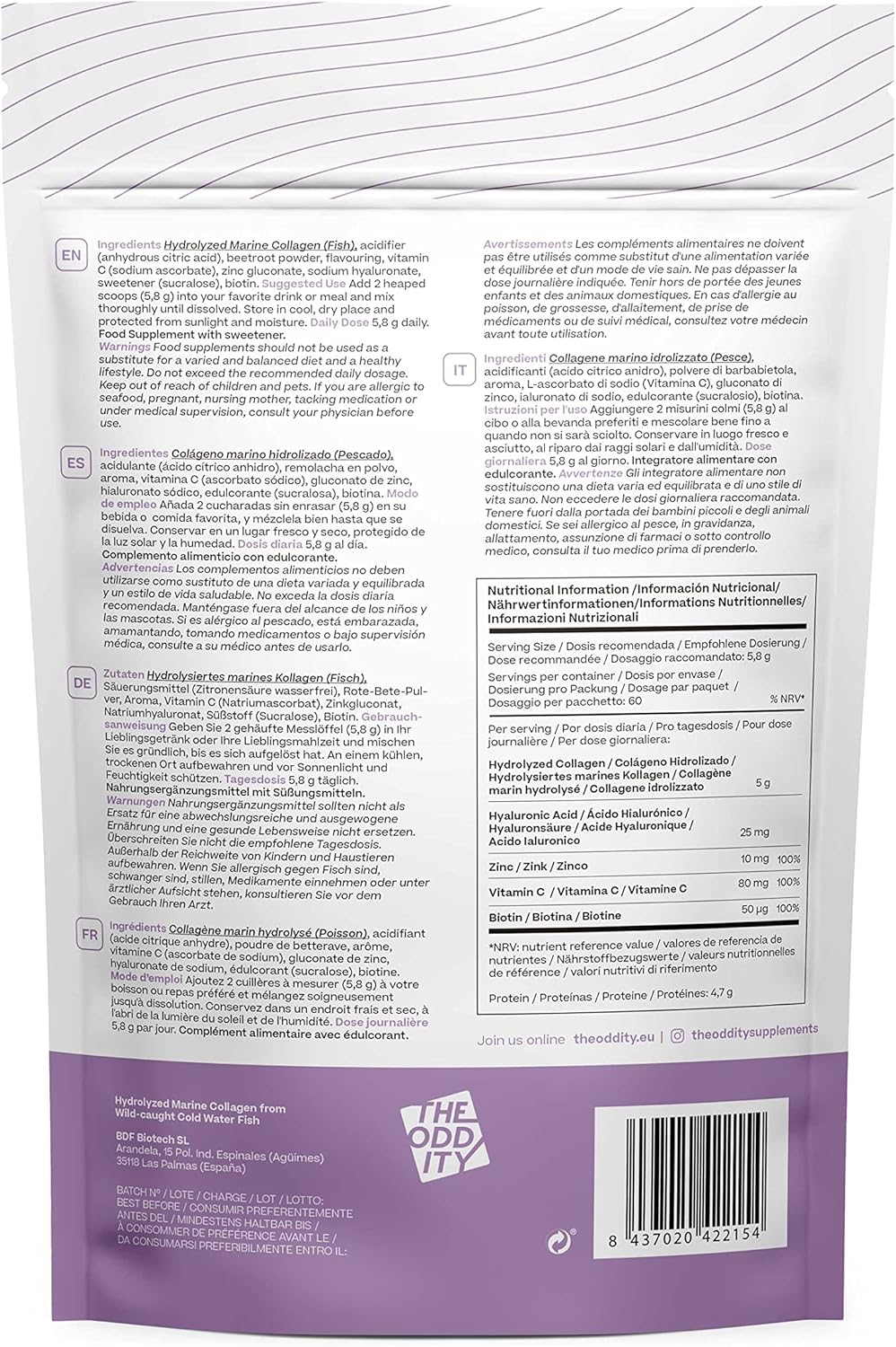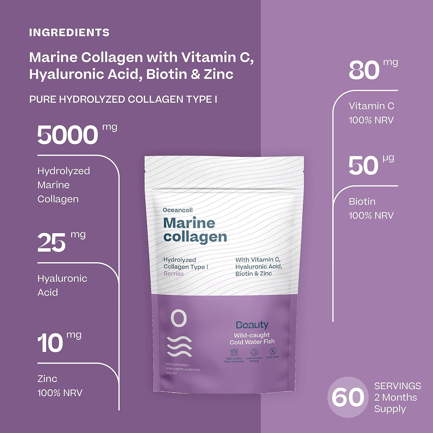 Collagen and Hyaluronic Acid. Each dose contains 5000 mg of marine collagen peptides type I, 25 mg hyaluronic acid, 10 mg of zinc, 80 mg of vitamin C and 50 mcg of biotin.