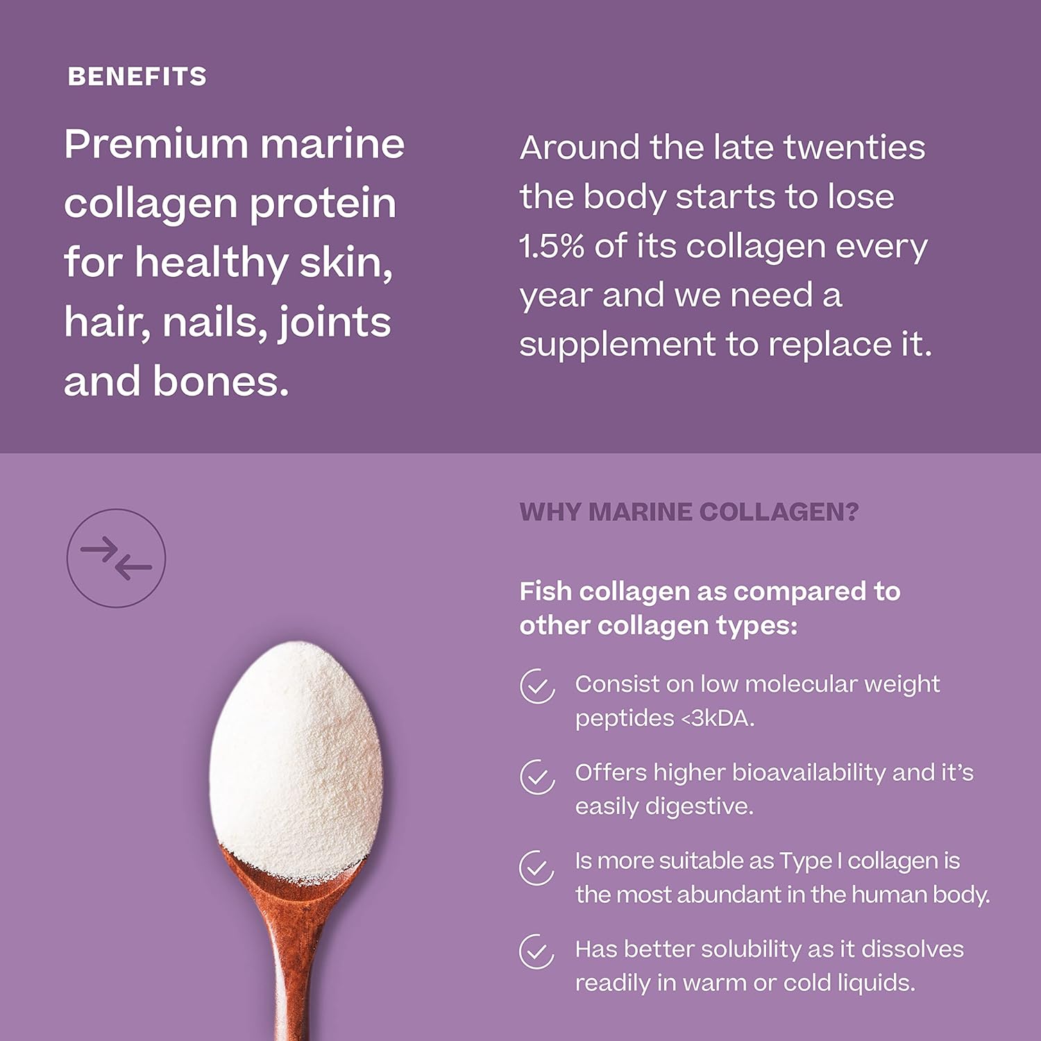 Marine collagen peptides are 1.5 times easier to absorb in the body. Marine collagen is assimilated more effectively and has better bioavailability than other types of non-vegetarian collagen.