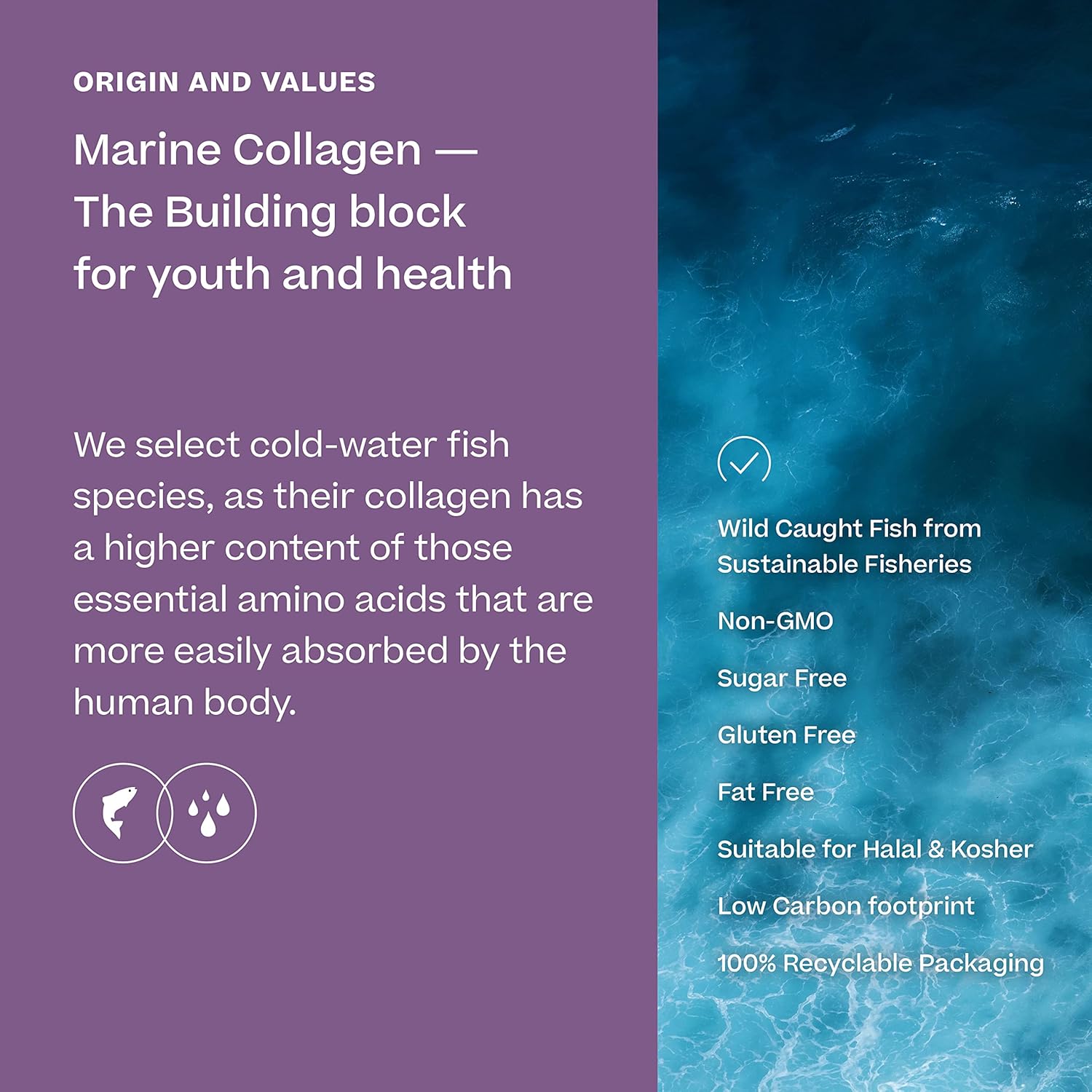 Nous sélectionnons des espèces de poissons d’eau froide, car leur collagène contient une plus grande quantité d’acides aminés essentiels qui sont plus facilement absorbés par le corps humain.