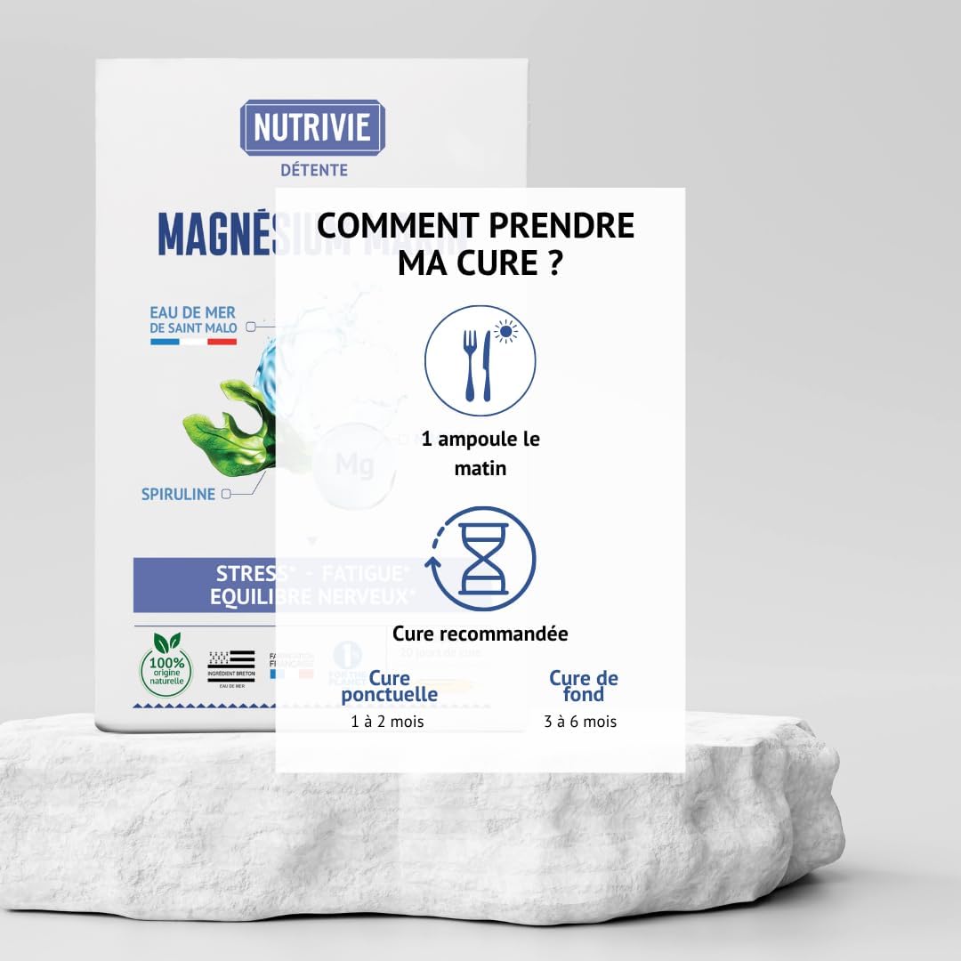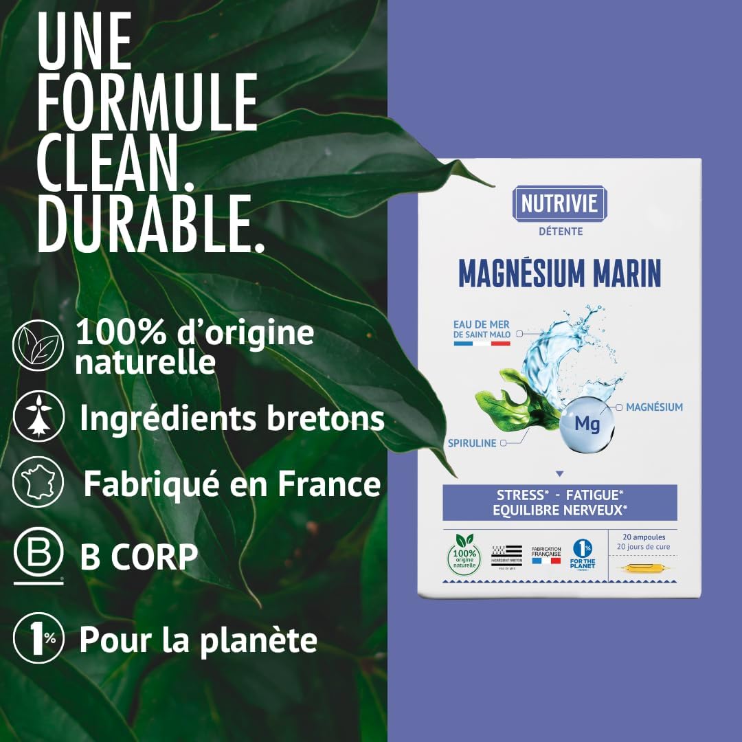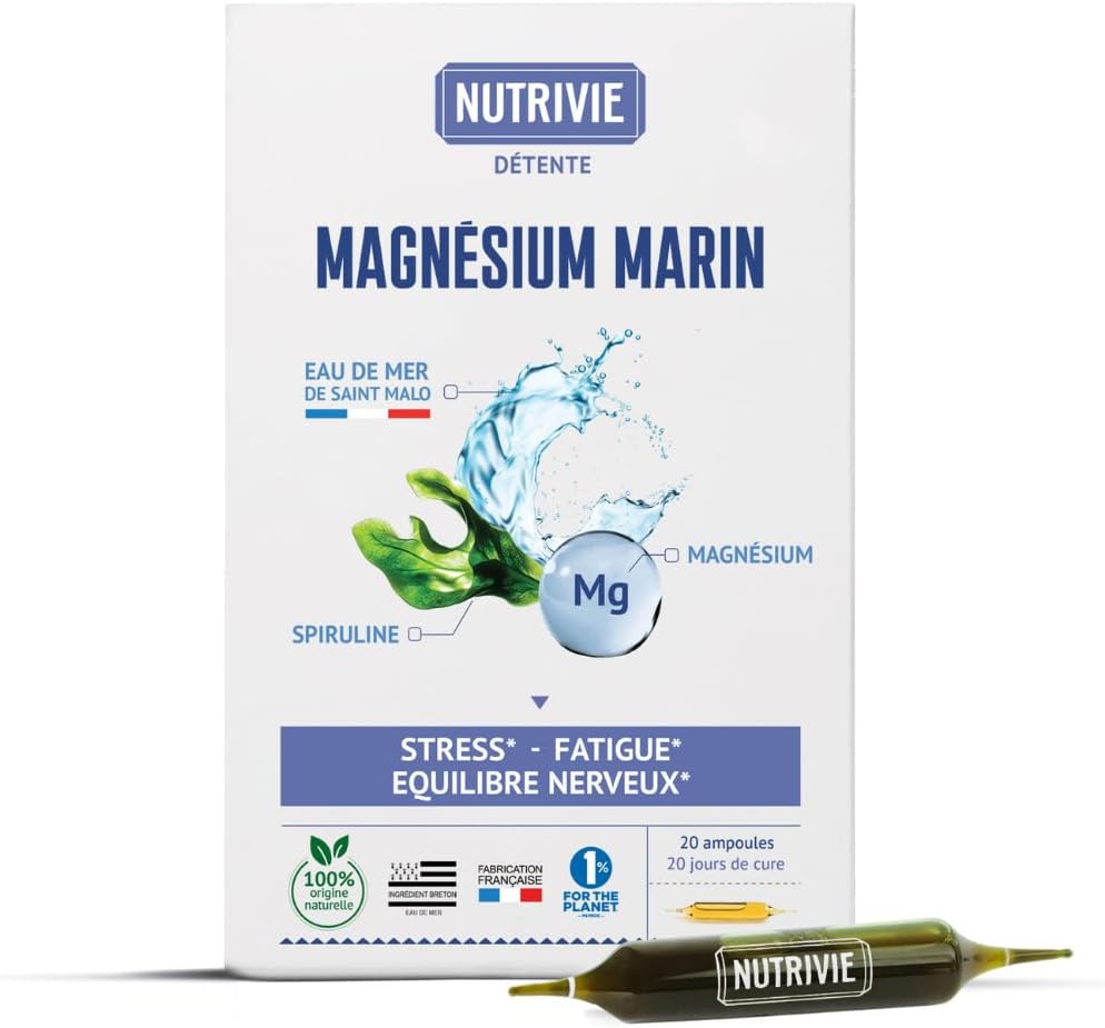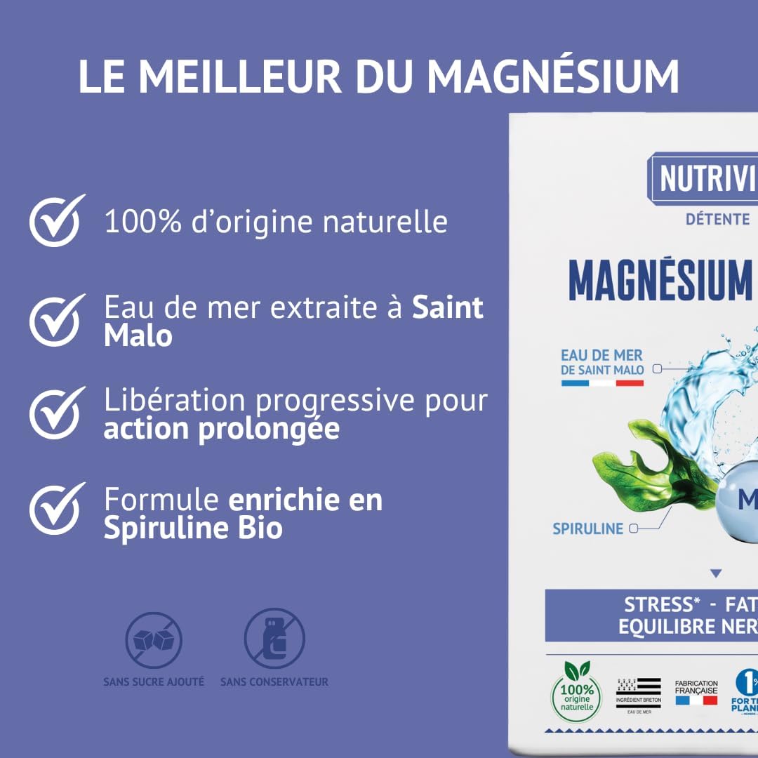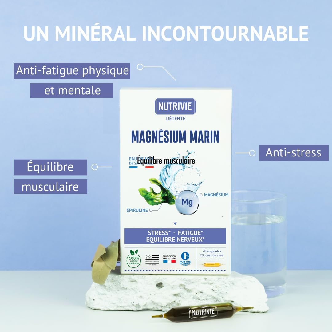 Nervous balance* and Reduction of fatigue*. ; Chronic fatigue, stress, cramps… are all symptoms indicating magnesium deficiency. This phenomenon is far from rare to affect a large majority of people. This mineral derived from the sea can therefore be of great help to rebalance your body. ; Nutrivie’s Marine Magnesium Complex, composed of magnesium from the Brittany Sea, and organic spirulina will help you reduce fatigue*. ;;*Magnesium contributes to normal functioning of the nervous system and psychological functions. It helps reduce fatigue and maintain normal bone and muscle function. Product advantages: 100% natural origin, preservative-free, high dosage of active ingredients, preservation technique: tyndallisation (gentle sterilisation), to ensure the quality of the product.