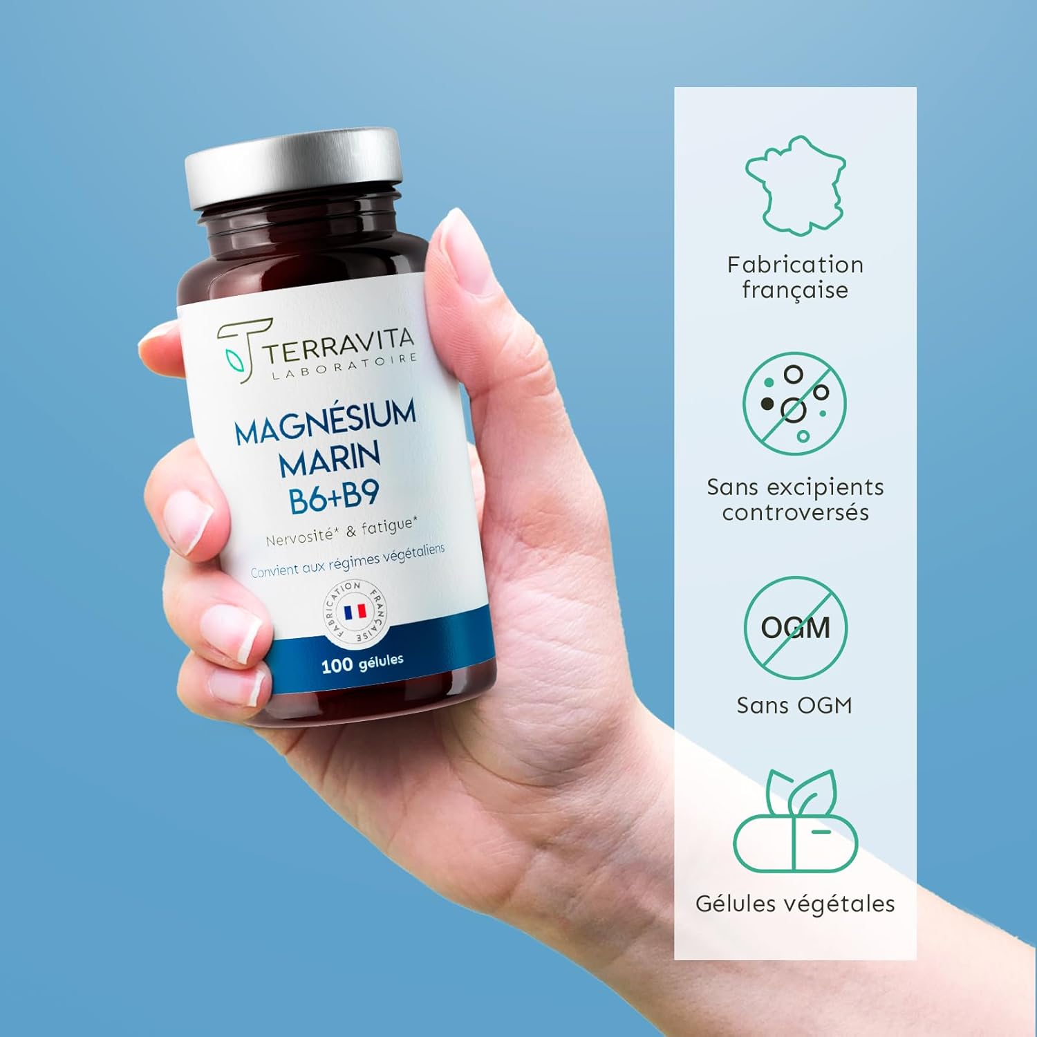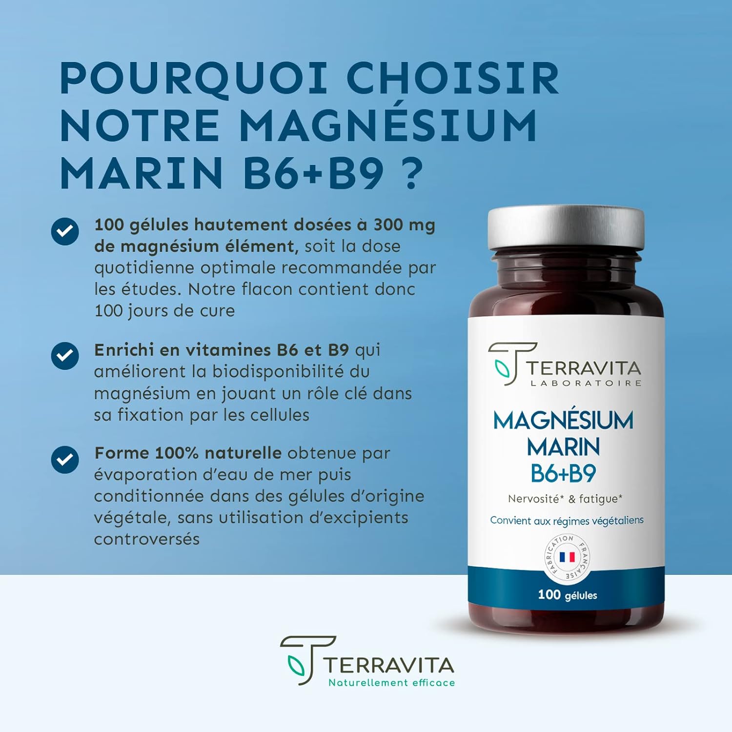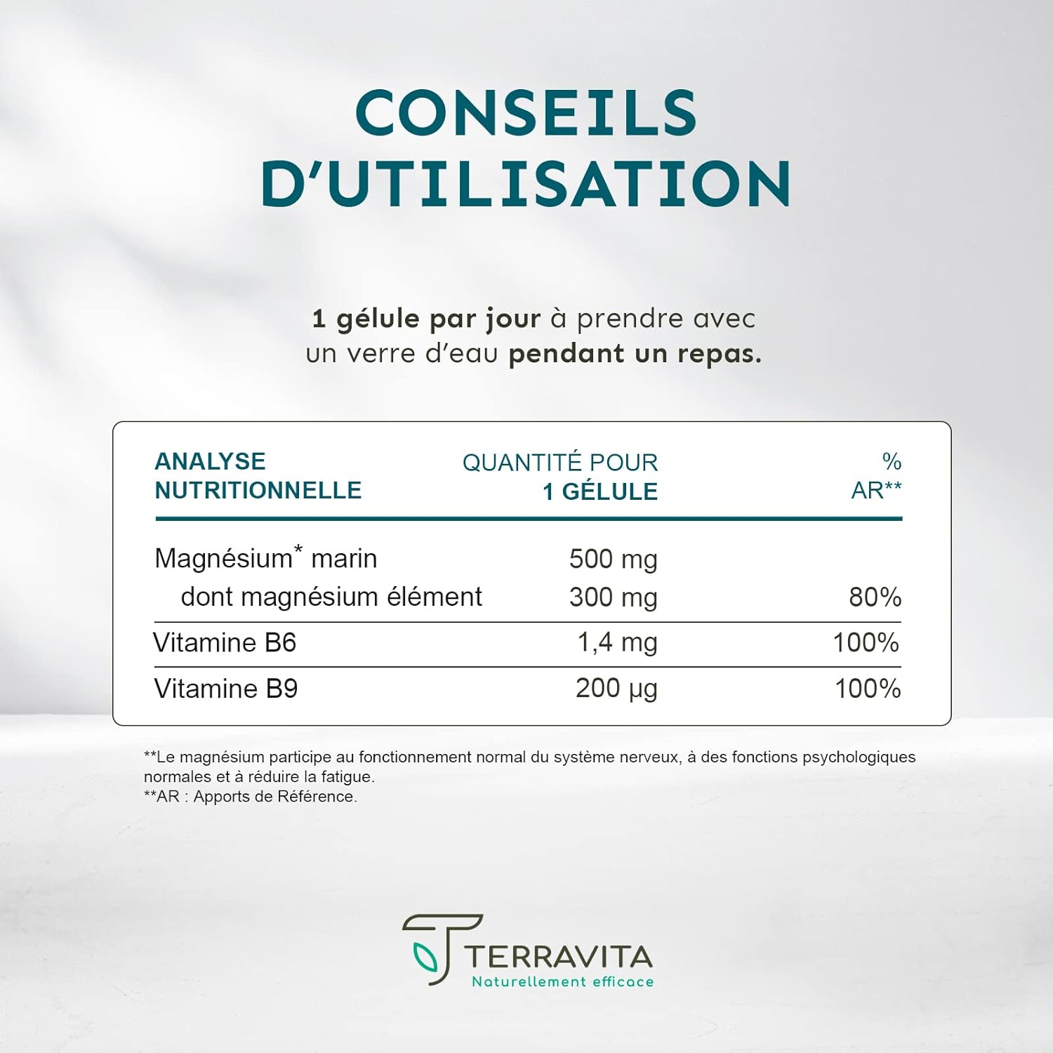 MARINE MAGNESIUM + Vit B6 B9 | 300mg of Magnesium Element per Capsule | 100 Days of Cure | Fights Stress and Fatigue | Improves Sleep | 100 Organic Capsules Made in France | Terravita