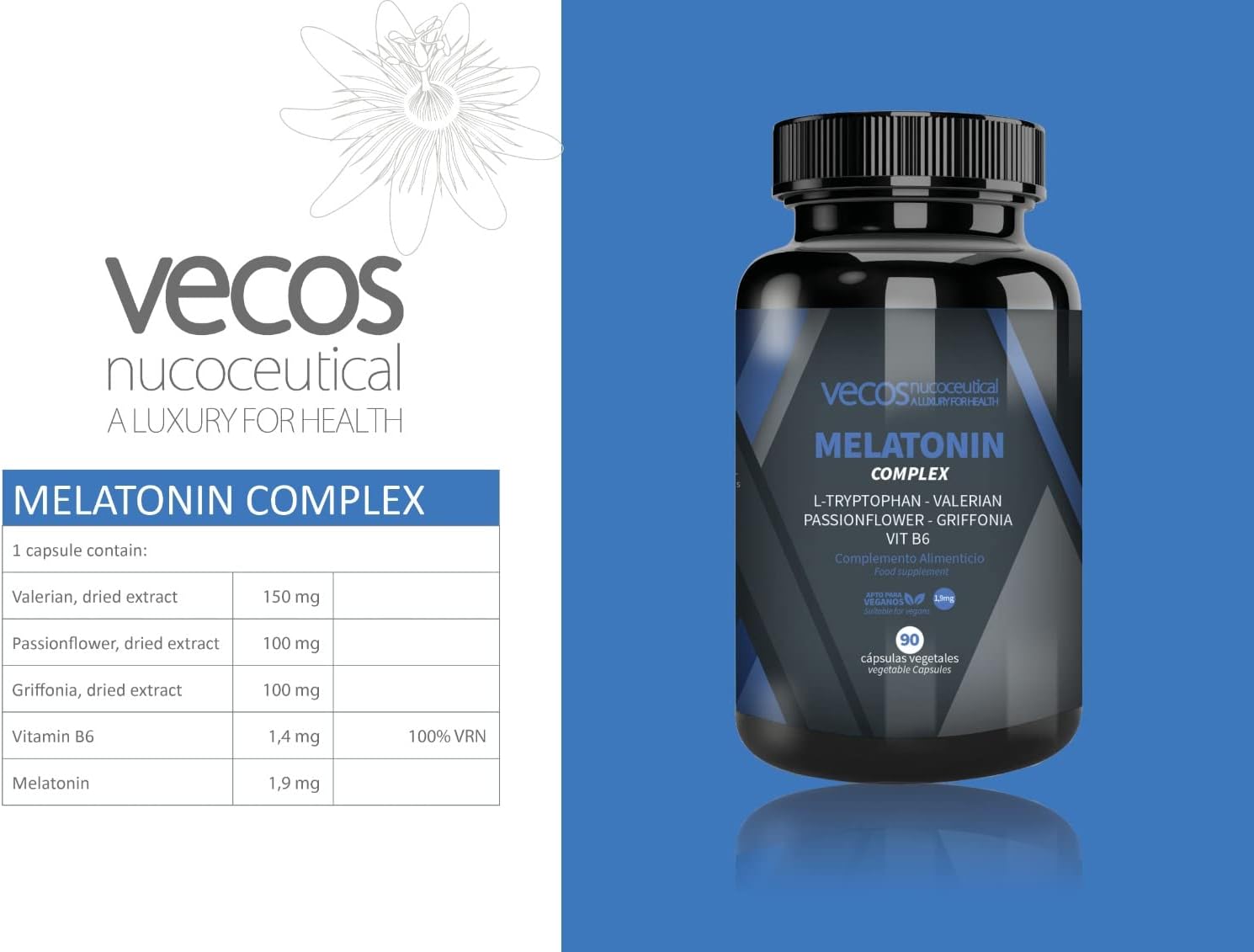 Melatonin 1.9 mg Vecos for Sleep | Supplement with L-Tryptophan, Valerian, Passionflower, Griffonia and Vitamin B6 | 90 Vegetable Capsules | 100% Vegan