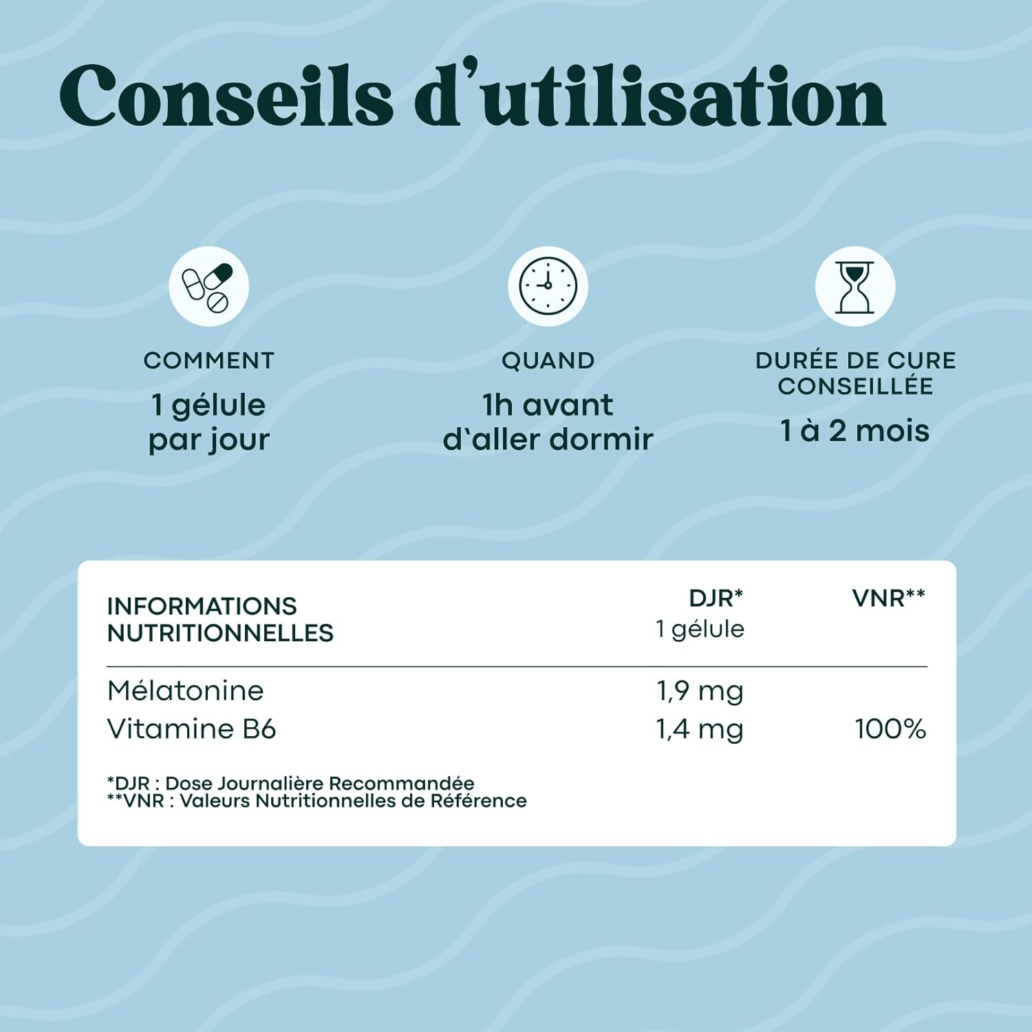 2 MONTHS OF CURE. Each practical and economical pack contains 60 easy-to-swallow capsules. With only one capsule per day, our sleep supplement allows you to do 2 months of cure.