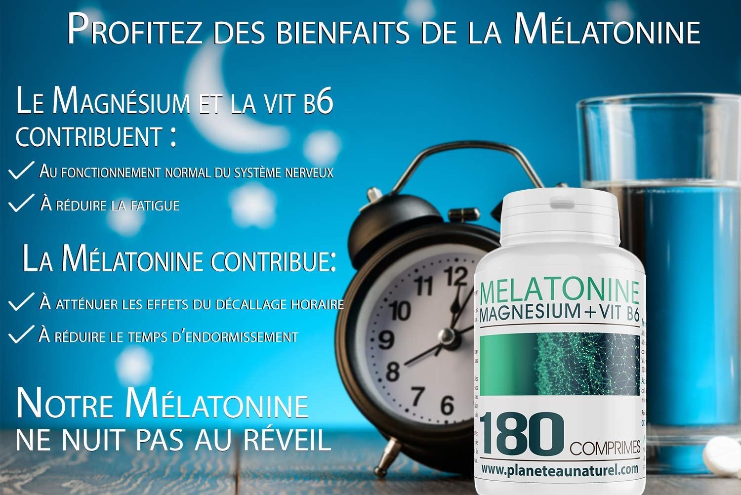 La mélatonine contribue à réduire le temps d’endormissement.La mélatonine contribue à atténuer les effets du décalage horaire.Le magnésium marin contribue à réduire la fatigue, il contribue également au fonctionnement normal du système nerveux.La vitamine B6 contribue à réduire la fatigue au fonctionnement normal du système nerveux. CONSEIL D’UTILISATION