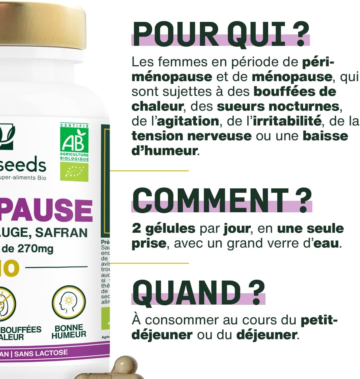 LIMITE LES BOUFFÉES DE CHALEUR : la Sauge Bio contenue dans notre formule est reconnue pour réduire les bouffées de chaleur et les sueurs nocturnes. Notre complexe Ménopause Bio est donc une solution naturelle pour soulager les désagréments liés à la ménopause, jour et nuit.ÉQUILIBRE HORMONAL : composée de Gattilier Bio, notre formule contribue à maintenir l’équilibre hormonal pendant la ménopause. Associée au Safran Bio, elle permet de stimuler le désir, qui a tendance à diminuer durant cette période.ÉQUILIBRE ÉMOTIONNEL : notre formule contient du Safran Bio, qui favorise la relaxation et le maintien d’une humeur positive. Il est reconnu pour aider à réduire l’irritabilité, la tension nerveuse et l’agitation. Cette plante vous aidera également à améliorer votre sommeil, idéal pour retrouver un bien-être physique et mental au quotidien.FORMULE COMPLÈTE, SANS HORMONES : grâce à la complémentarité des bienfaits de chaque plante, notre Complexe Ménopause Bio offre un soutien complet. Sans hormones ni phyto-œstrogènes, notre formule naturelle aide à améliorer l’équilibre hormonal, l’humeur et le confort féminin tout au long de cette période.
