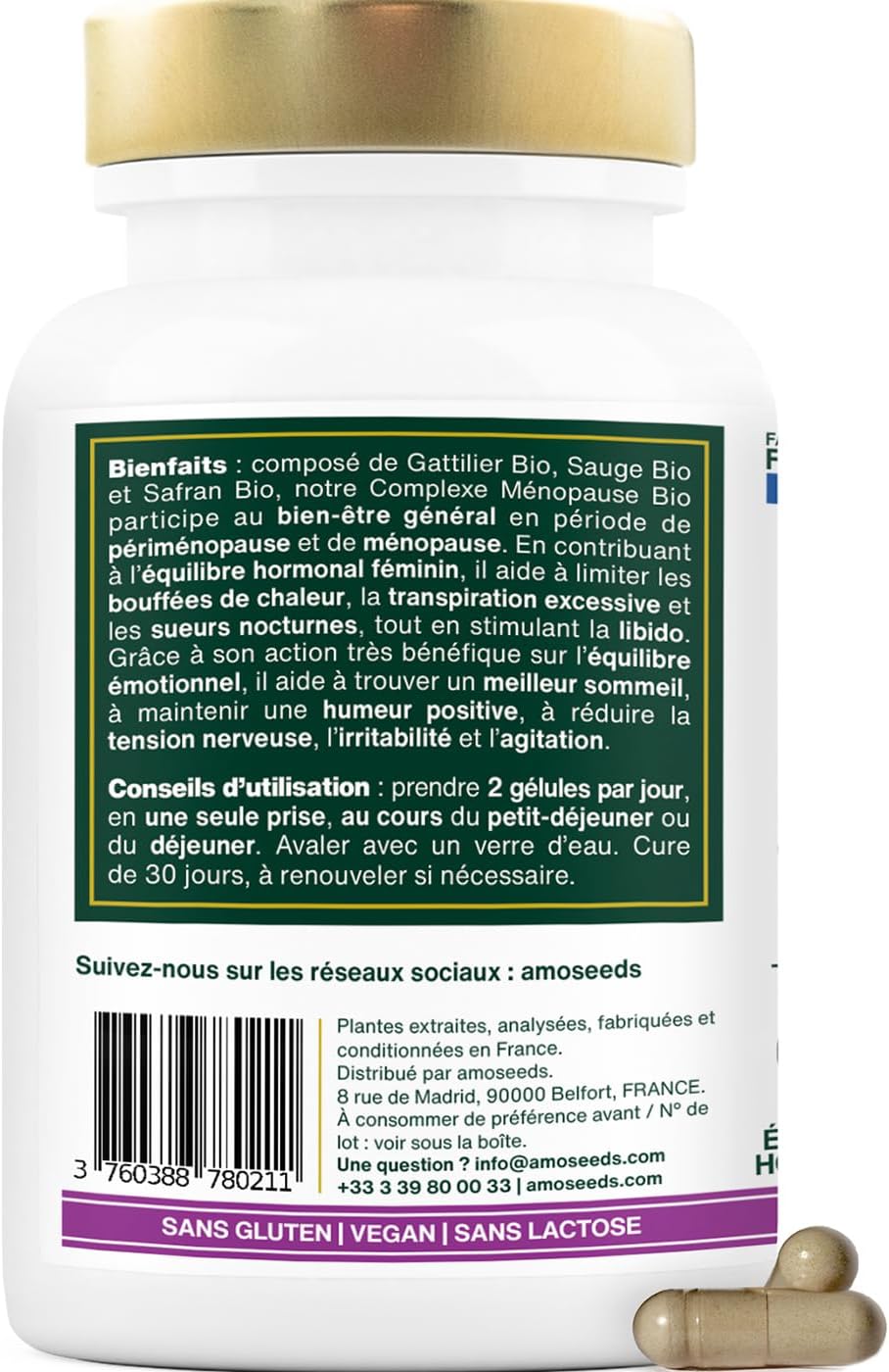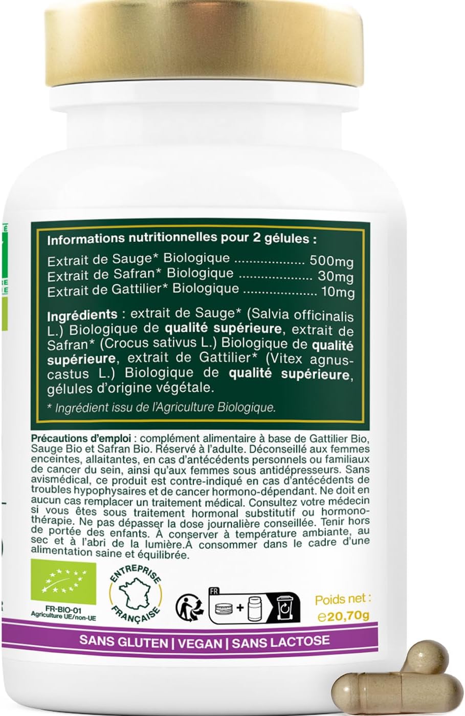 Composées d’ingrédients biologiques de qualité supérieure : Gattilier, Sauge et SafranSans hormones, OGM, conservateurs, gluten, ni lactoseNaturelles et veganFabriquées, analysées et conditionnées en France