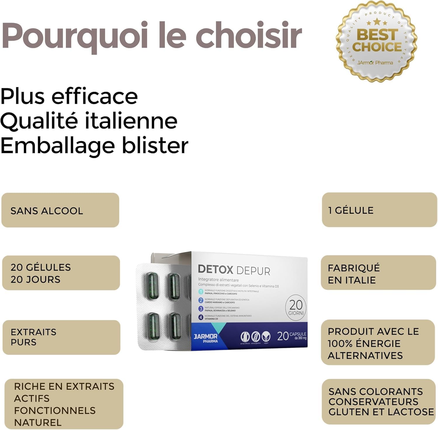 EASY TO TAKE AND INTEGRATE: With just one capsule per day, Detox Depur easily integrates into your daily routine, allowing you to benefit from a complete and natural formula for body wellbeing. The practicality of the capsules and the high quality of the ingredients make Detox Depur an ideal supplement for those who want to take care of their body in a simple and natural way, without complications