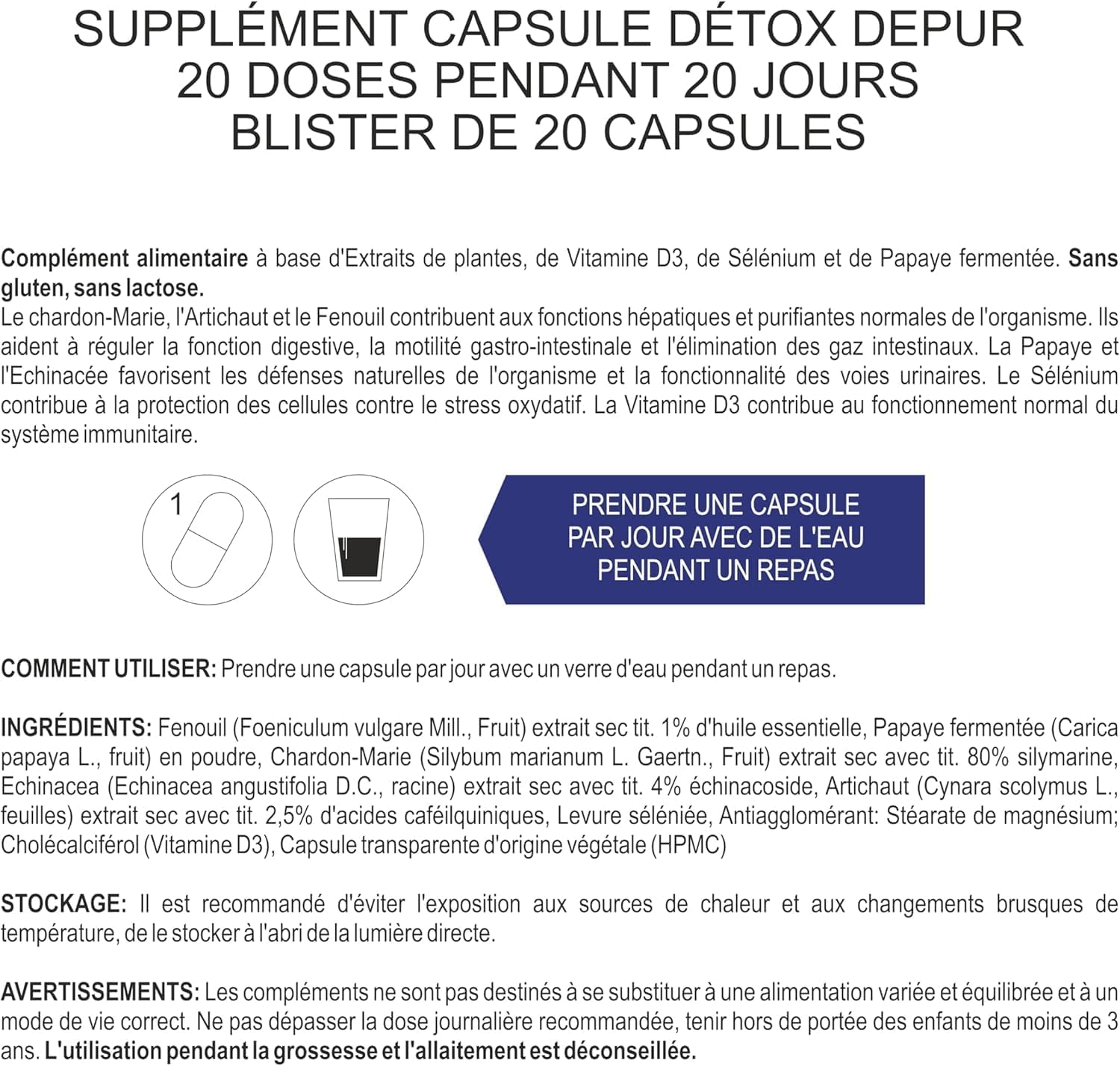 NATURAL AND COMPLETE FORMULA: Detox Depur is formulated with the highest quality ingredients, free from artificial additives, gluten or GMOs. Each capsule is designed to offer natural, comprehensive support for your well-being, making it suitable for vegans and those following a healthy, natural diet. The choice of natural ingredients ensures safe integration and without side effects, supporting the body in maintaining an optimal balance