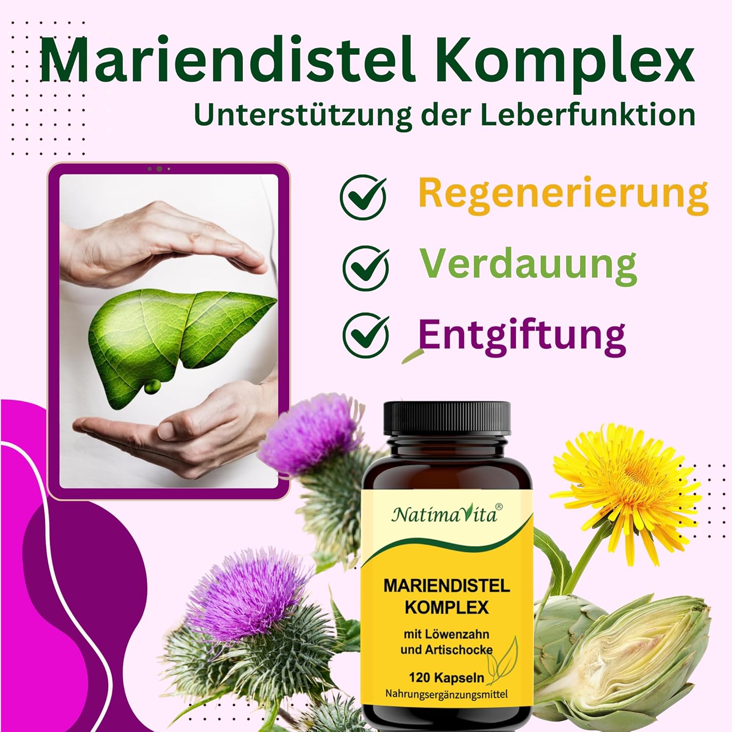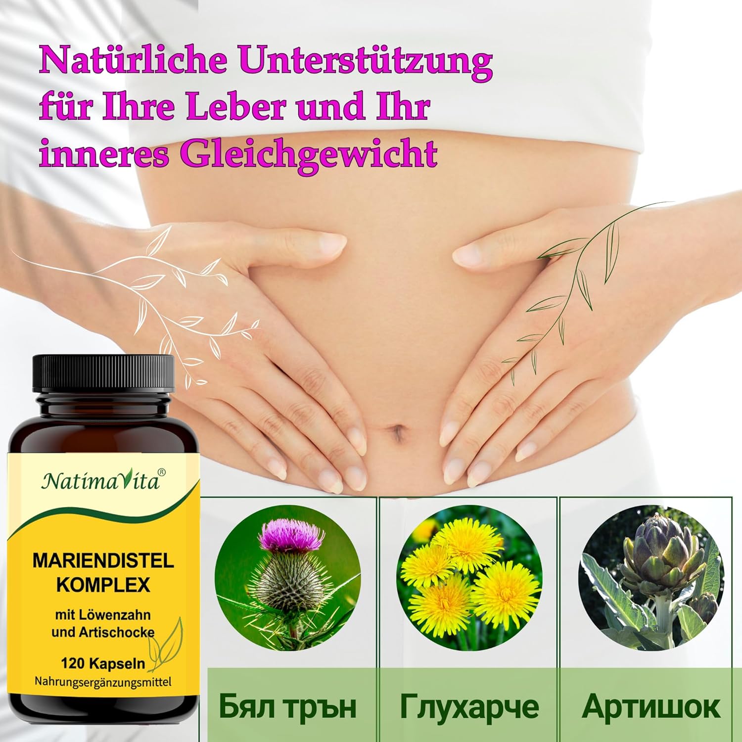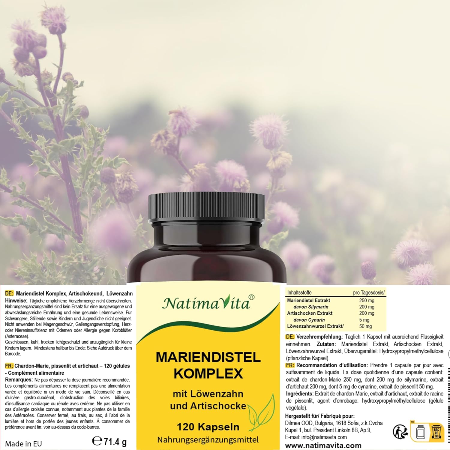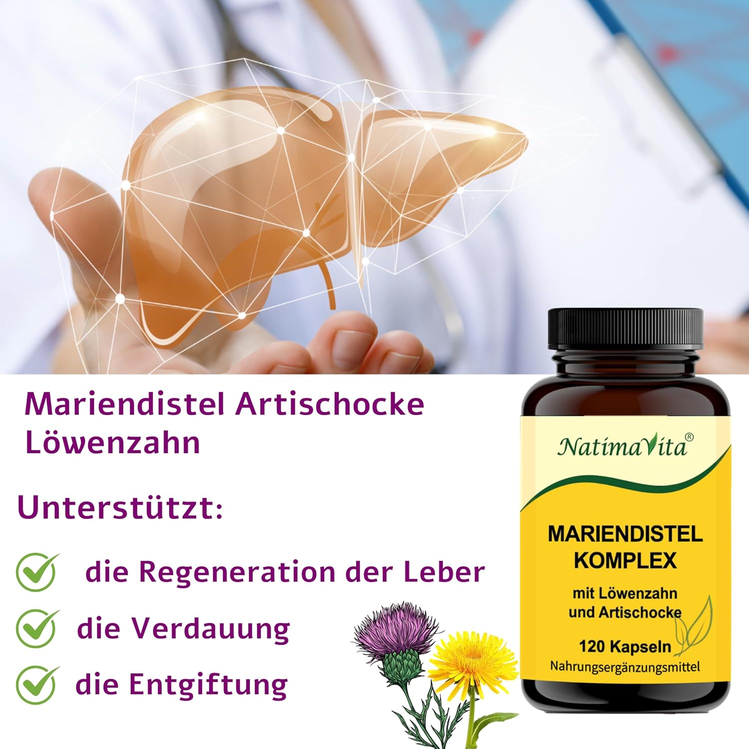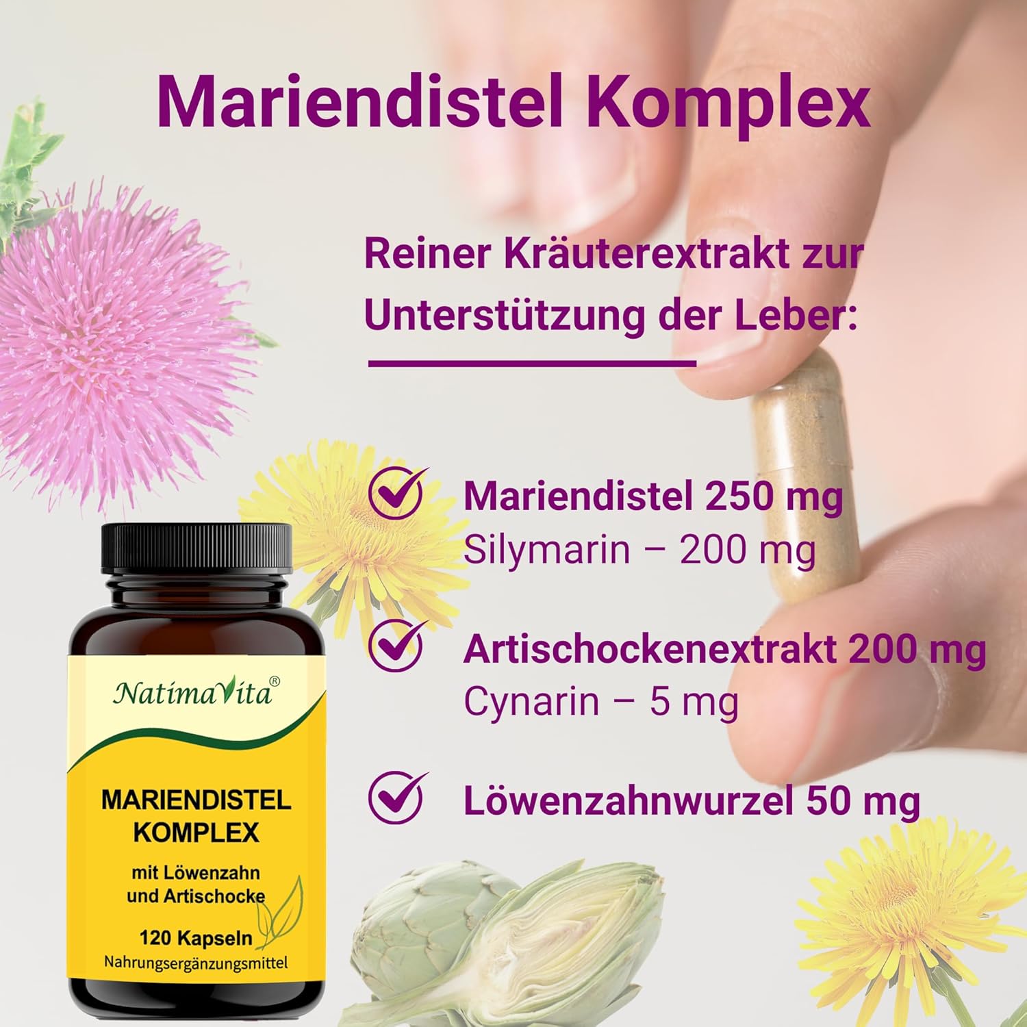 Le complexe de chardon-Marie de NatimaVita combine de précieux extraits de chardon-Marie, de racines de pissenlit et d’artichaut dans une formule de qualité supérieure. Ce mélange naturel favorise votre bien-être et soutient de manière ciblée la fonction hépatique.