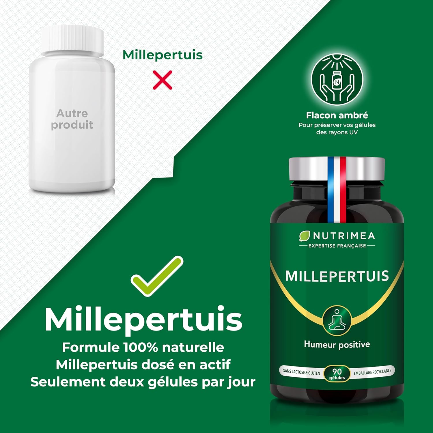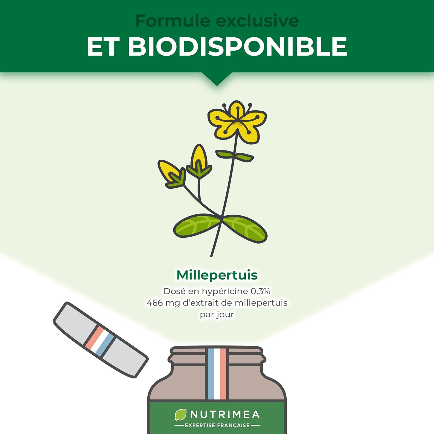 MILLEPERTUIS – Extrait Titré Hautement Concentré en Hypericine – 500mg – 100% Naturel – Anti-Déprime, Bonne Humeur, Anti-Stress & Sommeil – 90 Gélules Vegan – Nutrimea – Fabriqué en France