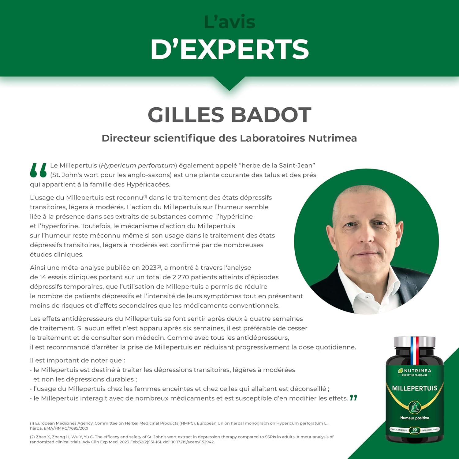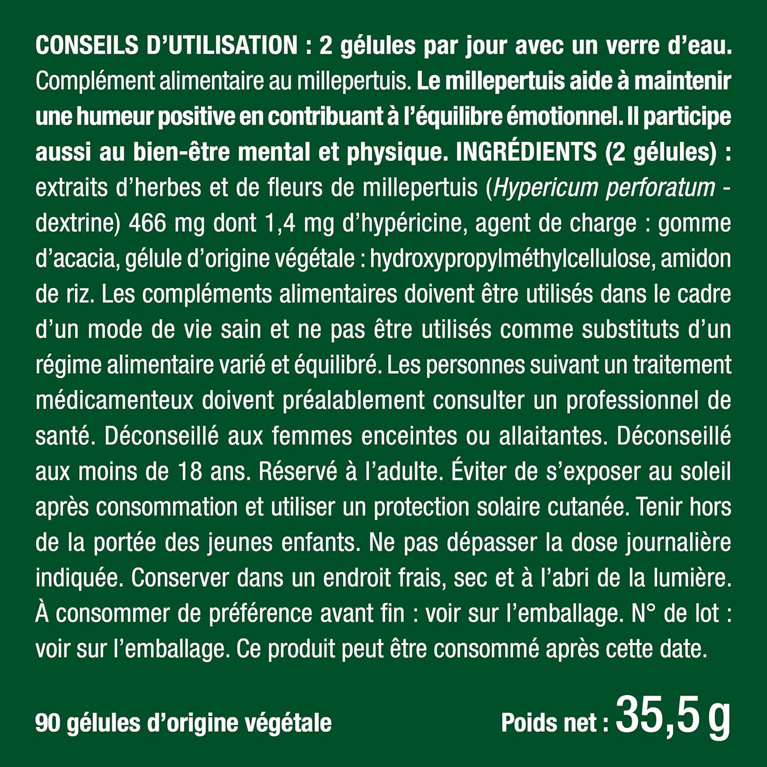 ●● FORMULE 100% NATURELLE ●● Nous avons choisi de concentrer la formule avec un actif dosé : notre extrait de millepertuis est dix fois plus concentré que de la poudre. En seulement deux gélules par jour, notre produit apporte 466 mg d’extrait, ce qui est supérieur à la moyenne du marché.