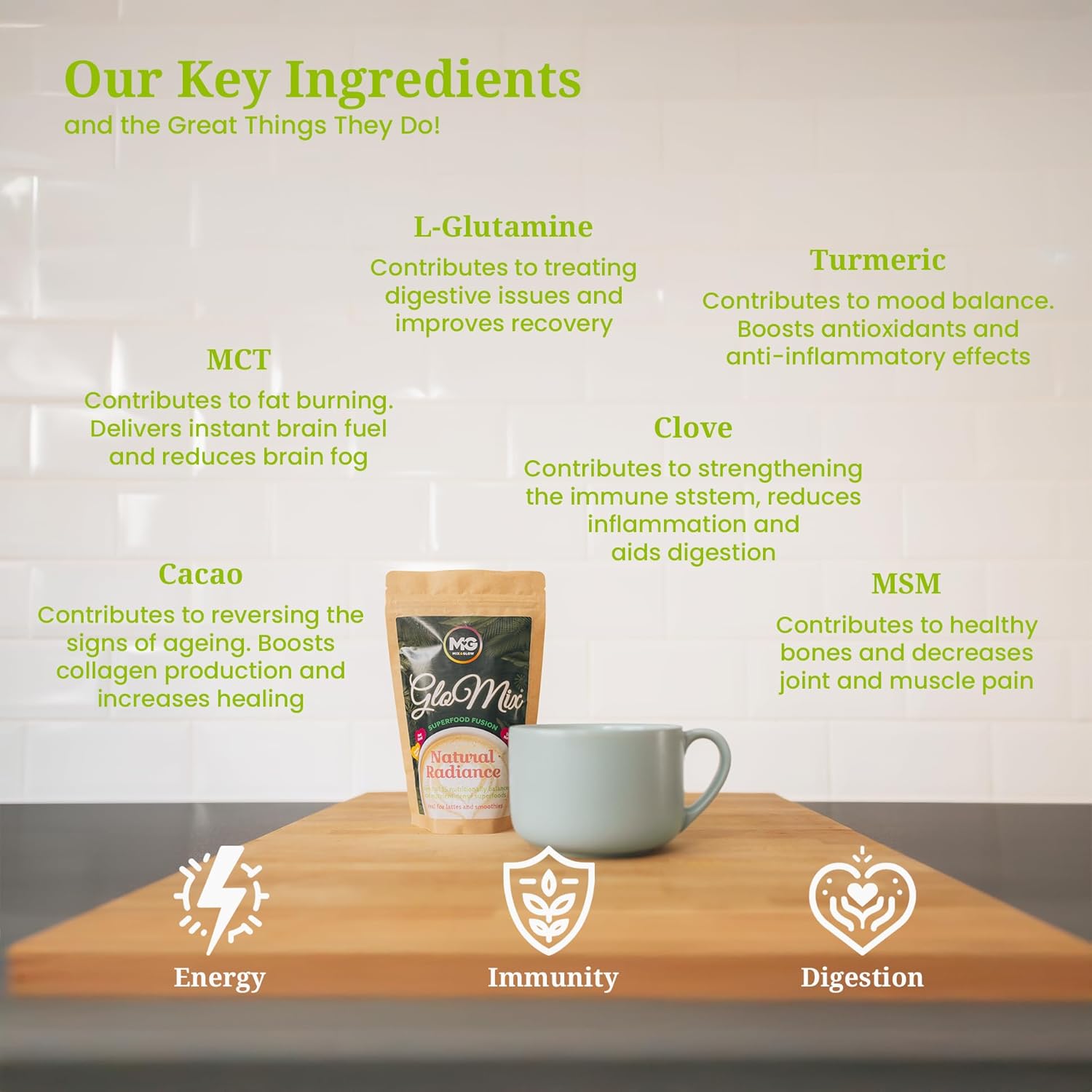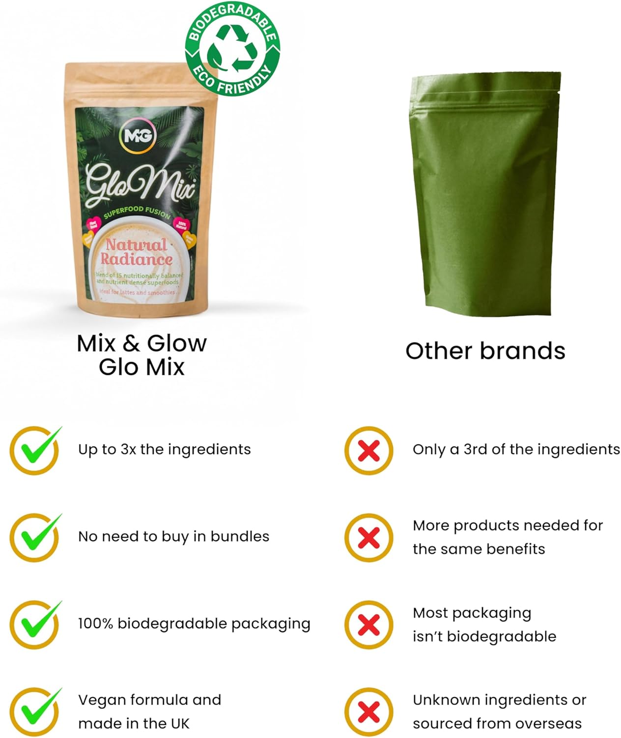 Unmatched quality | Glo Mix stands out for its dense nutrient profile. Sustainable ethically sourced ingredients and eco-friendly packaging ensure nature’s best in every spoon. We appreciate contributing to a healthier planet.
