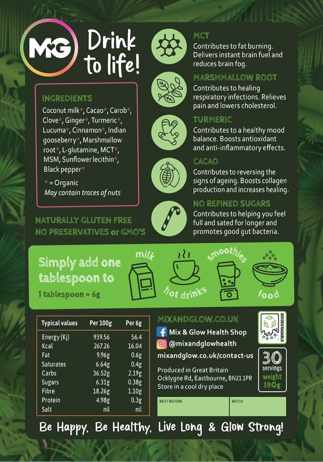 Mix & Glow – Vegan superfood powder, prebiotic blend of 15 advanced herbs, greens and adaptogens including turmeric, ginger, cocoa and MCT oil for fuel