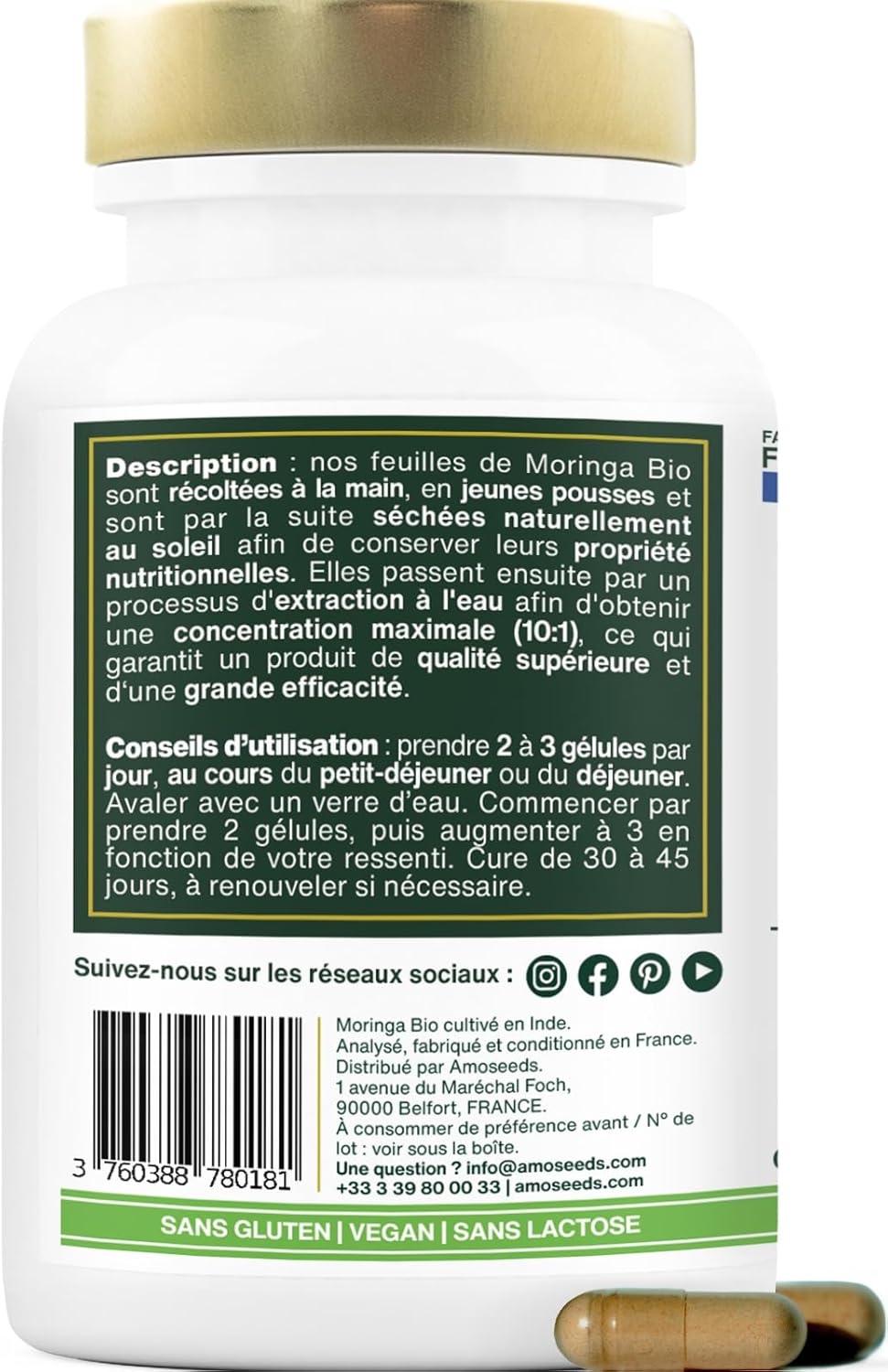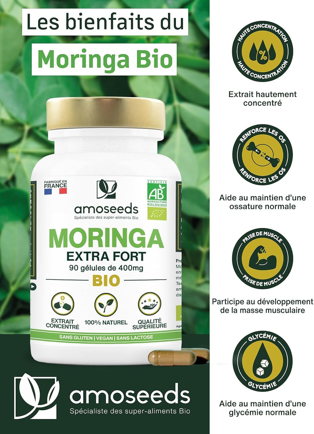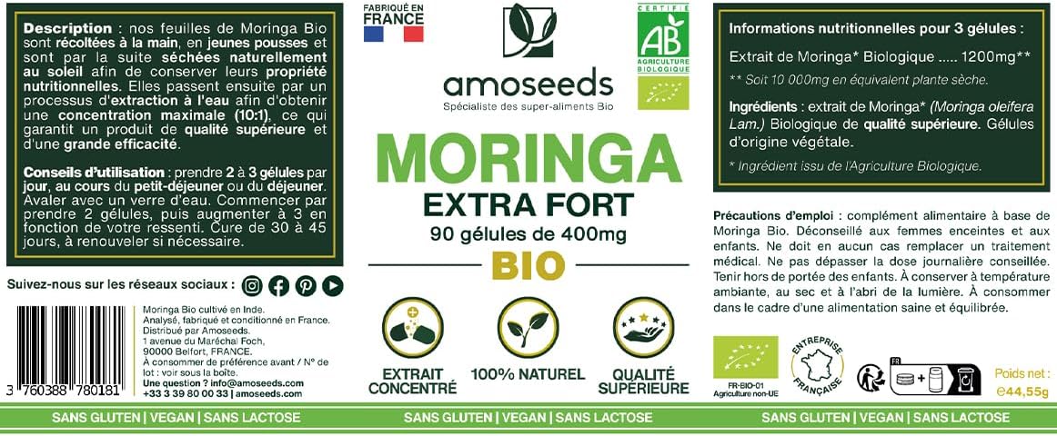 ✅ ORGANIC CERTIFIED: Recyclable resealable box of 90 capsules of 400mg of organic Moringa leaf extract of superior quality amoseeds. 100% pure, vegan, no additives, no preservatives, no GMOs, no pesticides, no artificial colours, gluten free and lactose free. Each batch is tested by third parties to ensure quality and purity. Product analyzed, manufactured and packaged in France.