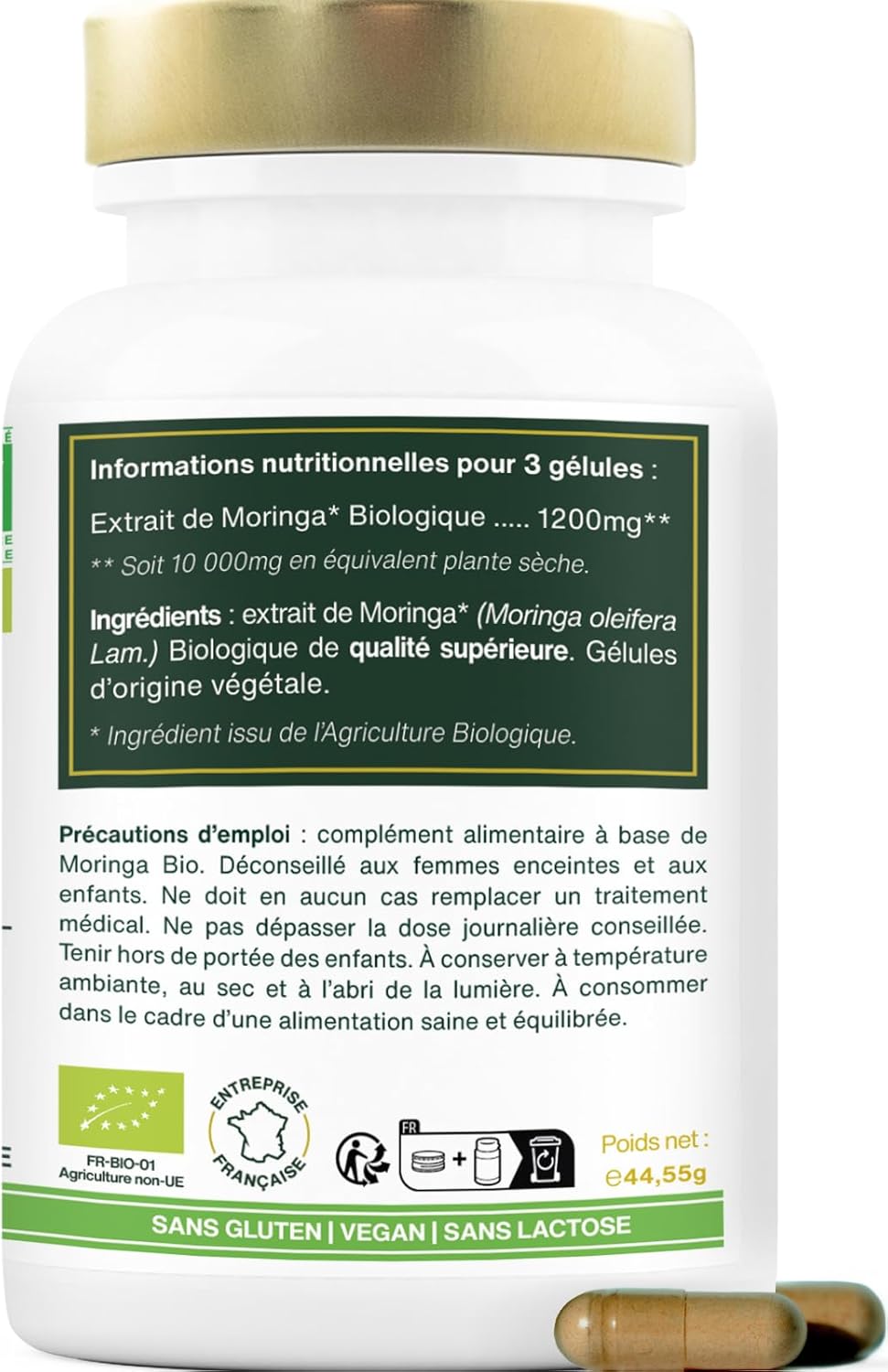 SANTÉ GLOBALE : le Moringa Bio est aujourd’hui reconnu pour sa capacité à réguler les niveaux de sucre dans le sang, ce qui le rend idéal en cas de repas copieux, lors des périodes de fêtes ou au quotidien pour soutenir sa santé globale.JEUNES POUSSES DE MORINGA OLEIFERA : notre extrait est issu de jeunes pousses de Moringa Oleifera Bio soigneusement sélectionnées et récoltées à la main. Séchées naturellement à basse température, elles préservent toutes leurs propriétés nutritionnelles pour une efficacité optimale.EXTRAIT DE HAUTE QUALITÉ : hautement concentré (10:1), notre extrait de Moringa Bio est obtenu par un procédé d’extraction à l’eau, sans solvants chimiques. Nous vous garantissons un produit d’une grande pureté avec une concentration maximale en nutriments.HAUTE EFFICACITÉ, FACILE À CONSOMMER : nos gélules de Moringa Bio offrent une alternative pratique à la poudre, avec les mêmes bienfaits nutritionnels. En une prise simple et rapide, elles permettent de profiter d’un extrait puissant dans un format compact.