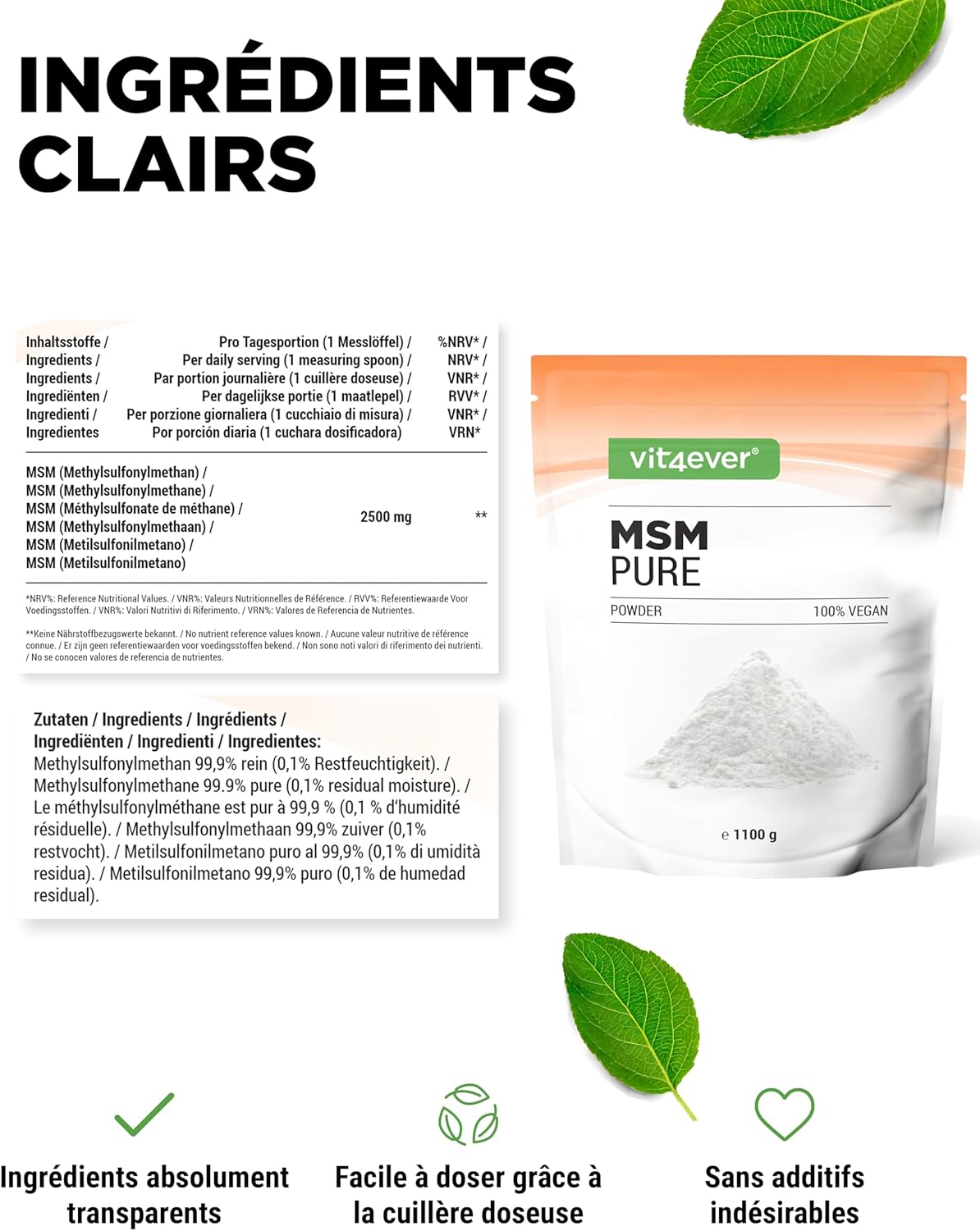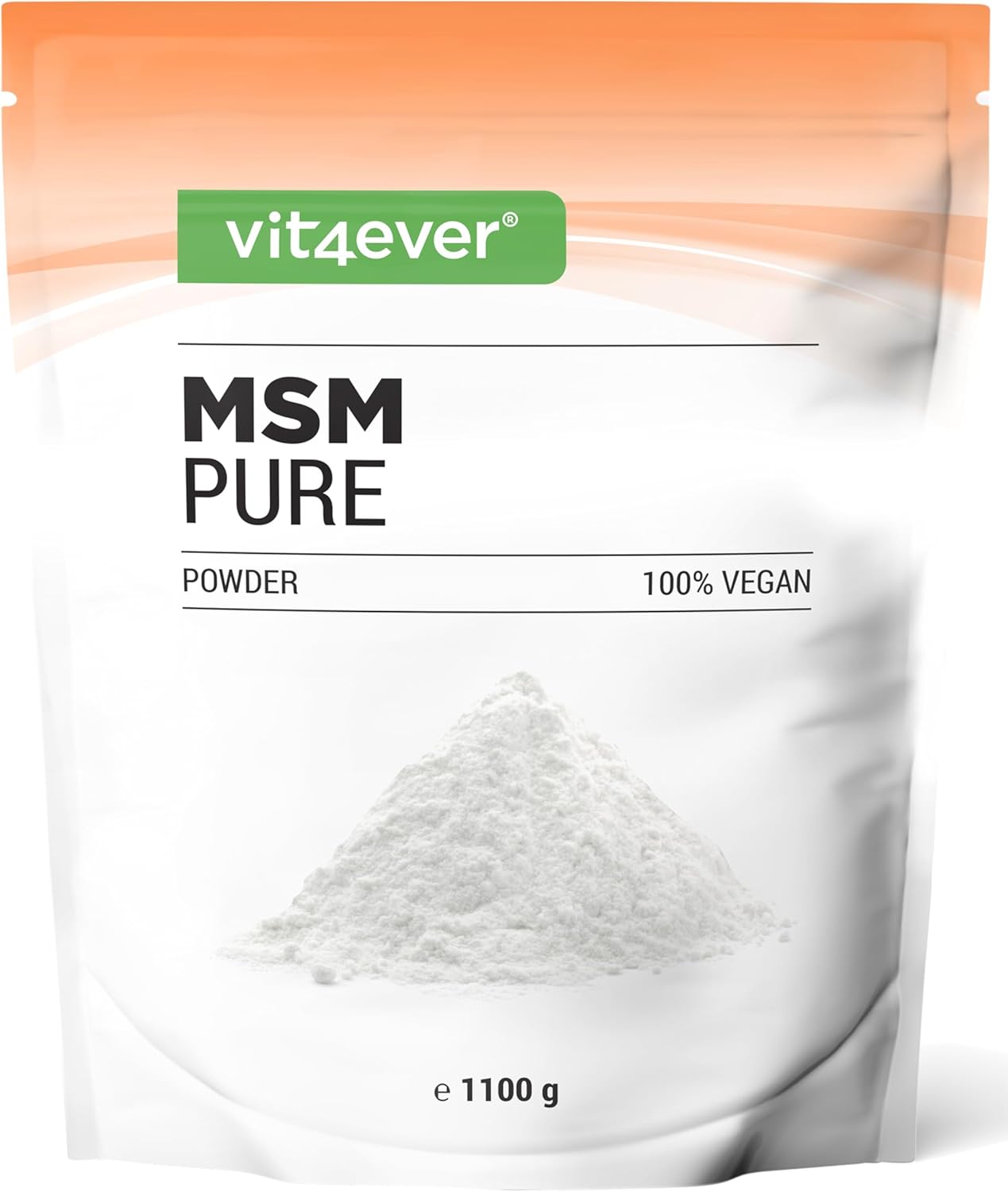 Excellent price/performance ratio: MSM fine powder in a resealable bag of 1.1 kg / 1100 g. Approximately 440 daily servings of 2500mg each. The supplied measuring spoon makes it easy to dose the methylsulfonylmethane powder.