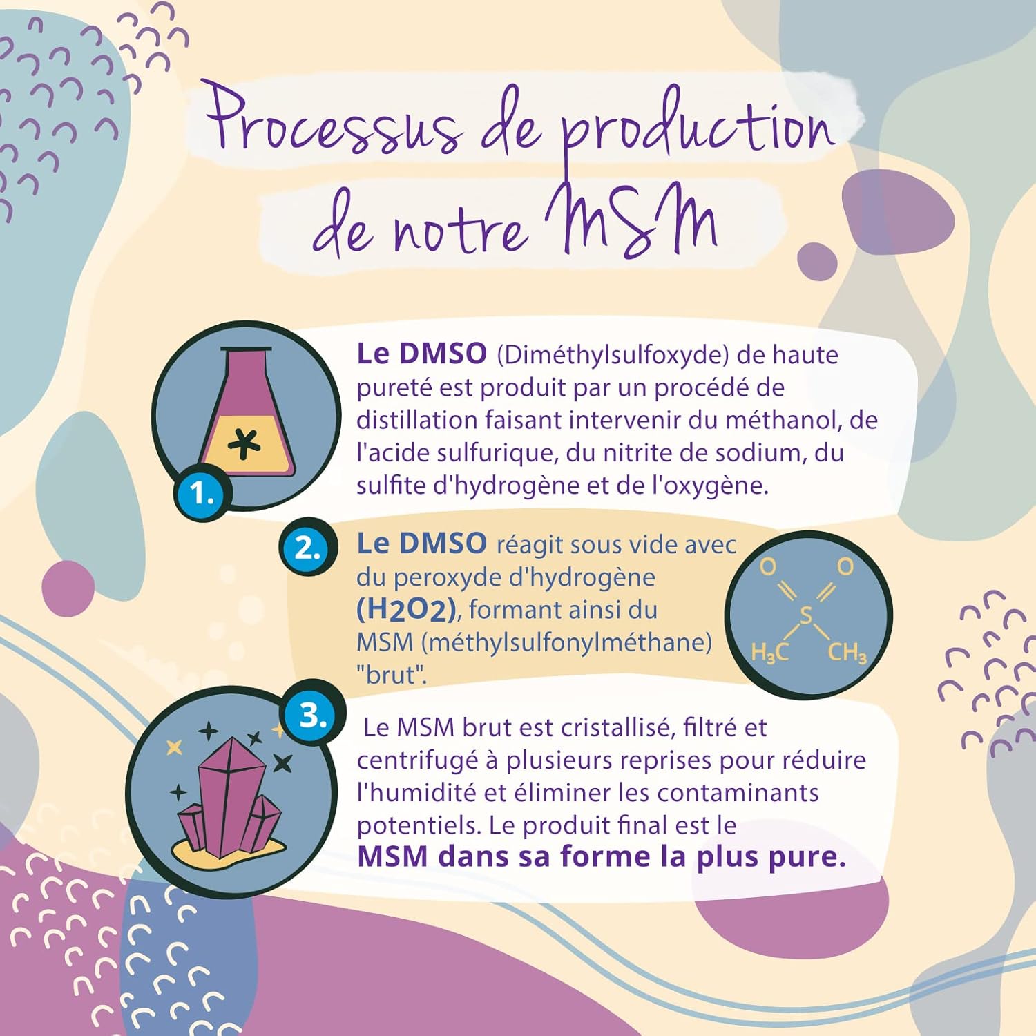 No additives: In order to ensure the quality of our food supplement of MSM methylsulfonylmethane, we have it regularly tested to avoid contamination and check the sulfur content. Our product does not contain any additives like magnesium stearate, which is often added to other anti-inflammatory and pain supplements such as glucosamine chondroitin MSM. Per bottle: 365 capsules. Recommended dosage: 3 capsules per day.