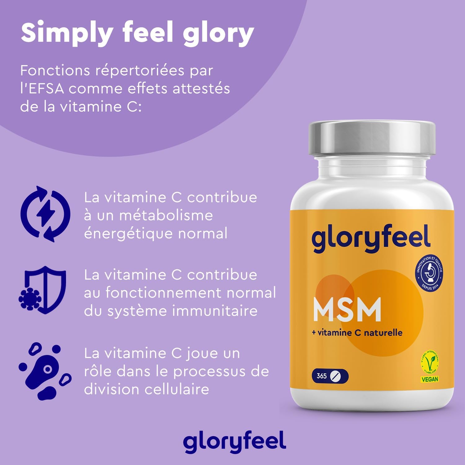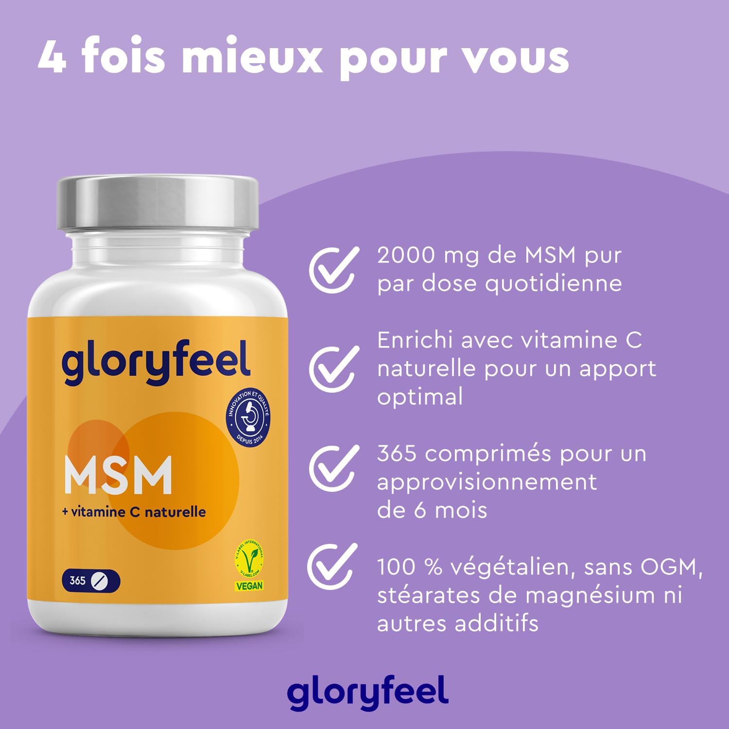 L’abréviation MSM signifie Metyhsulfonylmethane. Il s’agit d’un composé organique du soufre. Le soufre organique est cinq fois plus présent dans ton organisme que le magnésium et est un matériau de construction important pour le collagène et la kératine. Votre corps ne produit pas lui-même de soufre, c’est pourquoi il doit être absorbé via l’alimentation. De plus, dans les articulations, ce que l’on appelle la “synovie” est composée en grande partie de soufre. Nos comprimés sont fortement dosés avec 2.000mg de MSM pur par dose journalière. De plus, nos comprimés sont enrichis en vitamine C naturelle issue de l’acérola. La vitamine C contribue entre autres à un fonctionnement normal du système immunitaire.* Il peut être difficile de couvrir les besoins naturels par l’apport alimentaire, surtout pour les personnes suivant un régime végétalien.