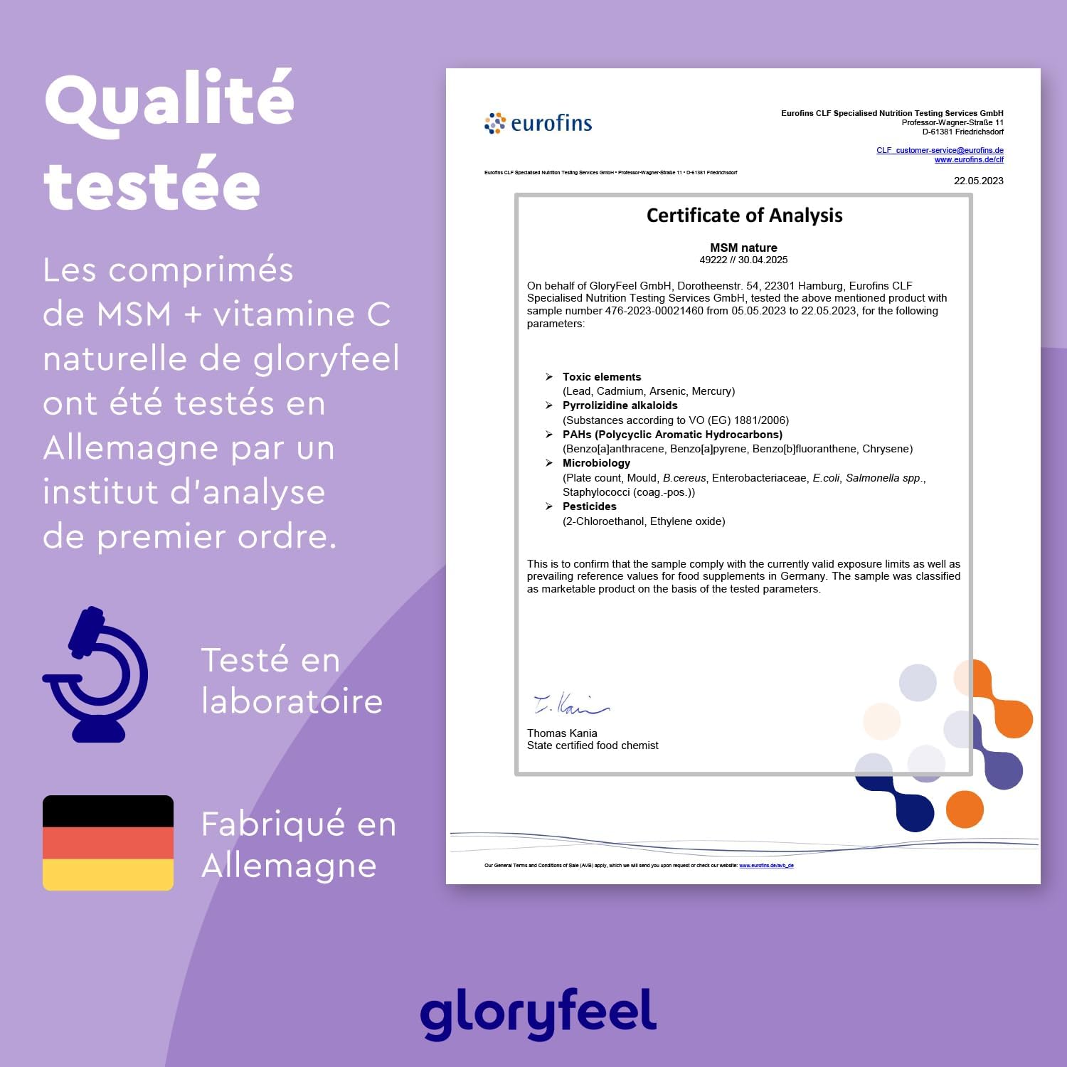 PREMIUM QUALITY LABORATORY TESTED ‣ 100% VEGAN – Our MSM tablets are complete without additives – only pure MSM powder and acerola extract! Tested by a German laboratory certified according to DIN EN ISO/IEC 17025. In addition, we regularly check purity, safety, quality and the absence of harmful substances by independent accredited testing laboratories (see product images).