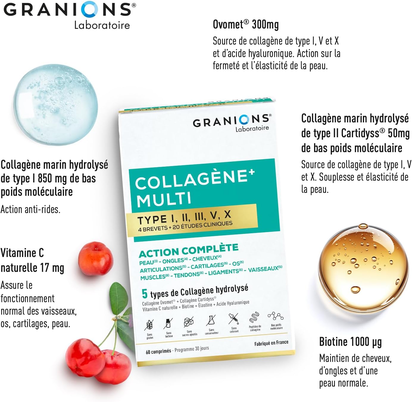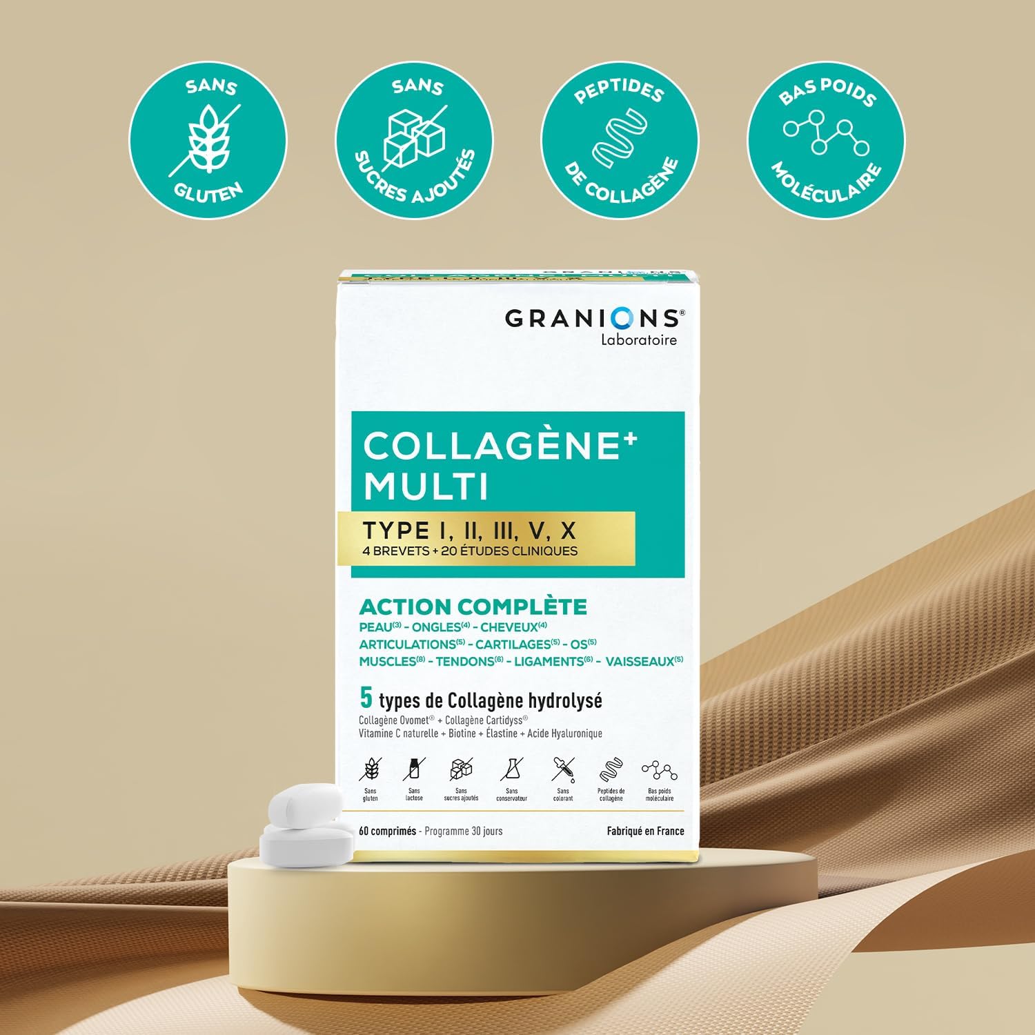 MULTI Collagen – 5 Types of Collagen – GRANIONS Collagen N°1 in Pharmacies – Marine Collagene, Collagen Type 2 – Vitamin C and Hyaluronic Acid – 20 Clinical Studies – 60 Tablets = 1 Month