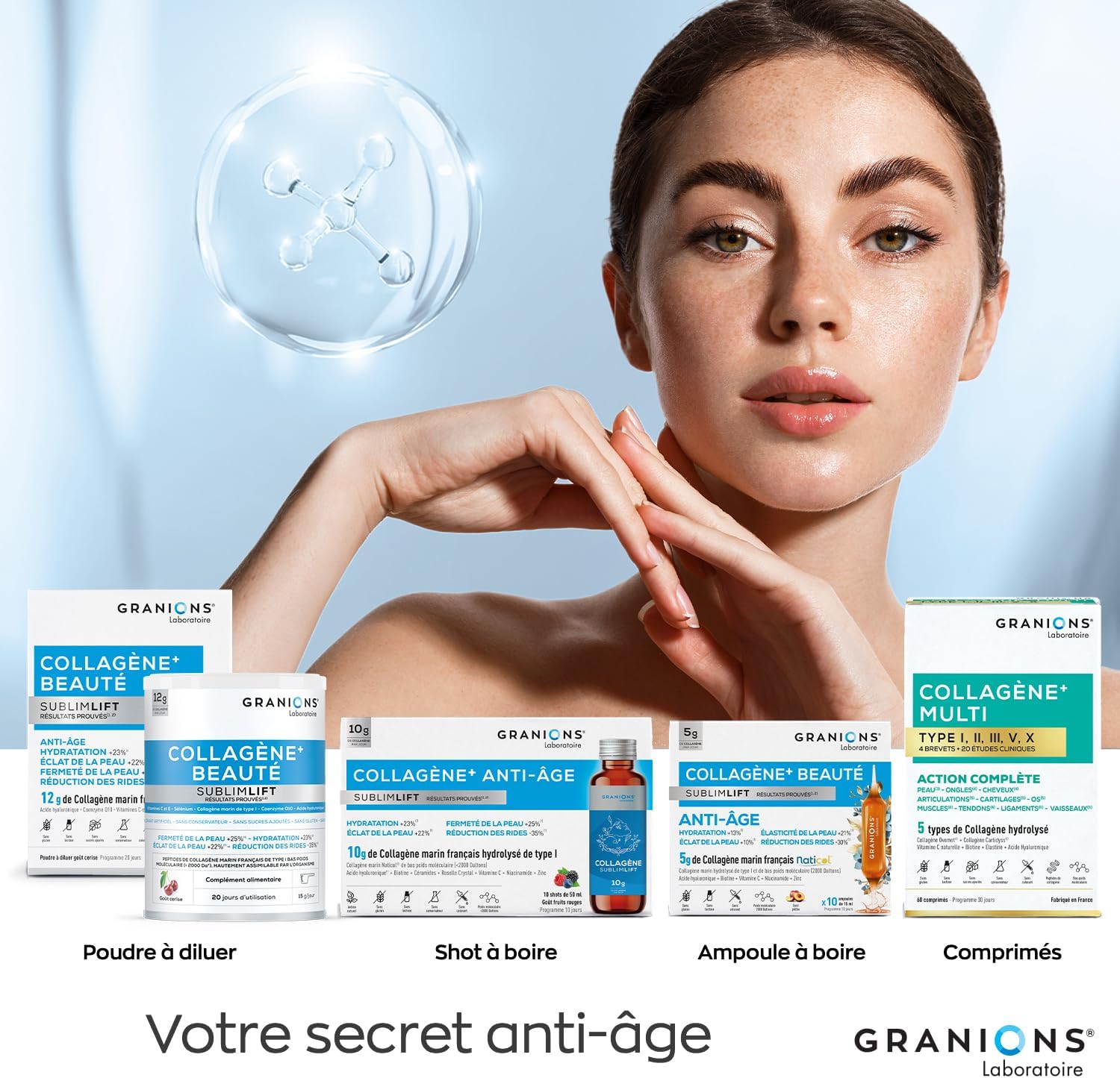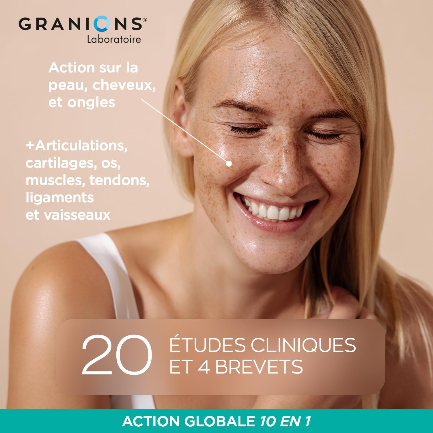 Discover the synergistic complex developed by Le Laboratoire des Granions: an innovative blend of 5 types of collagen, mainly comprising hydrolyzed marine collagen of low molecular weight (<2000 Daltons). Enriched with vitamins (Vitamin C), minerals and biotin, this supplement offers a complete action to support the overall health of the body. Enjoy the benefits of collagen for skin, joints and hair, while boosting muscle vitality and bone health. Hydrolyzed marine collagen is formulated for optimal assimilation, ensuring maximum effectiveness. Vitamins and minerals, including Vitamin C, promote normal collagen formation, increasing the benefits of marine collagen. This supplement, rich in collagen, marine collagen and hyaluronic acid, is ideal for those looking to improve their skin, joint and hair health. Marine collagen, combined with biotin, supports hair and nail health, while collagen proteins strengthen muscles and bones. By incorporating this collagen supplement into your daily routine, you can expect visible and long-lasting results, thanks to the power of collagen and hyaluronic acid. Granions Laboratory has developed this collagen complex to offer a complete and effective solution to meet your body's needs for collagen and hyaluronic acid.