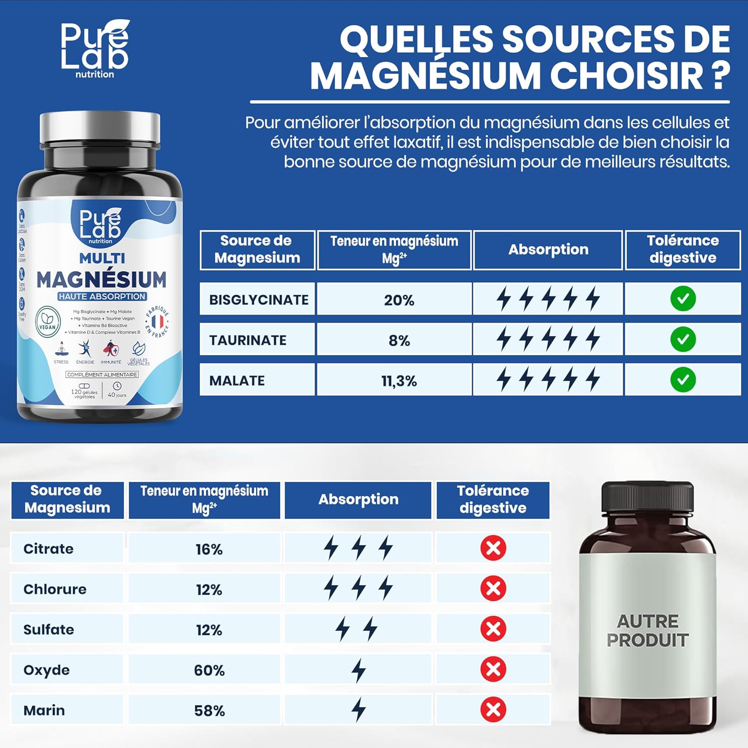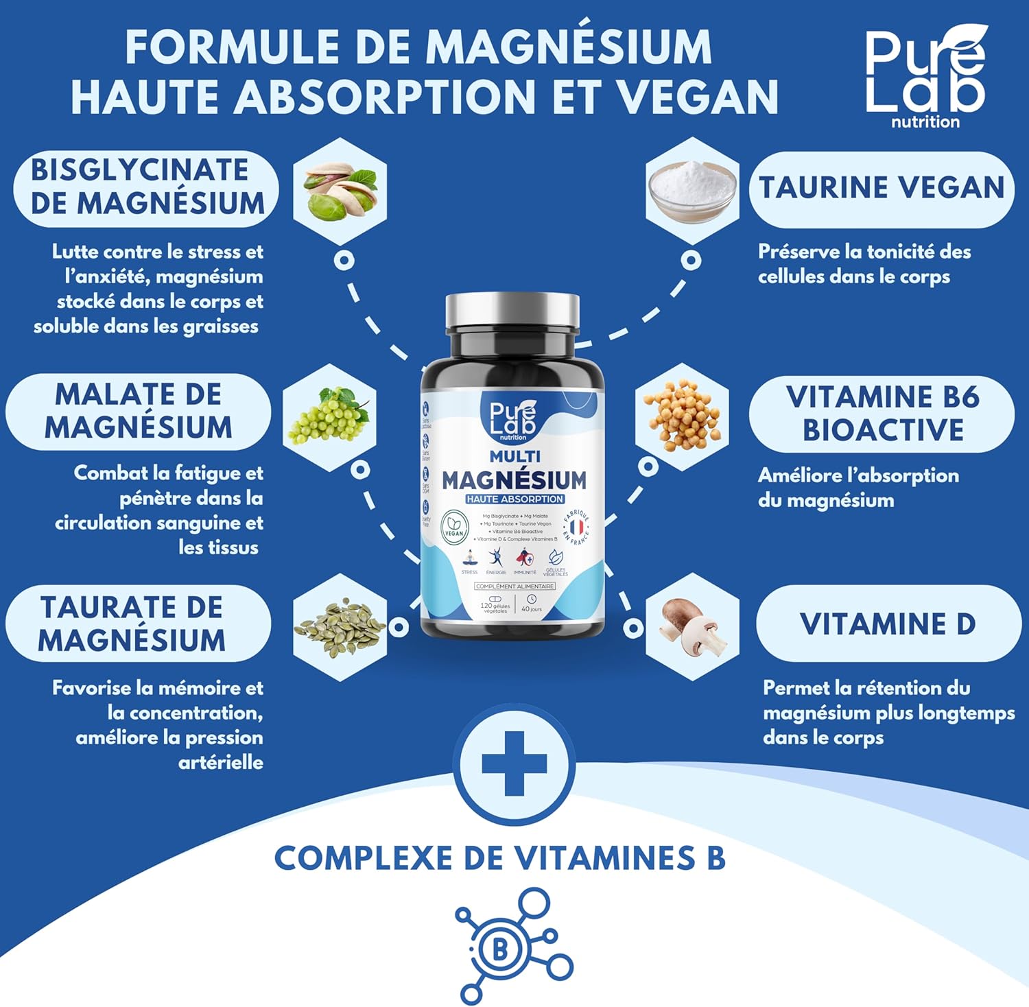 Multi Magnesium – Bisglycinate, Taurinate, Malate + Vegan Taurine + Bioactive Vitamins B6, D, B-Complex – Fatigue & Stress – High Absorption – 120 Vegan Capsules, 40 Day Cure – Pure Lab Nutrition®