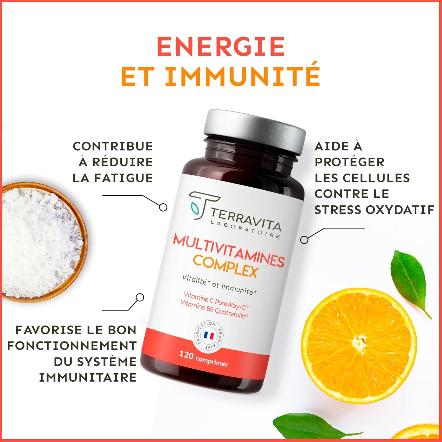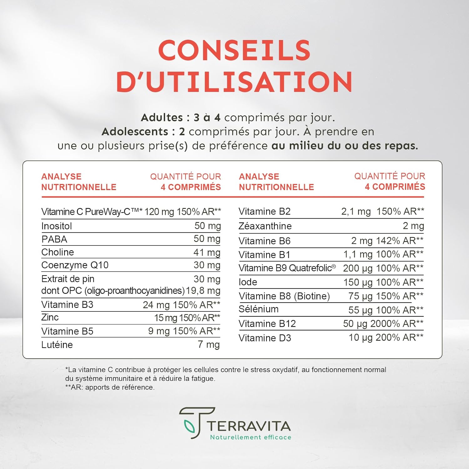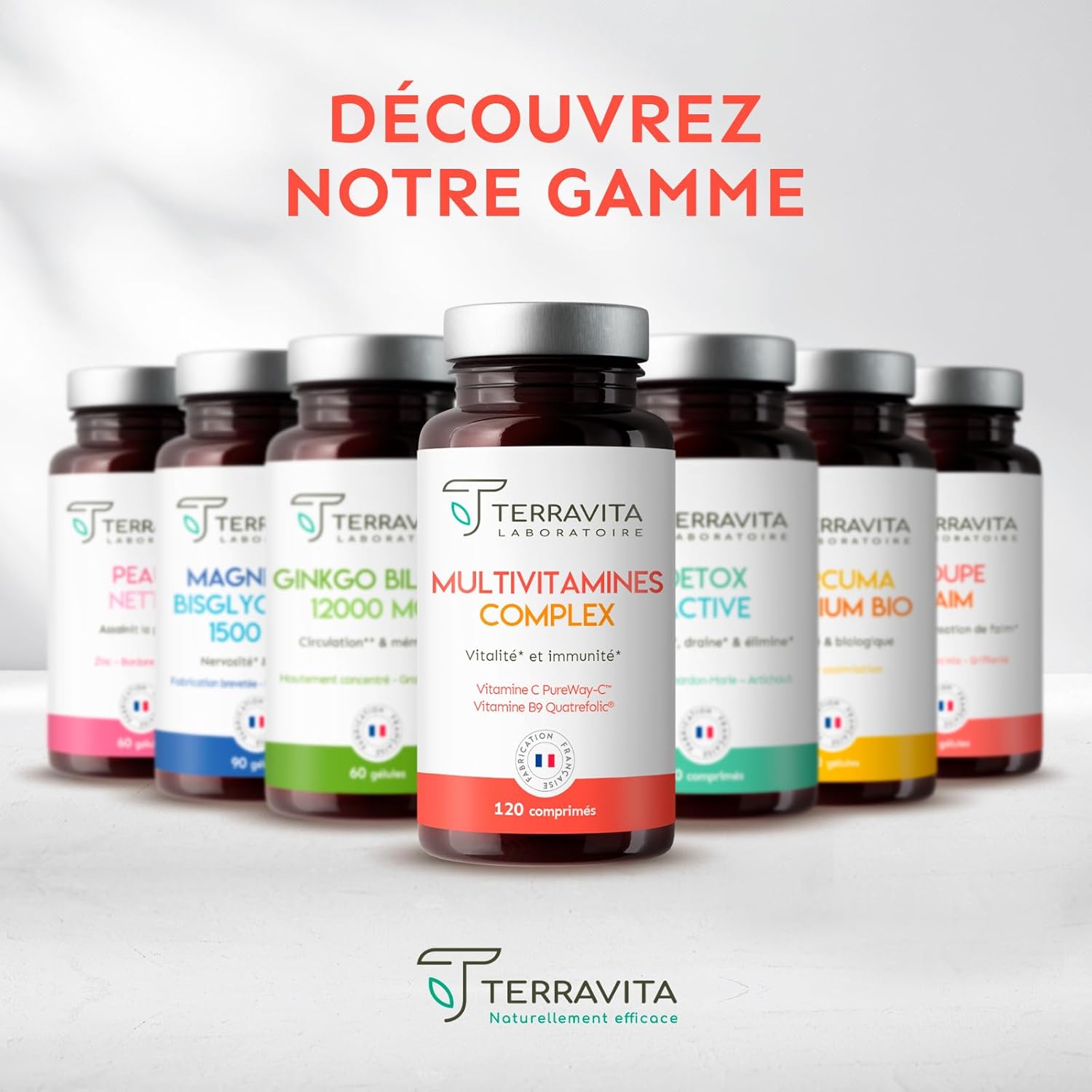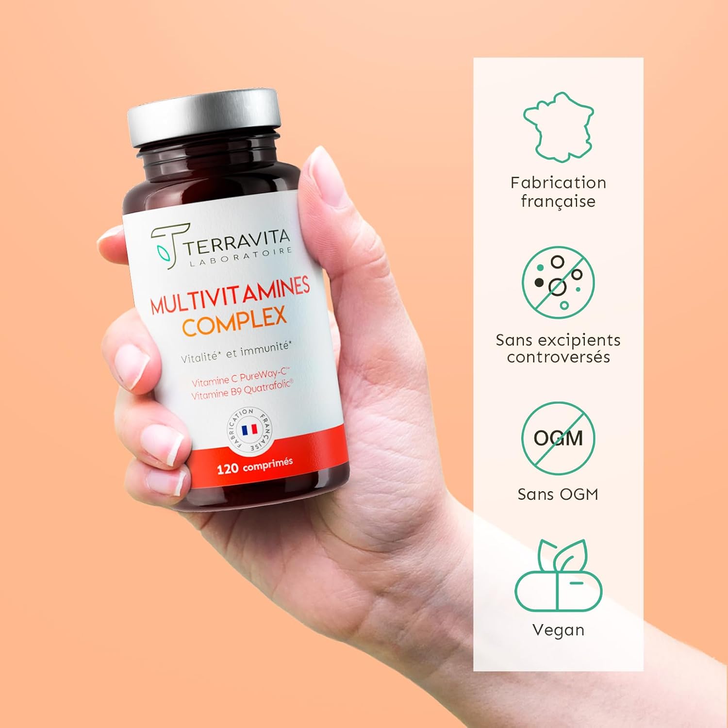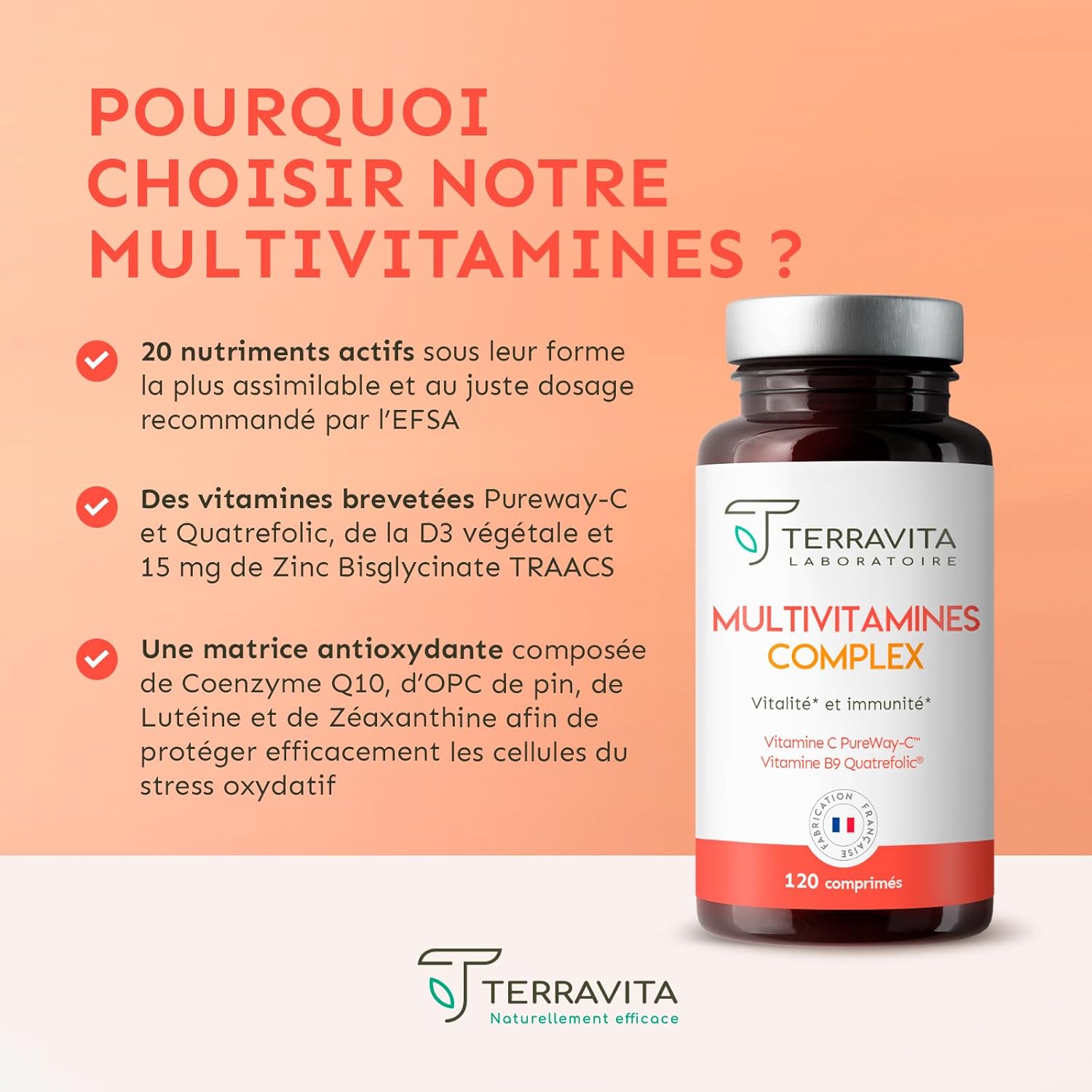 MULTIVITAMINS and Minerals 20 Nutrients | All Essential Vitamins including B9 B12 C D3 + Minerals including Zinc Bisglycinate + Antioxidants and Iodine | 120 Tablets | Made in France | Terravita