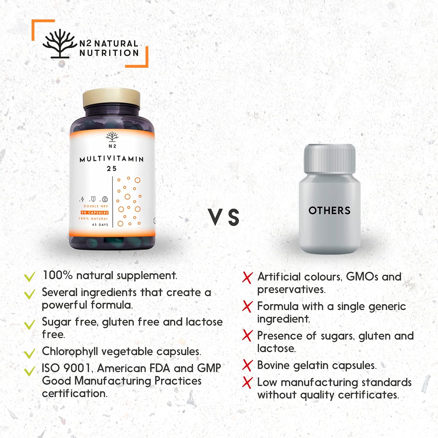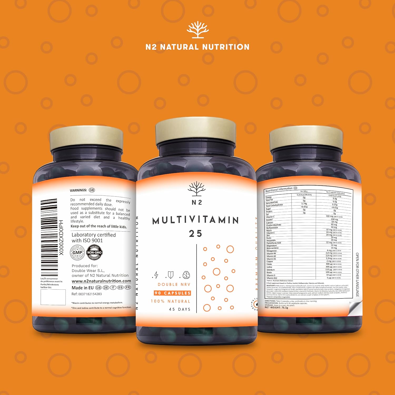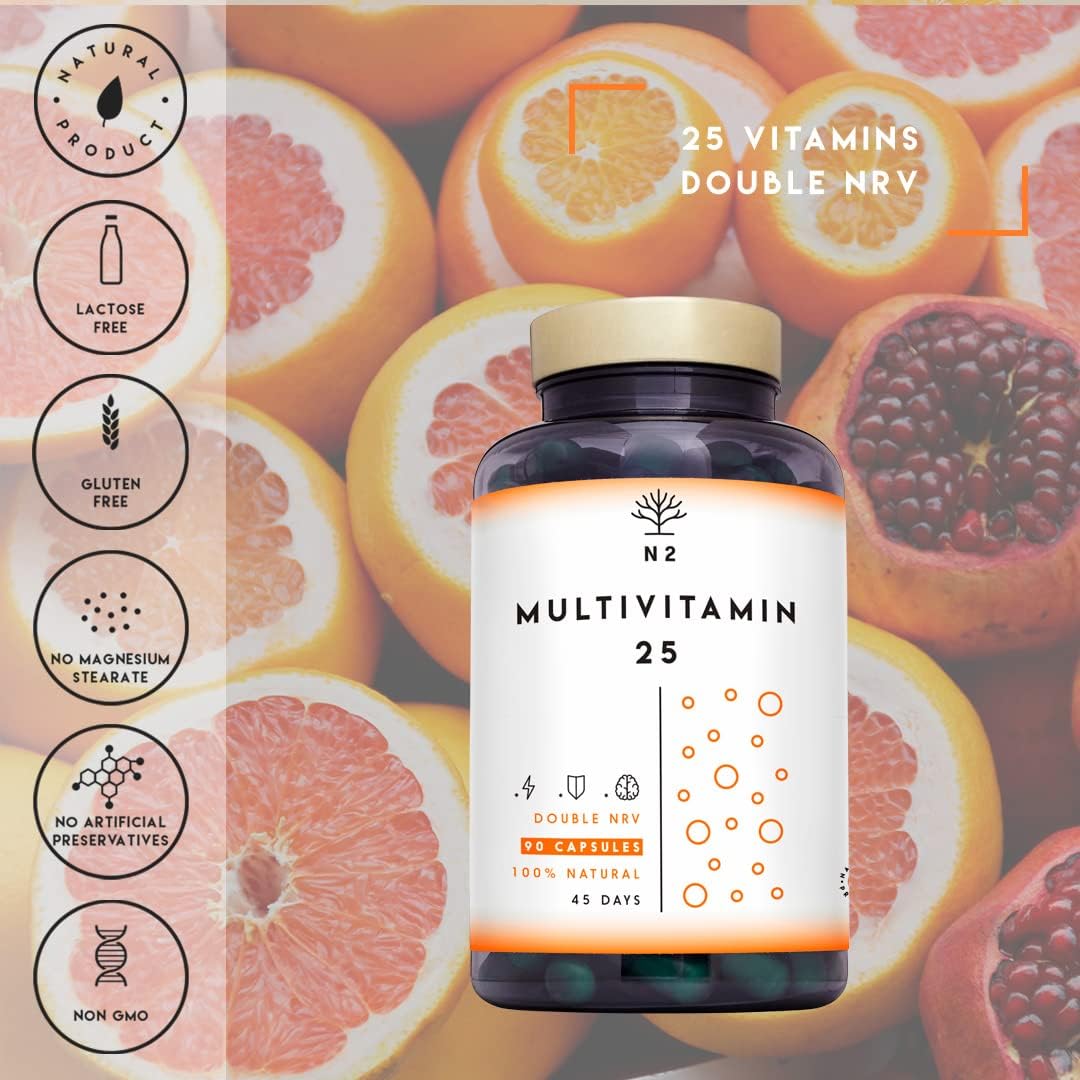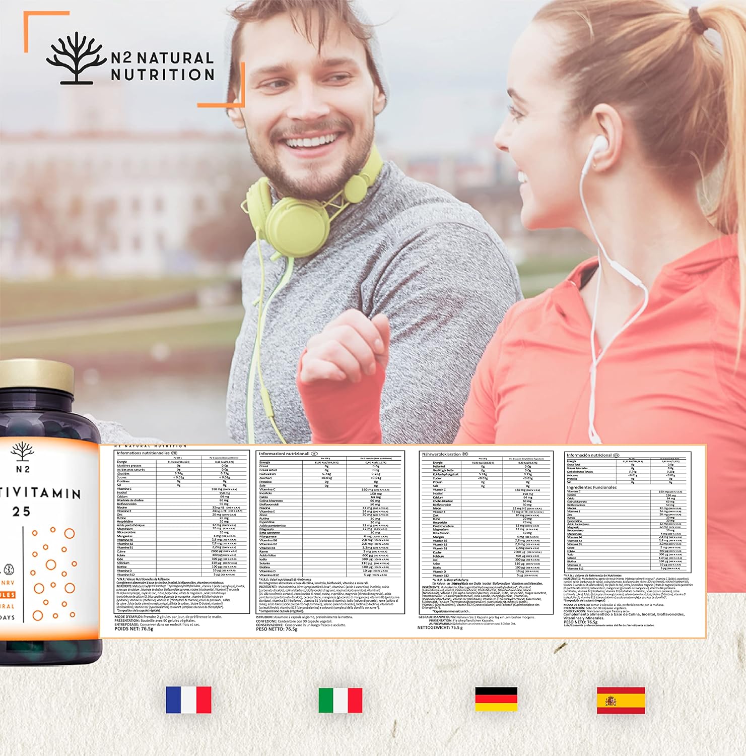 🥇 UNIQUE FORMULA WITH 25 VITAMINS AND MINERALS: The natural multivitamin supplement from N2 Natural Nutrition also contains vitamins B1, B2, B6, B12, biotin and vitamins C, D and E. It includes calcium, zinc, copper, magnesium, manganese, potassium, selenium, inositol, choline, bioflavonoï beta-carotene, rutin and hesperidin.