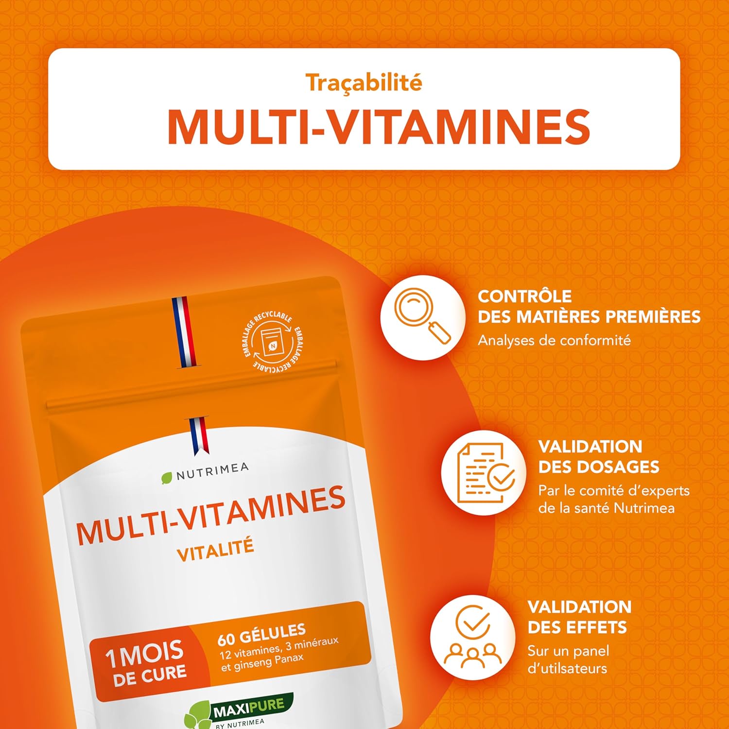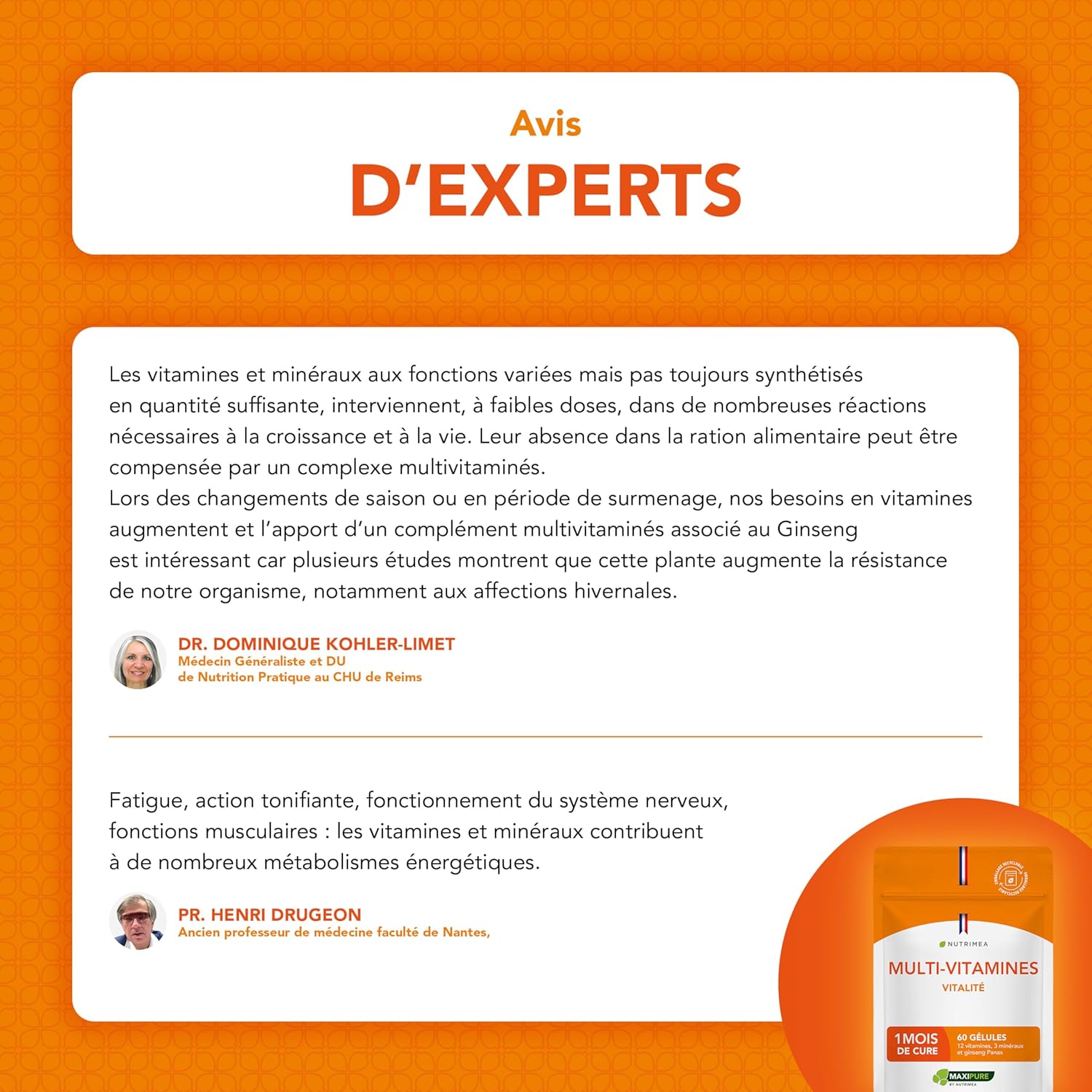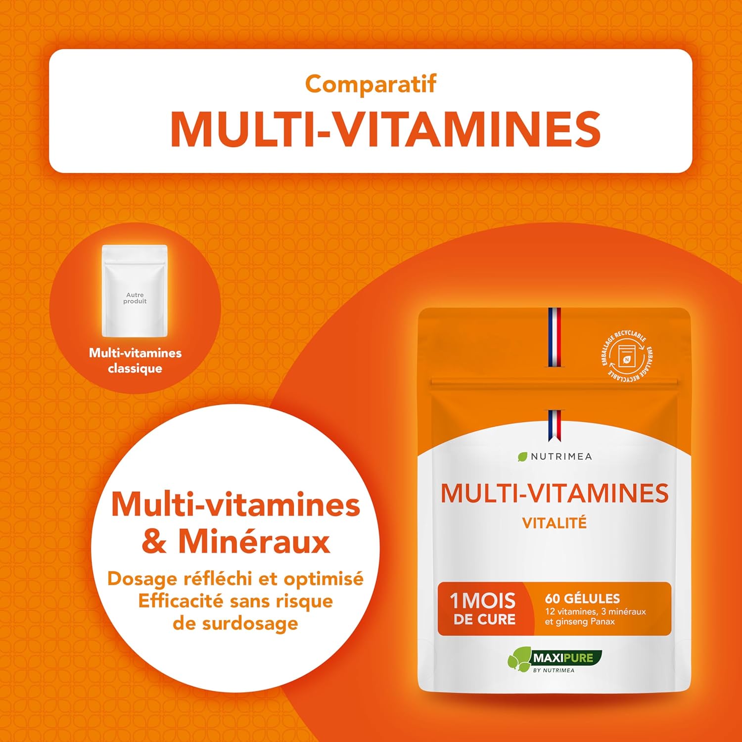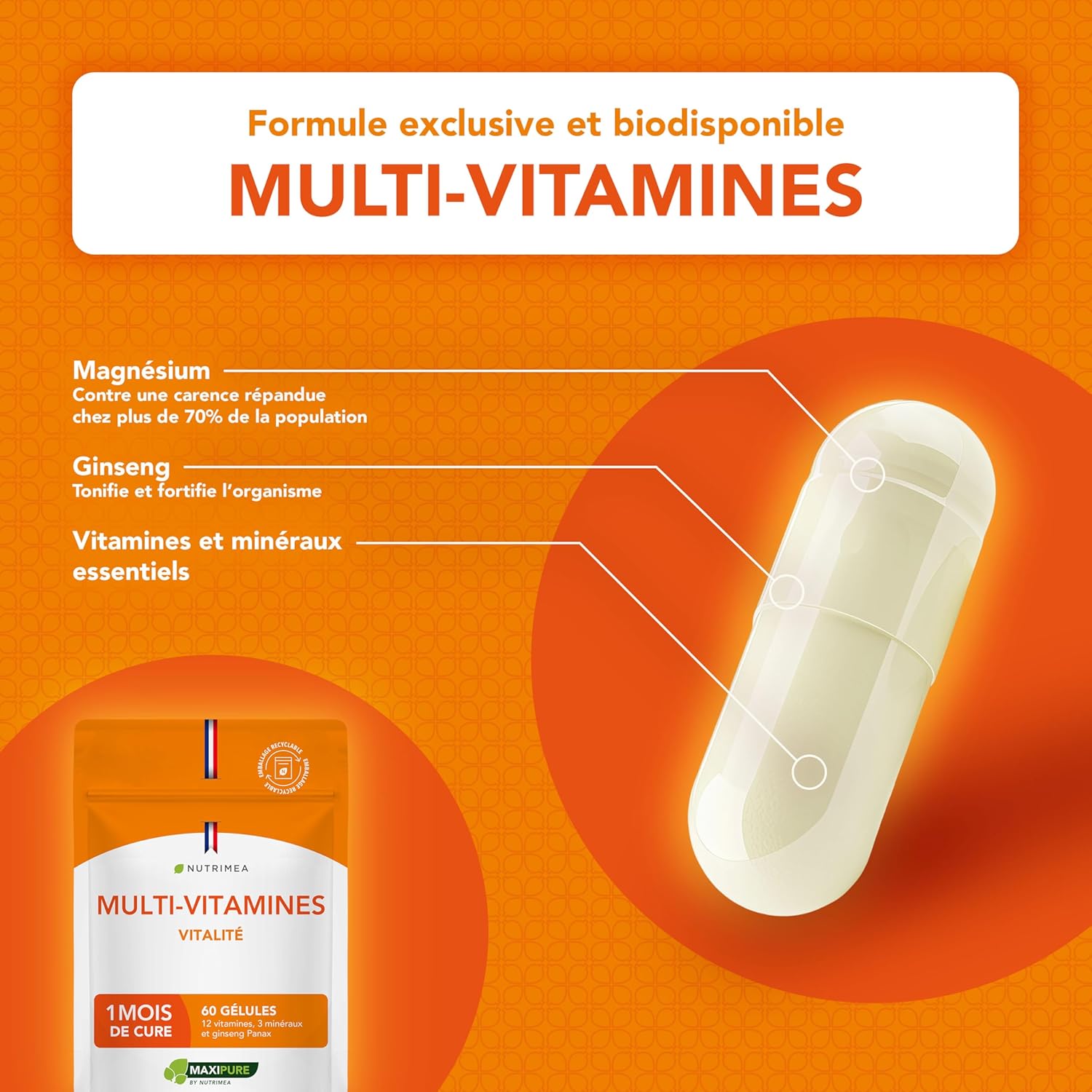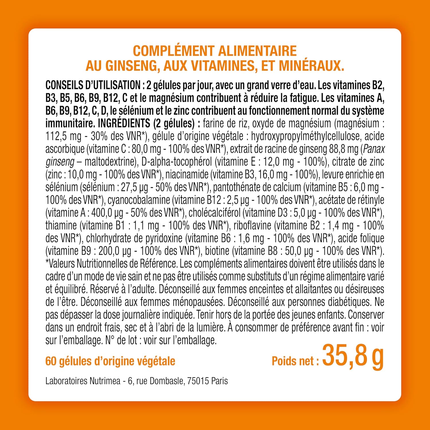 Multivitamins and Minerals – With Ginseng – Vitamins A, B1, B2, B3, B5, B6, B8, B9, B12, C, D3, E, Magnesium, Selenium and Zinc – Energy, Vitality, Immunity – Made in France – Nutrimea