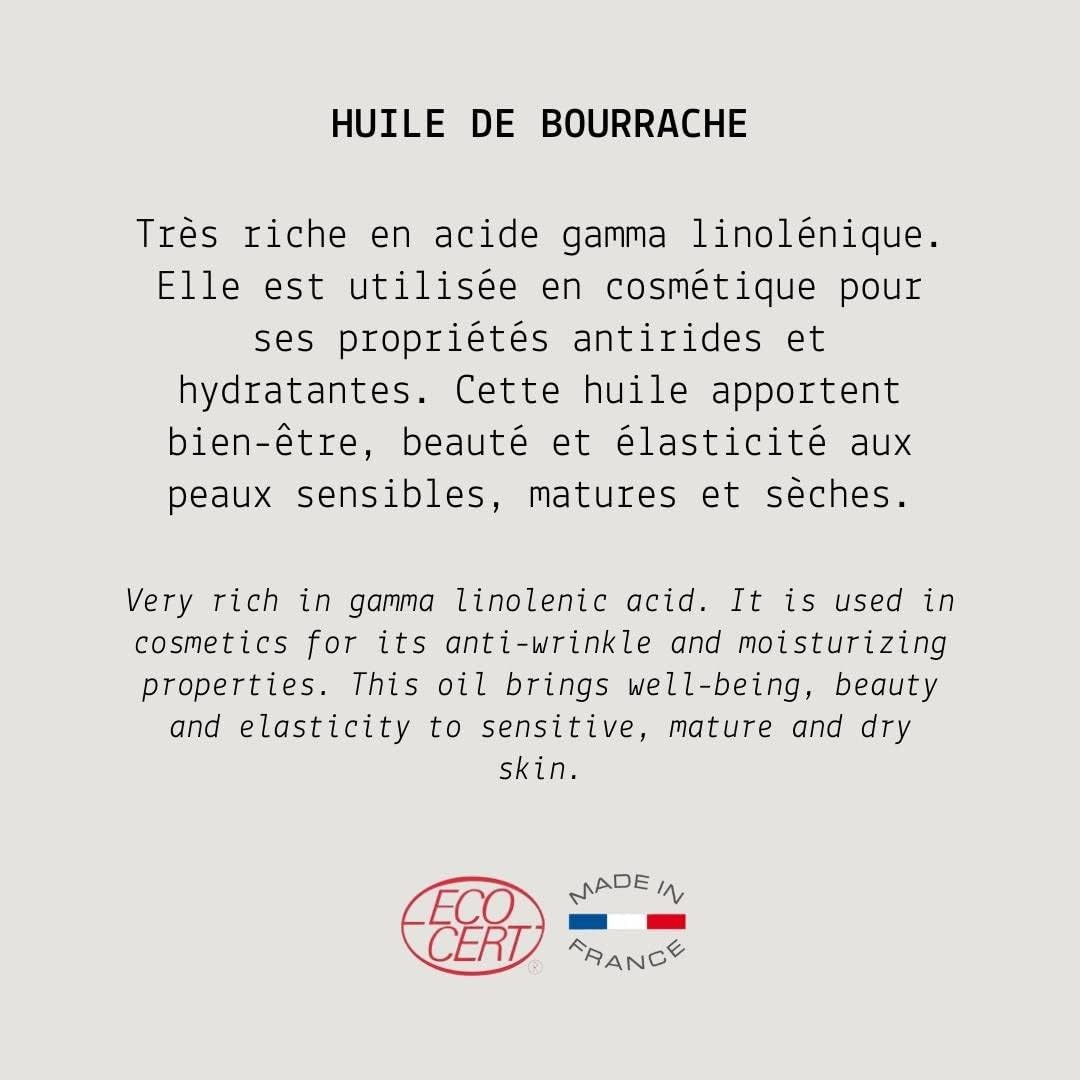 Properties: Borage oil is renowned for its anti-wrinkle properties. Rich in gamma-linolenic acid, it has regenerative properties appreciated for the care of the face, body, hair and nails.