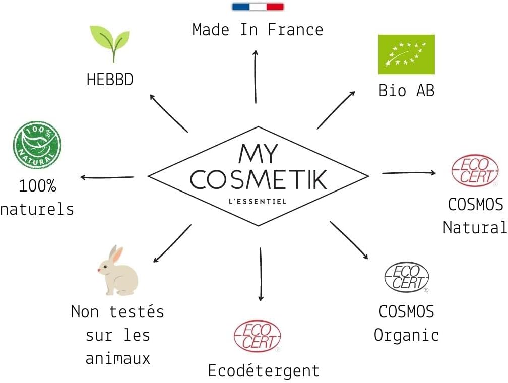Produits fabriqués en France, près de Lyon !Certificats Cosmos Ecocert & Labels BIO AB (Agriculture Biologique)Nous utilisons uniquement des matériaux et emballages recyclés et recyclables