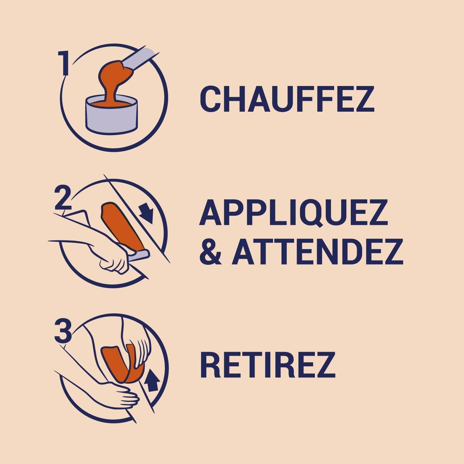 Very practical: heats up in less than 2 minutes in the microwave, applies easily & dries quickly, can be removed without strips