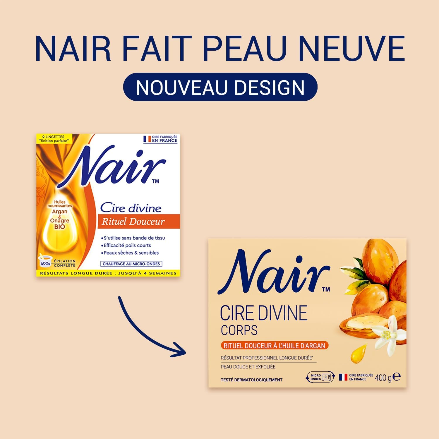 Includes: 1 x 400g tub of Divine Wax Nair Rituel Douceur with Argan and Evening Primrose Oils & 2 After Hair Removal Wipes