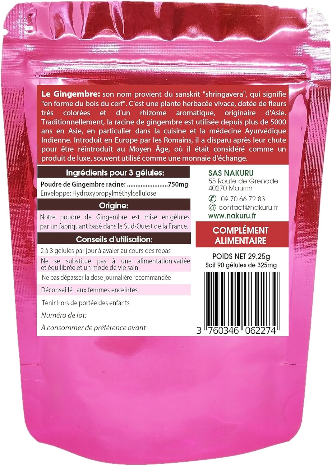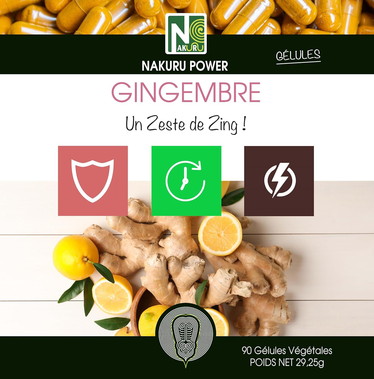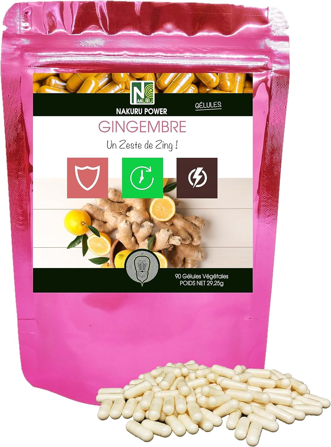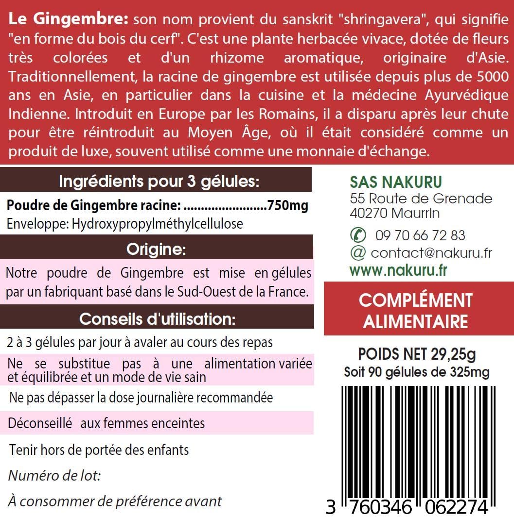 NAKURU | Ginger | Power Range | Made in France | “Un Zest de Zing!” (90 Vegetable Capsules of 325 mg/Net Weight: 29 g)
