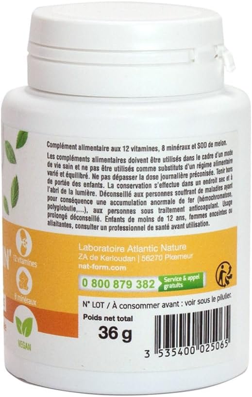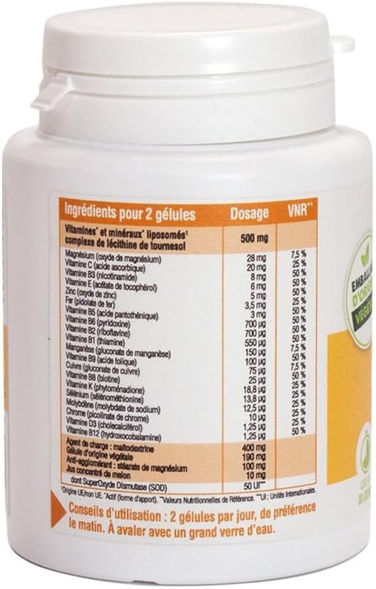 A real energy concentrate, this complex of active ingredients with 12 liposomed vitamins and minerals helps bring tone and vitality to the body. Melon SOD, harvested in the south of France, completes the formula.