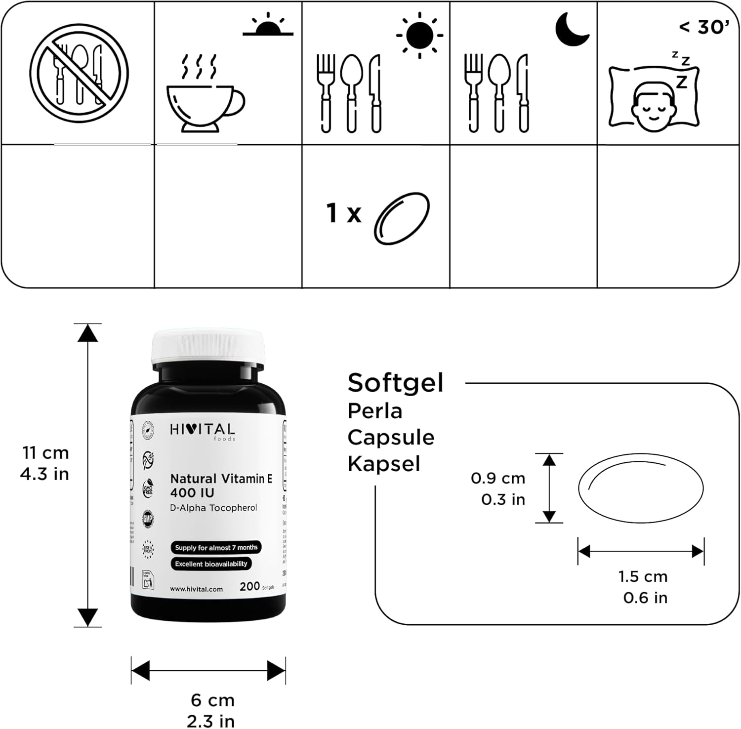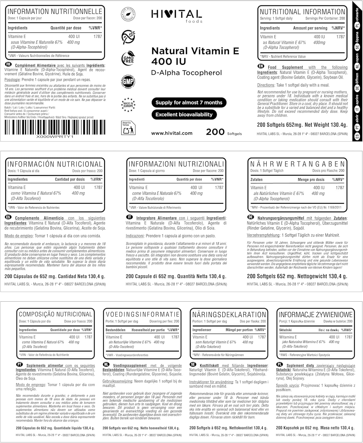 Natural Vitamin E 400 IU (D-Alpha Tocopherol). 200 oil capsules for more than 6 months of treatment. Made with 400 mg of Natural Vitamin E. Made in Europe by HIVITAL