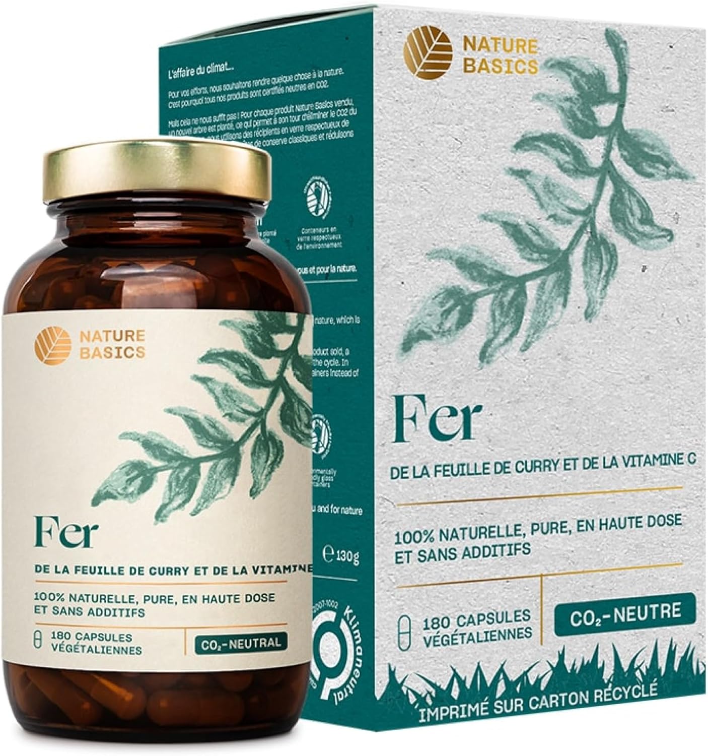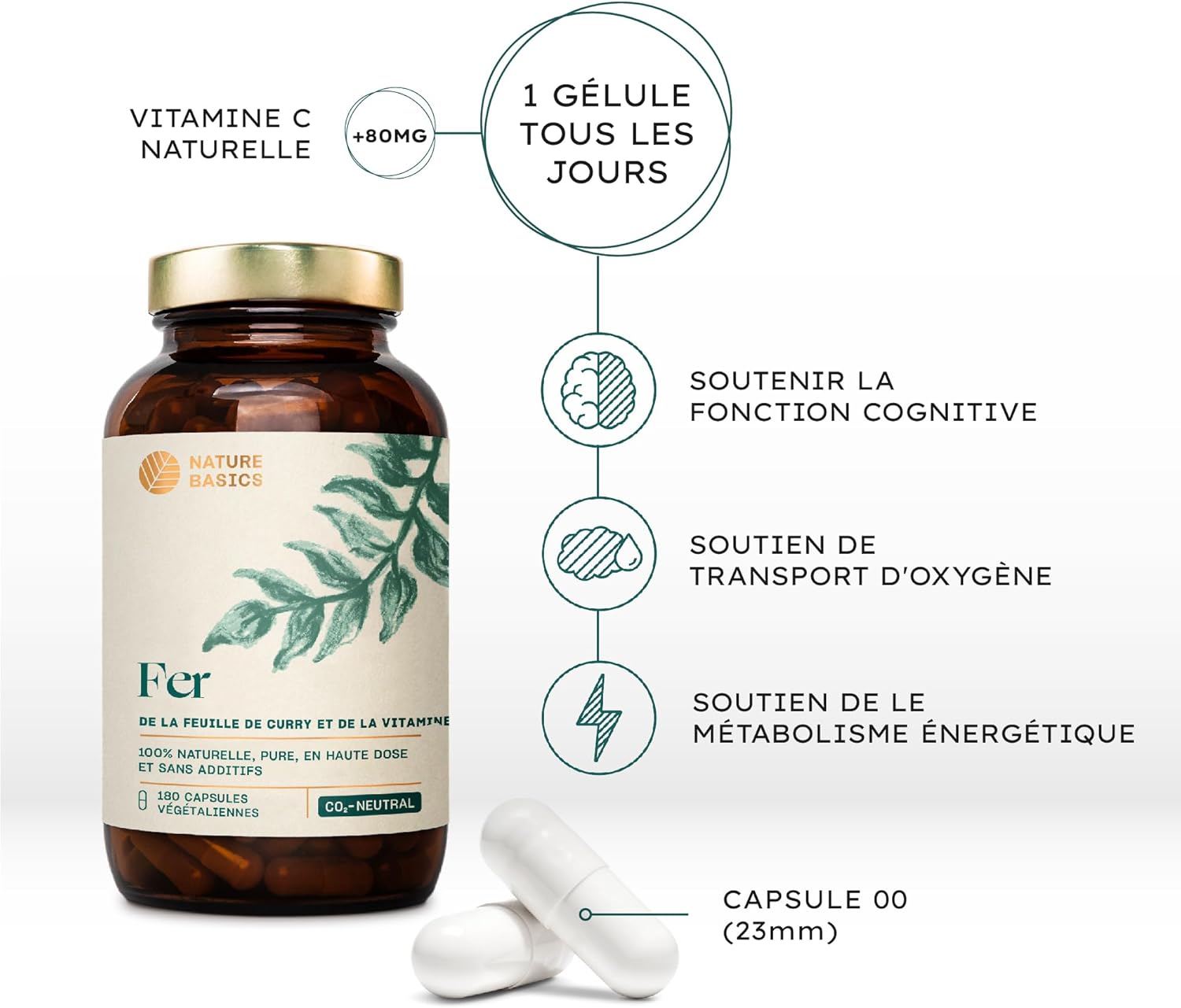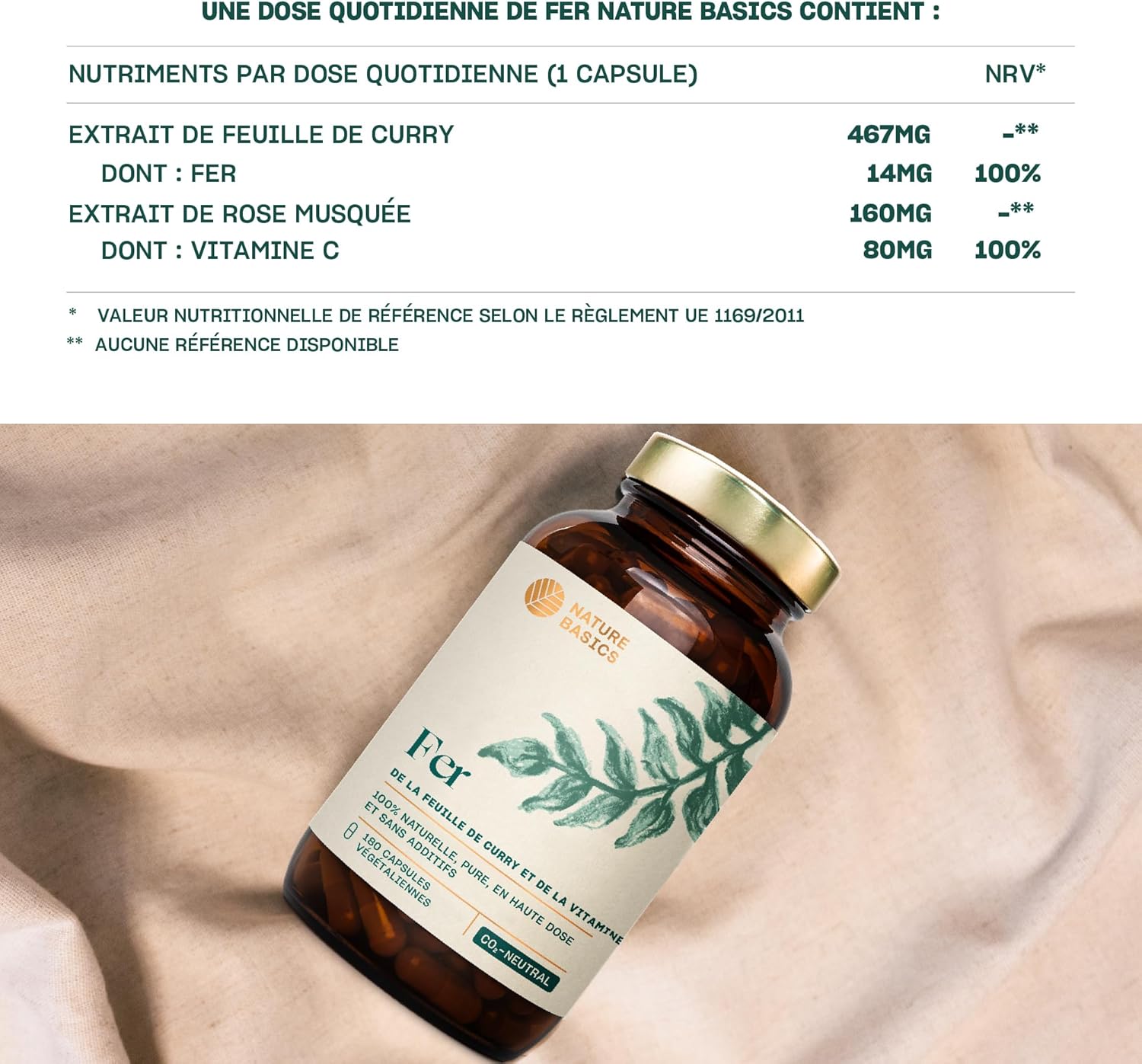 ️ SUPPLY FOR 6 MONTHS – 180 capsules with a highly dosed curry leaf extract of 467 mg per daily dose (1 capsule), including 14 mg of natural iron and 80 mg of vitamin C of rose hip extract for optimal bioavailability. At Nature Basics, we recommend 1 natural iron capsule per day.