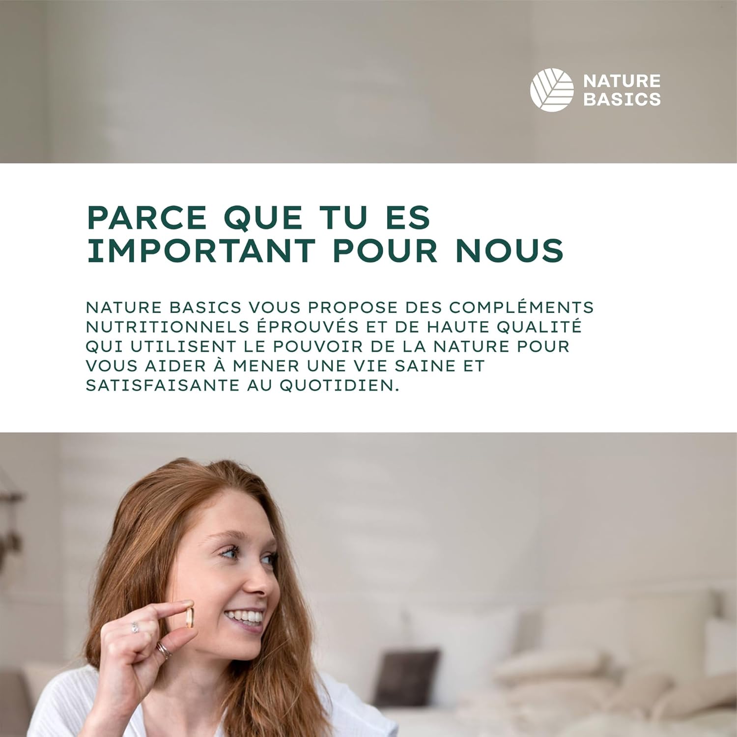 Trois flacons de suppléments en verre foncé disposés avec des ingrédients naturels et des capsules sur un fond de papier déchiré. Le texte allemand indique la gamme de produits Nature Basics.Trois flacons de suppléments en verre foncé disposés avec des ingrédients naturels et des capsules sur un fond de papier déchiré. Le texte allemand indique la gamme de produits Nature Basics.