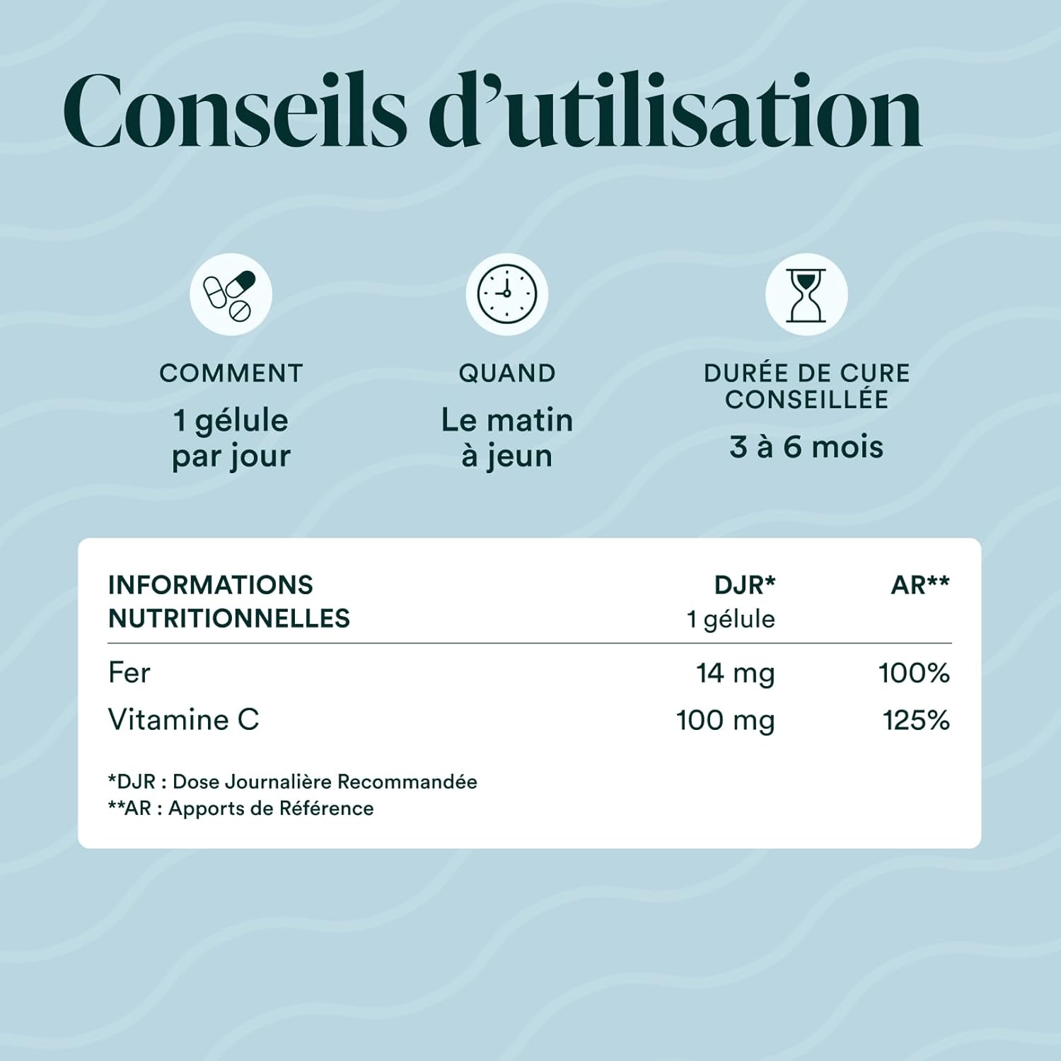 IDEAL AGAINST IRON CARENCE. Taking an iron supplement is beneficial for vegetarians and vegan, in case of intense physical activity and in women during menstruation or in the case of pregnancy and breastfeeding. With 90 vegetable capsules, each bottle contains 3 months of cure.