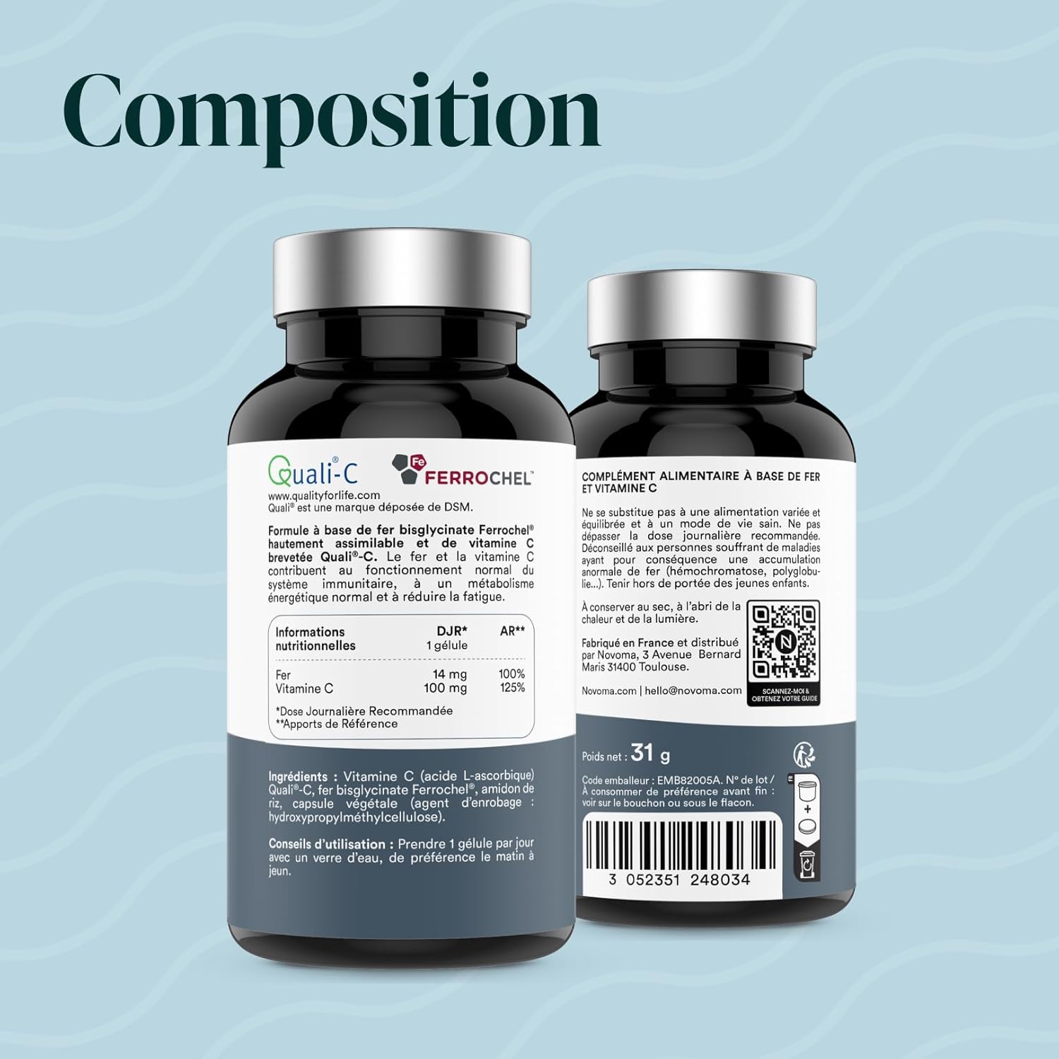 NOVOMA Iron Bisglycinate 14 mg + Vitamin C, High Absorption, Immunity & Anti-Fatigue, 3 Months Cure, Ferrochel® Patented Dietary Supplement, 90 Vegan Capsules, Made in France