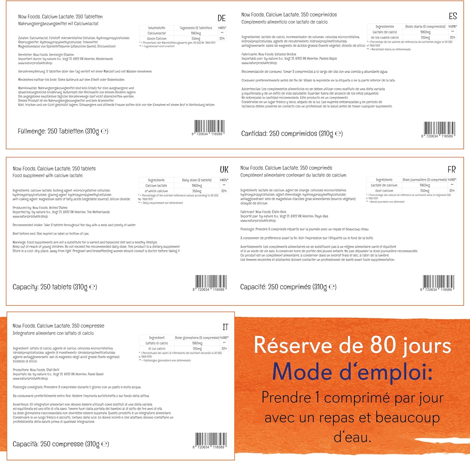 IMPORTANT NUTRIMENTS: Now Foods Calcium Lactate contains 1962 mg of calcium lactate, including 255 mg of calcium; an important nutrient that is involved in many processes in the human body