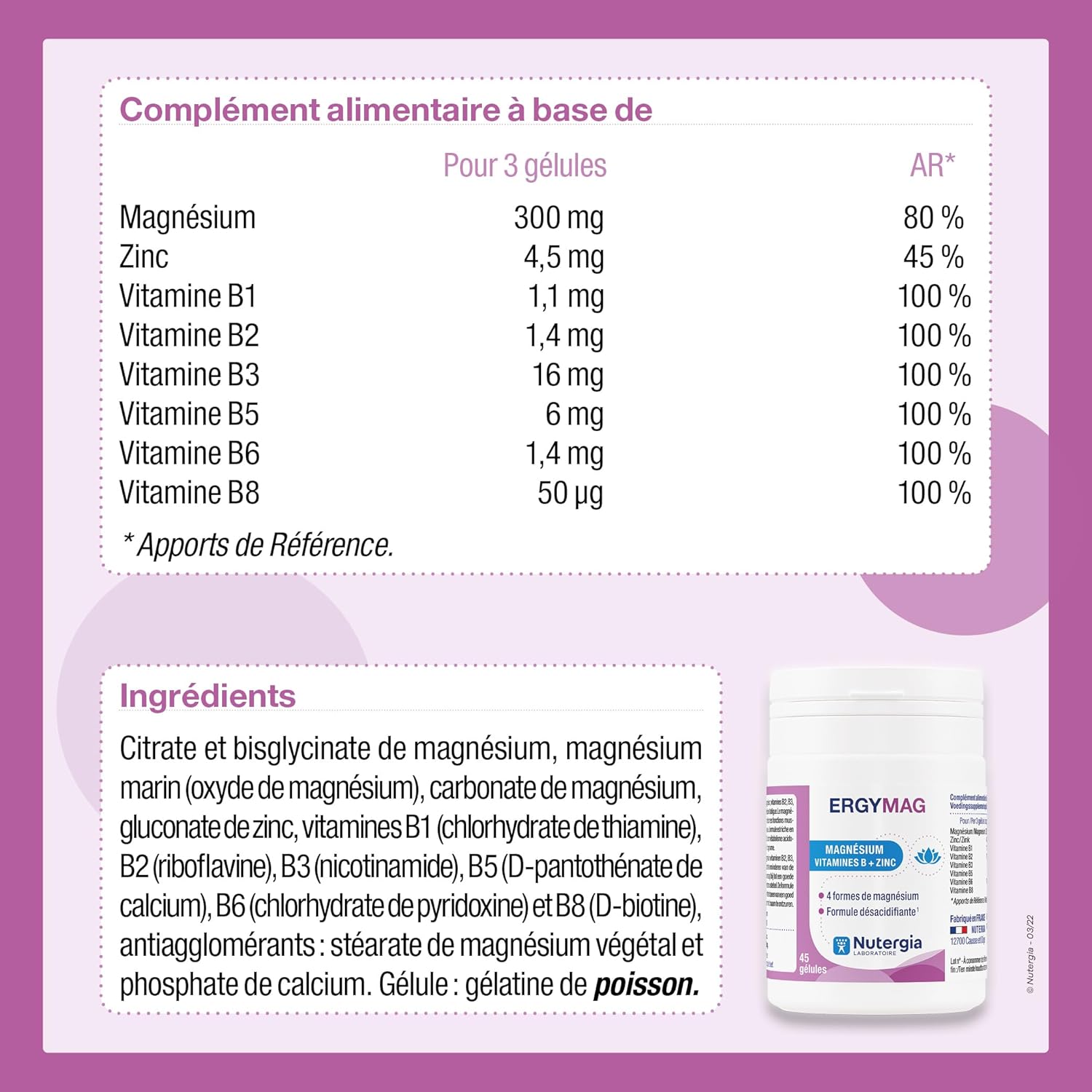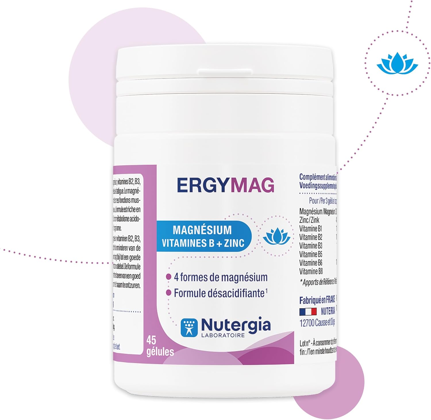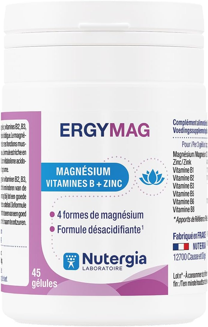 Nutergia Ergymag 45 capsules is a food supplement proposed by the Nutergia laboratory. It consists of several forms of magnesium: magnesium citrate, very well assimilated by the body, magnesium bisglycinate, also endowed with a very high bioavailability, magnesium oxide, the form endowed with the highest element magnesium content, magnesium carbonate, which also has a fairly high element magnesium content. Magnesium is known for