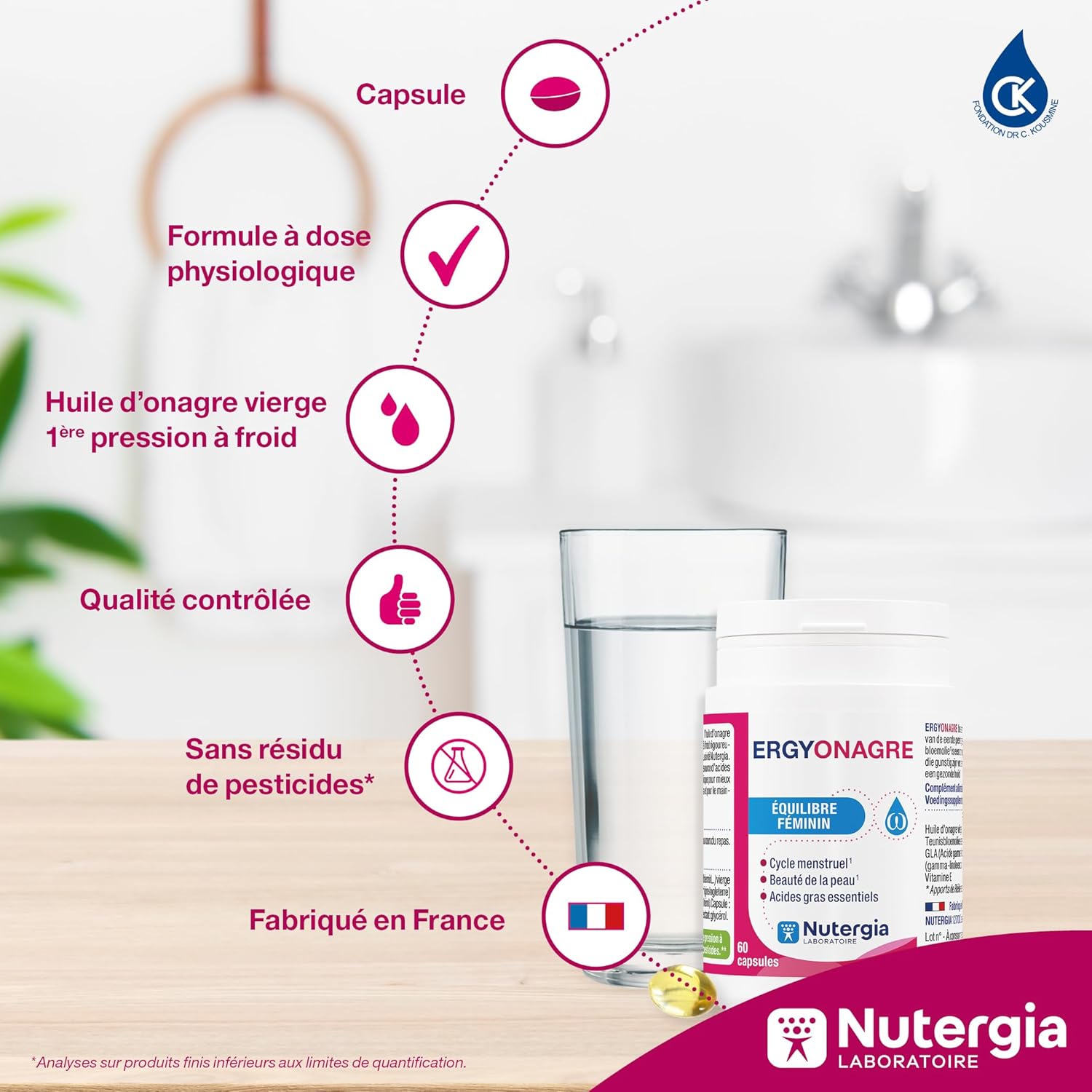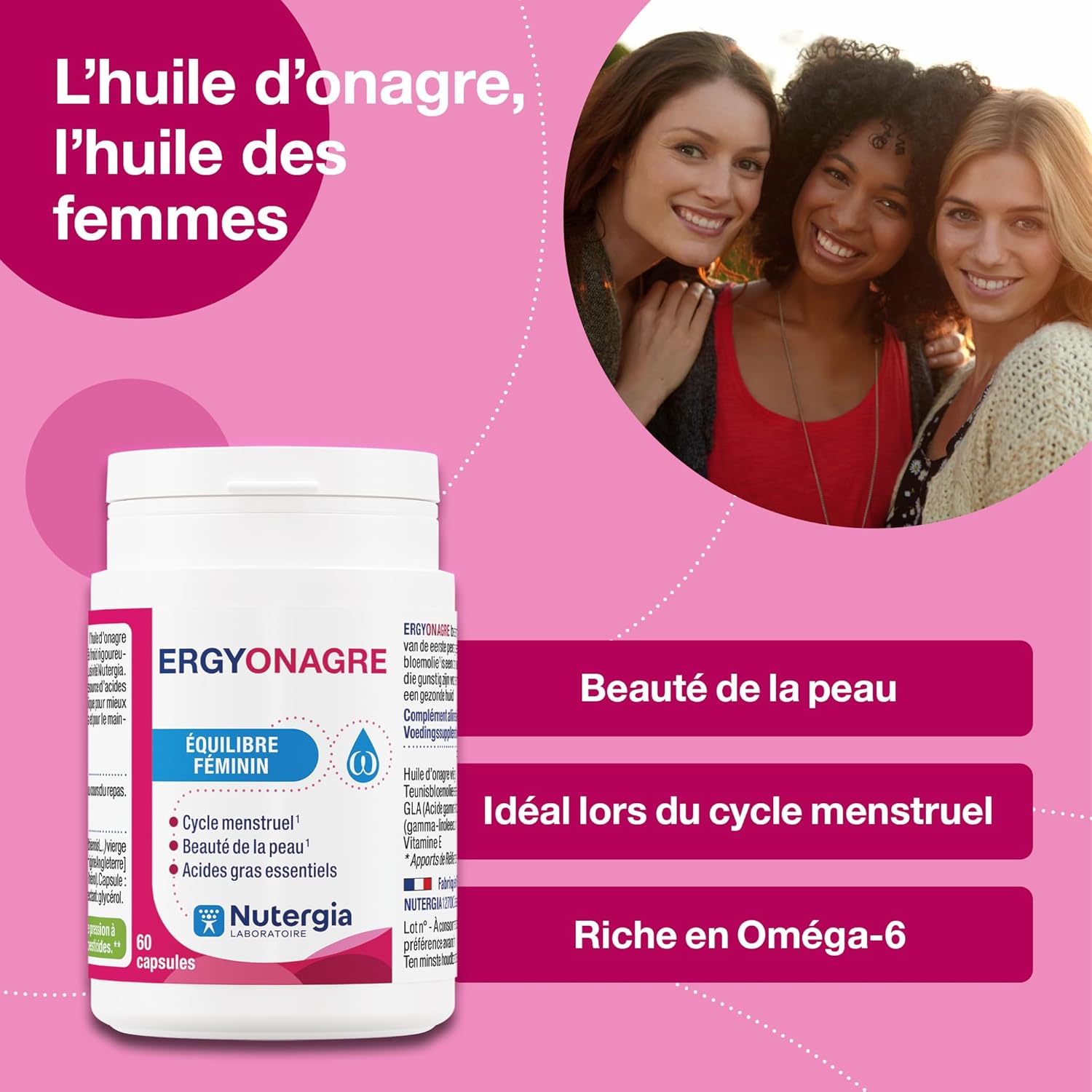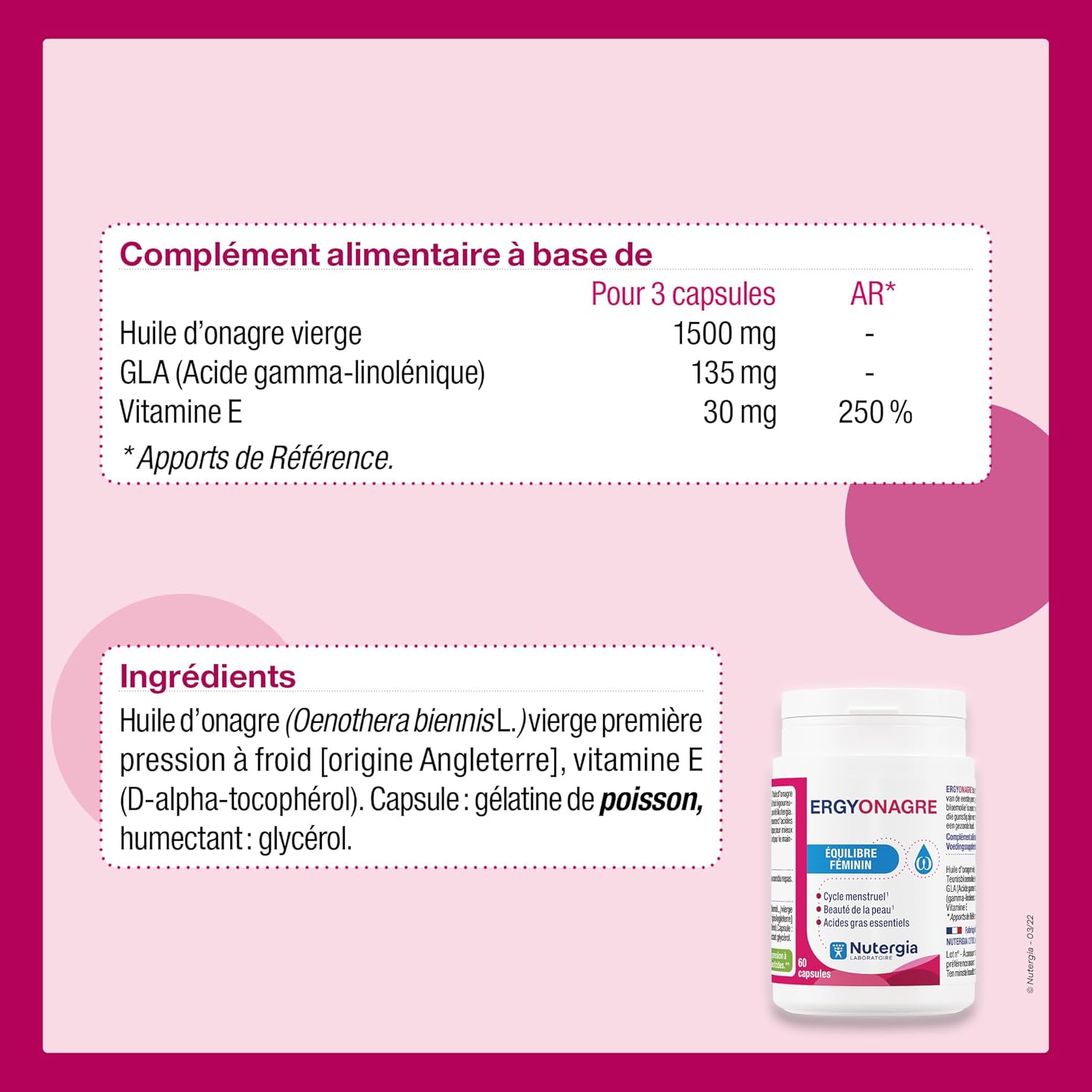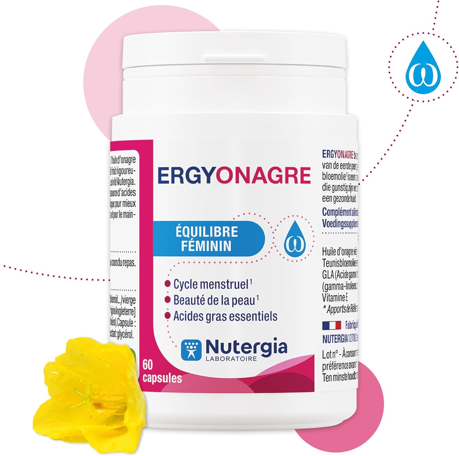 ERGYONAGR: FEMALE BALANCE WHEN TO USE IT: -For female comfort during the MENSTRUAL CYCLE (premenstrual syndrome). Evening primrose helps to better manage female inconvenience during menstrual cycles. -For HORMONAL FEMININE BALANCE (PERI-MENOPAUSE). Evening primrose supports hormonal health. -For CUTANE COMFORT (DRY WATER, ALLERGIC TERRAIN…). Evening primrose oil helps maintain healthy skin and connective tissue. -For the beauty of the skin. The fatty acids contained in evening primrose contribute to the maintenance of beautiful skin. PRODUCT DESCRIPTION: Supplement based on virgin evening primrose oil, obtained by first cold pressing and of controlled quality. Evening primrose oil is rich in polyunsaturated fatty acids (PUFAs) of the omega-6 family, linoleic (LA) and gamma-linolenic acids (GLA), precursors of prostaglandins, regulatory molecules associated with many metabolic functions of the body. Instructions for use: 2 to 3 capsules per day during the meal. Oral use only. Keep out of reach of children, at a temperature below 25 ° C and away from moisture. It is not a substitute for a varied and balanced diet and a healthy lifestyle. Do not exceed the recommended daily dose. NUTERGIA: Expert in micronutrition, designs, produces and distributes dietary supplements that meet the concept of Active Cell Nutrition. Synergies between plants, trace elements and probiotics, our exclusive formulas combine quality ingredients, rigorously selected with respect for the health of the individual and the naturalness of the active ingredients. From the design to the manufacture of our food supplements, to their quality control, all the steps are under the expertise of our teams composed of scientists, pharmacists and nutrition engineers, based in our laboratory in Aveyron.