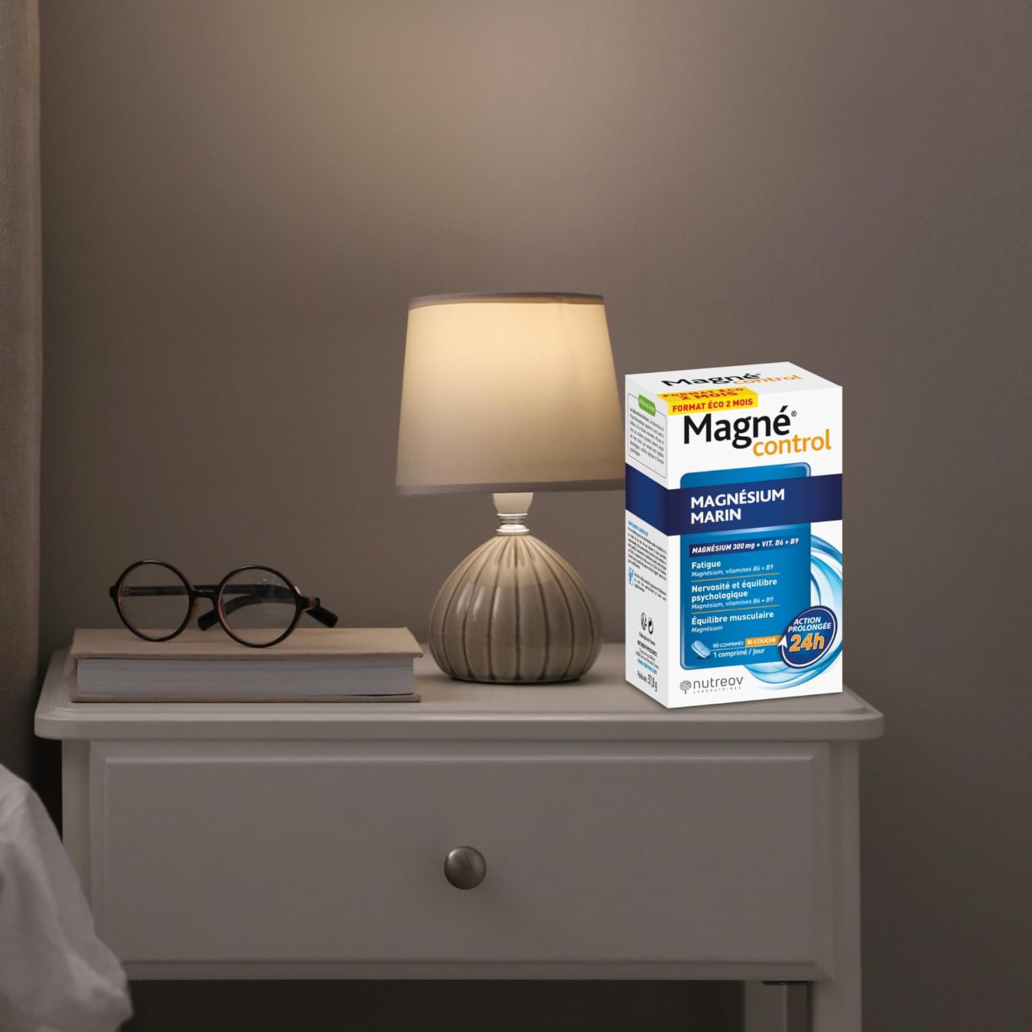 FOOD SUPPLEMENT FOR FATIGUE: The innovative formula of this food supplement combines 300 mg of magnesium and vitamins B6 and B9 for optimal synergistic action. It contributes to normal psychological functions and normal functioning of the nervous system. Gluten and lactose free, it is suitable for vegans. ACTION ON 24H: It is designed with two-layer technology, which ensures prolonged action over 24 hours. Immediate release white layer delivers magnesium right from the set. The blue layer, made of a cross-linked network, allows a gradual release, throughout the day. Made in France in a phyto-nutraceutical laboratory: Made in France, this food supplement is the result of our research in Phyto-Nutraceutical, which combines the benefits of phytotherapy and micronutrition to provide preventive solutions. ventive and healing Suitable for every age. Our supplements are designed to take care of both your physiological balance, your physical condition and your psychological well-being.TIPS FOR USE: Take 1 tablet daily in the morning at breakfast or in the evening at bedtime, with a large glass of water. At least for 1 month. Renew as many times as necessary. It is not a substitute for a balanced and varied diet and a healthy lifestyle. Keep out of reach of young children. Do not exceed the recommended daily dose. Keep cool, dry and away from light. MAKING YOUR HEALTH OUR PRIORITY: For almost 20 years, NUTREOV has put its know-how at your service to bring you the nutritional balance necessary for your well-being. We base our products on 4 fundamental values: respect for human beings and nature, innovation, demands on the quality of our formulas and total transparency.