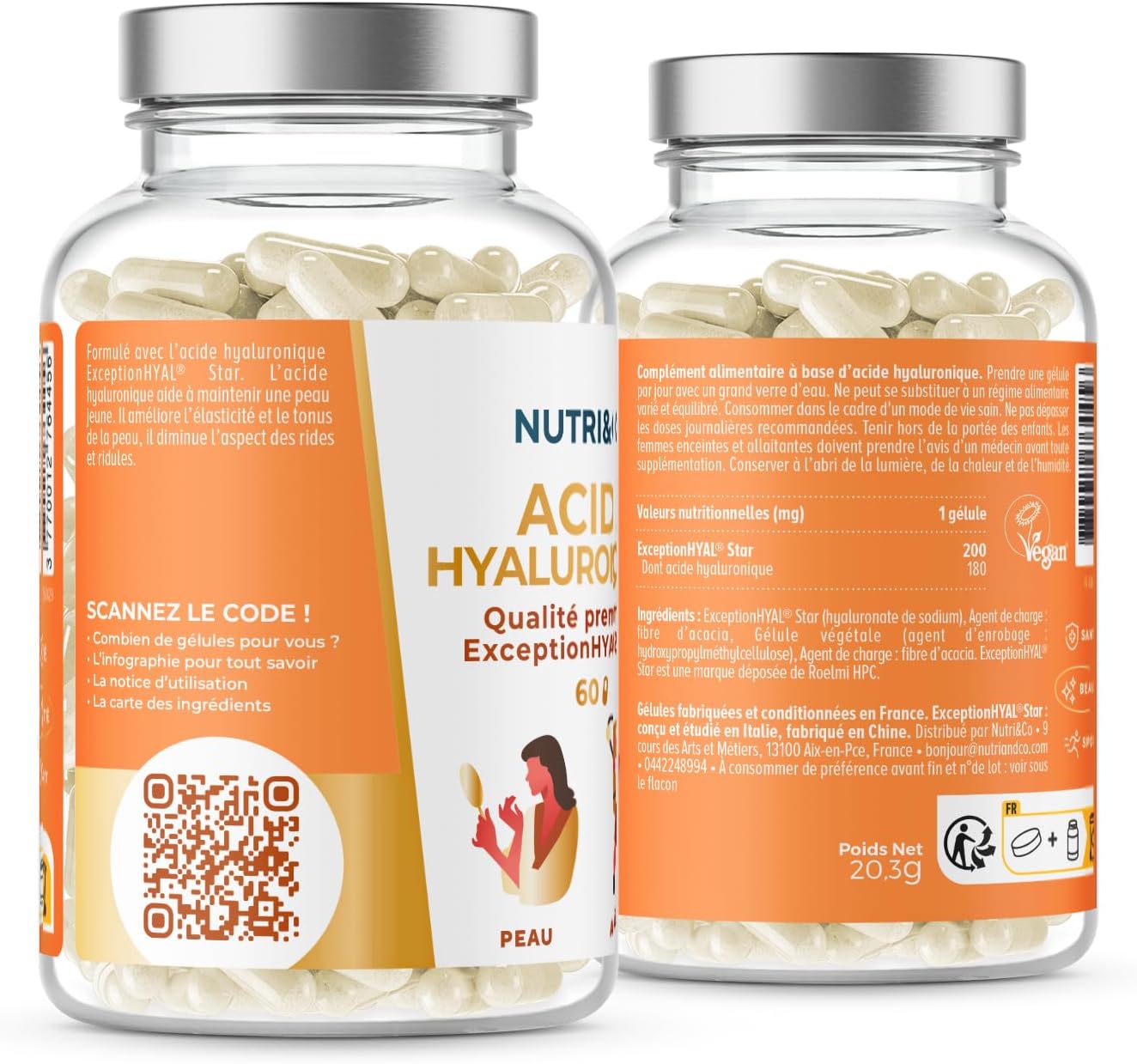Aside from its unique appearance, the patented DuoCaps technology allows 180 mg of our hyaluronic acid to be combined in 2 capsules with 315 mg of borage and evening primrose oils, selected for their GLA content, gamma-linolenic acid. and traditionally reputed for skin care.