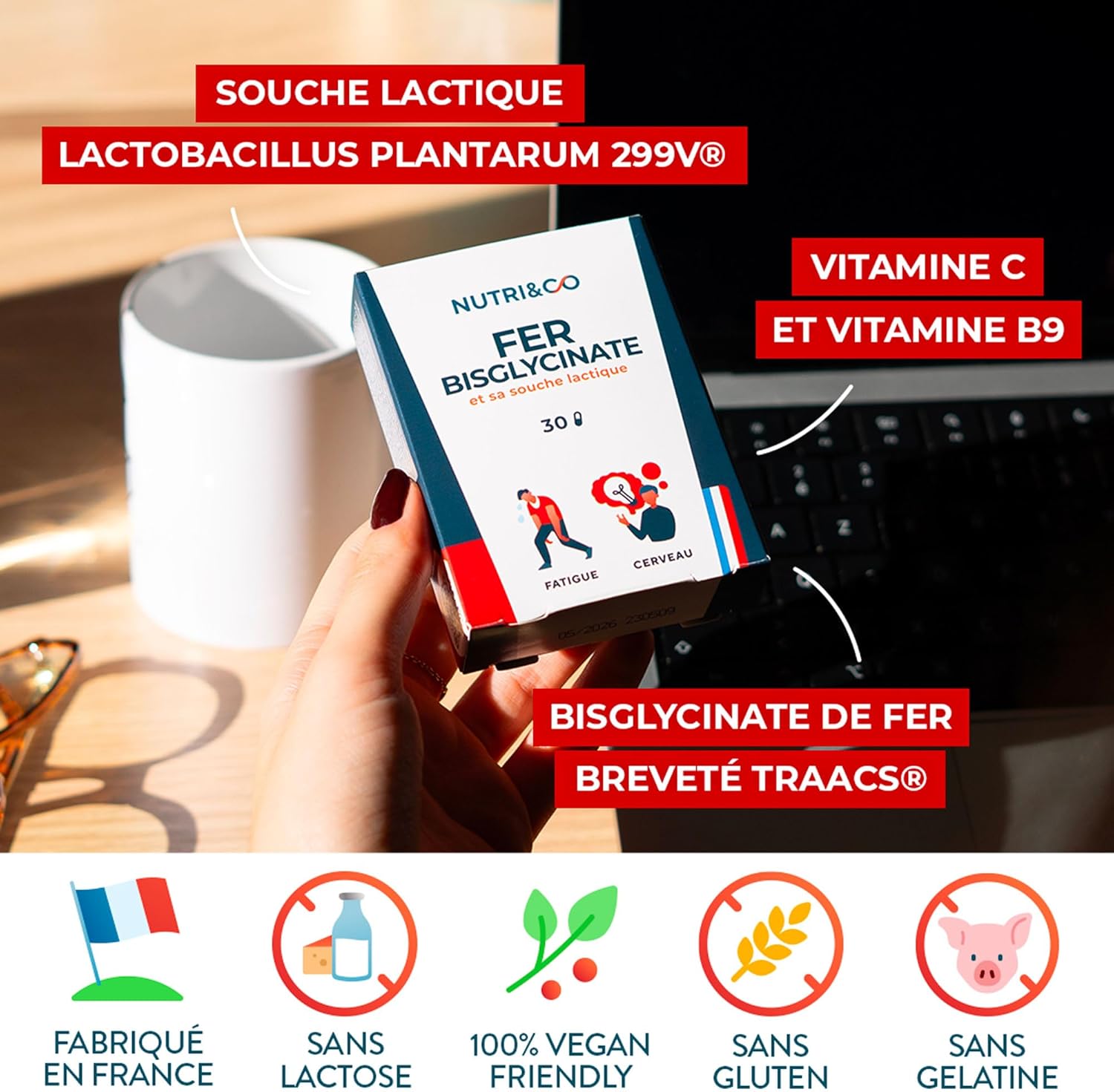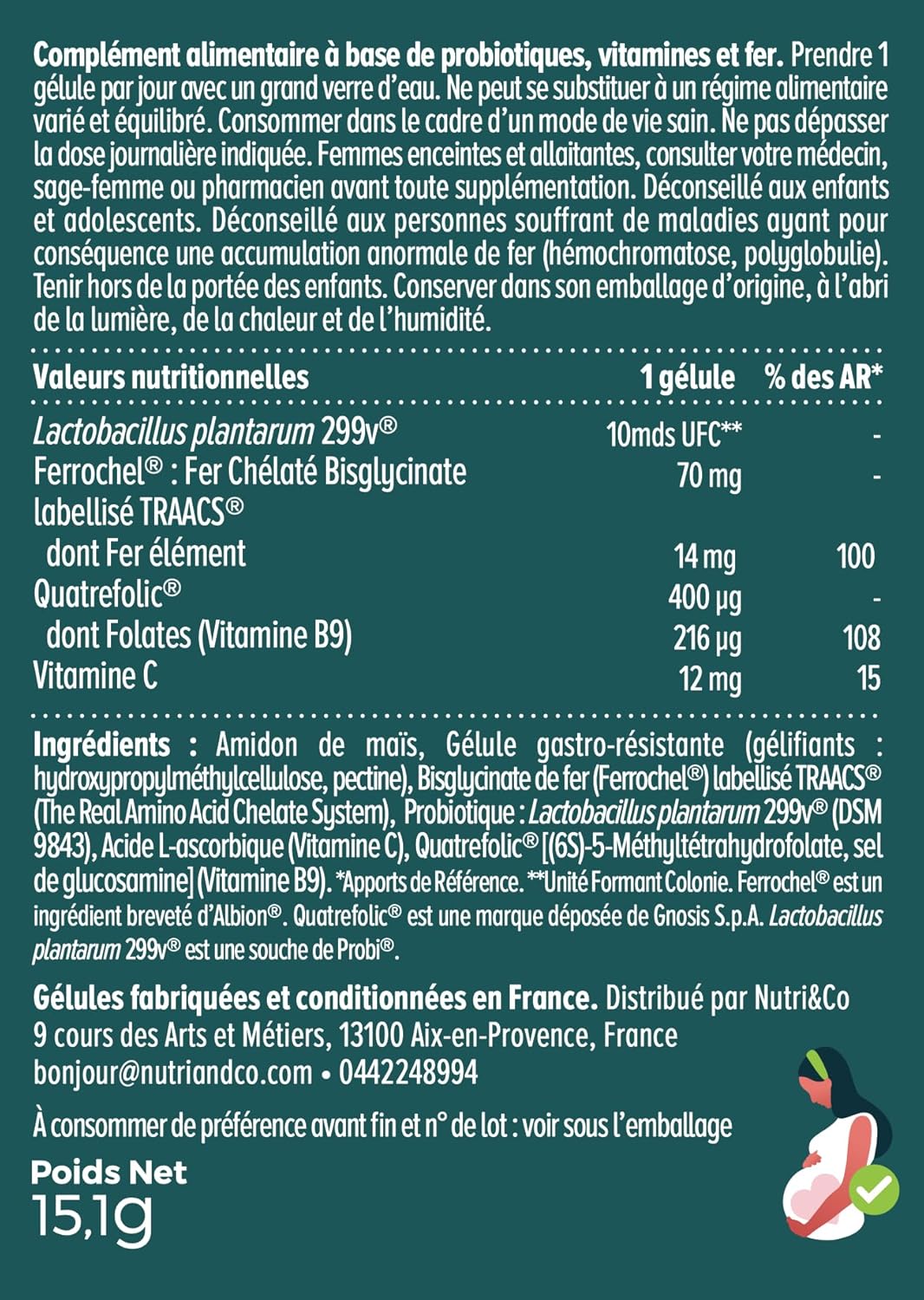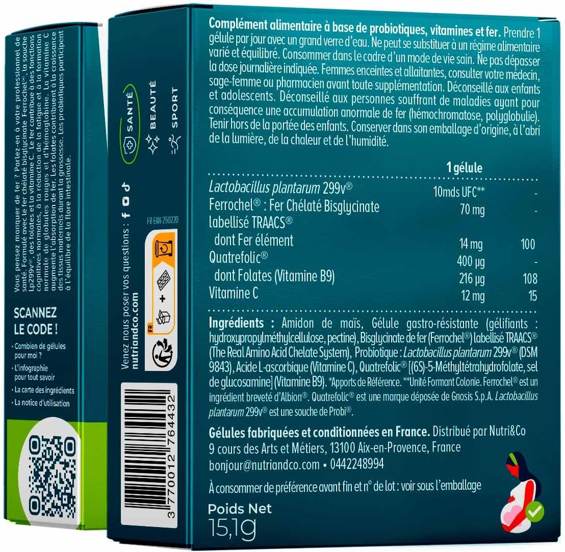 Developed and made in France – Our formula is designed in France in Aix-en-Provence and manufactured near Nantes. Our ingredients are all traced: our trace element Iron (origin USA), the lactic strain (origin USA), folates (origin Italy) and vitamin C (origin Israel). Our formula is vegan friendly