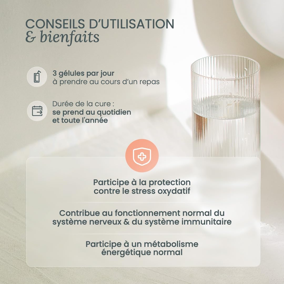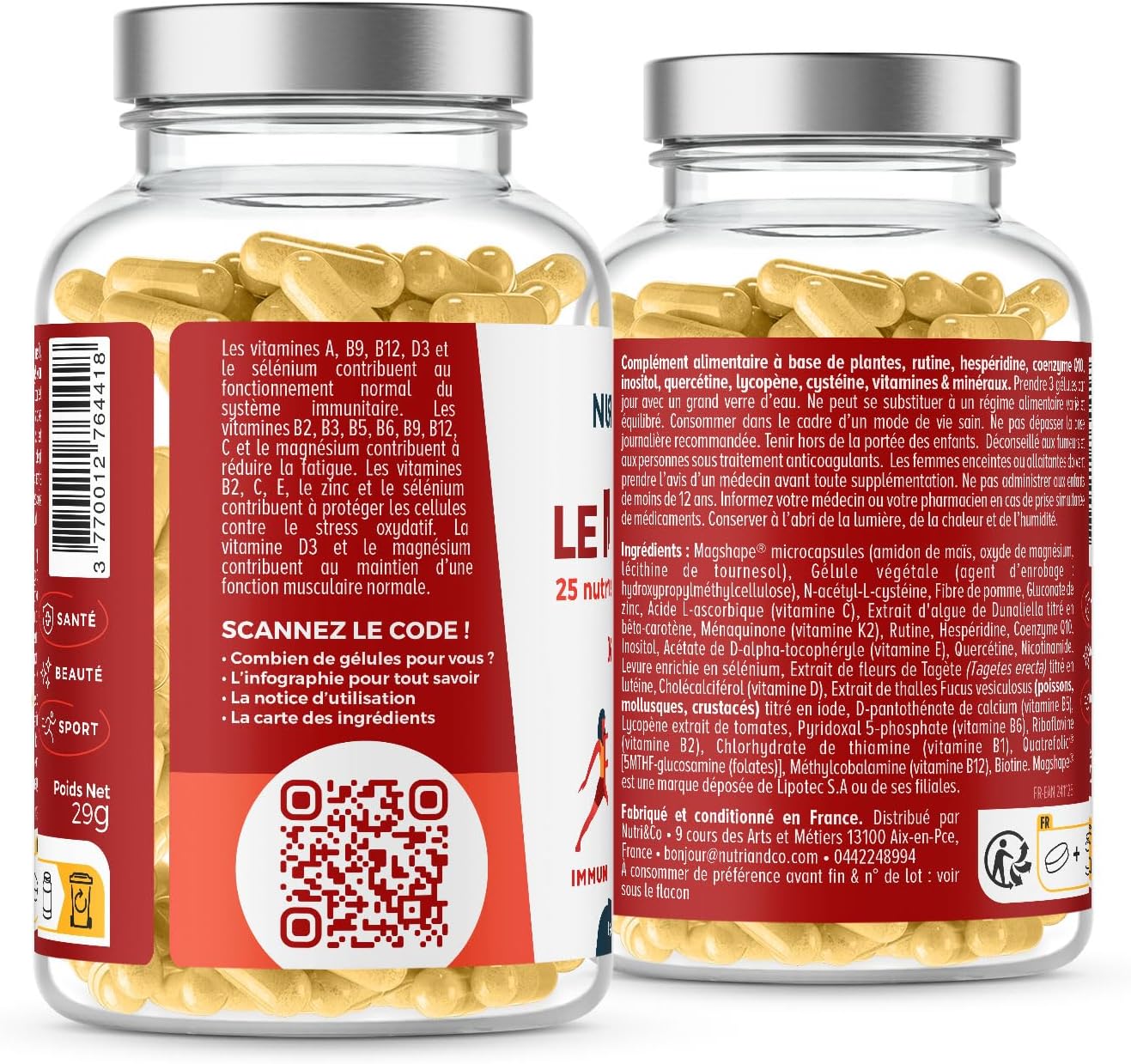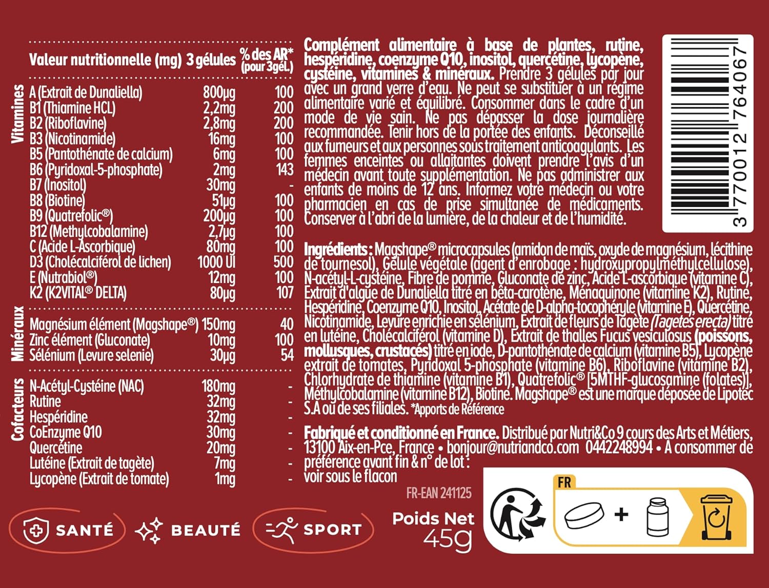 Rich in nutrients – Multi Nutri&Co contains many vitamins including vitamin C, B (including B9 and B12), vitamin D, vitamin E, K2 as well as zinc and magnesium, as well as many plant cofactors such as carotenoids and bioflavonoids, coenzyme Q10 and alpha-lipoic acid. (May contain traces of fish, molluscs, crustaceans)