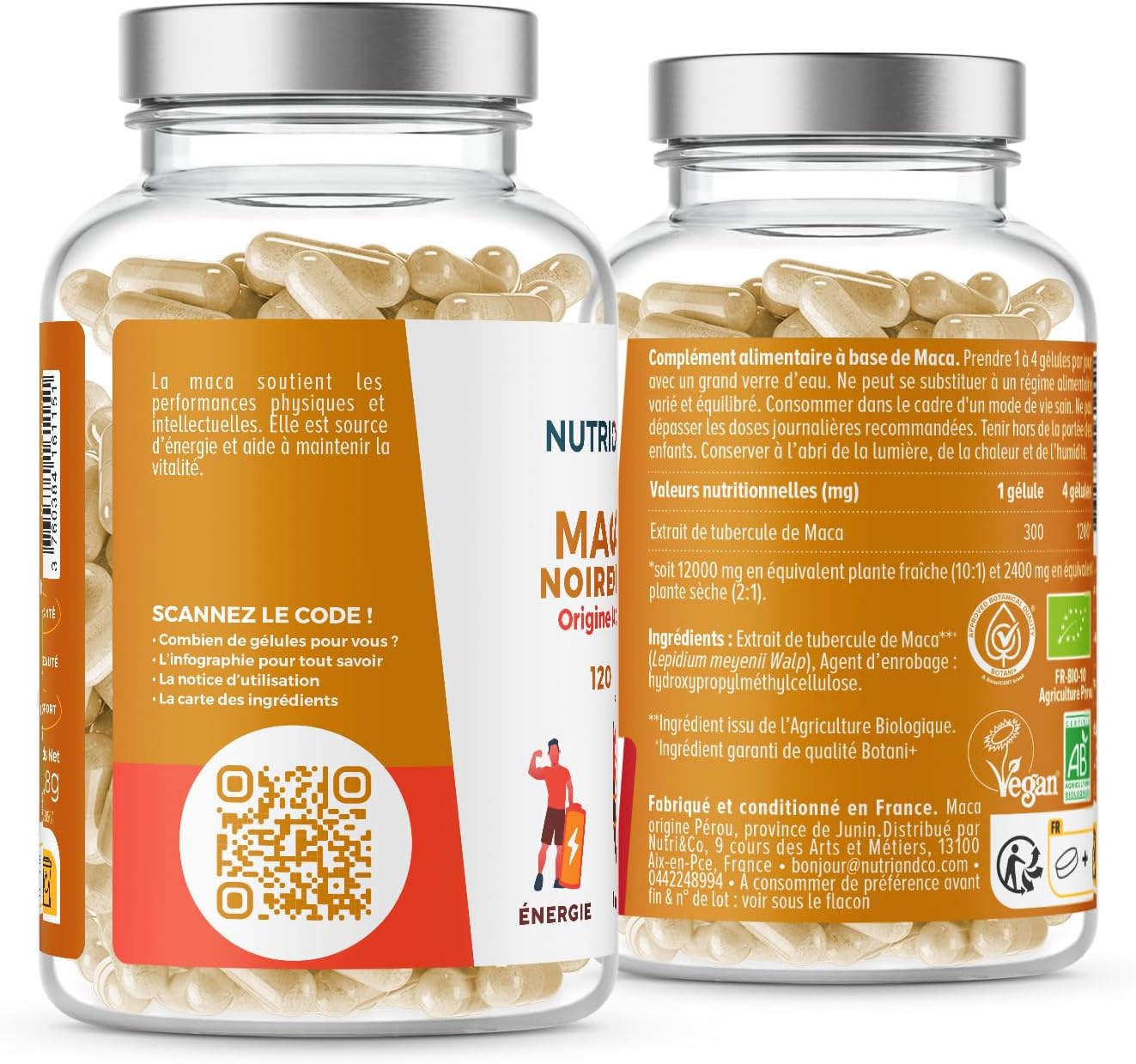 Scan the QR Code – Dosage & list of ingredients, discover everything you want to know about our Maca Noire Bio thanks to our fun and interactive packaging! Our Maca is grown in Peru by the company Natural Origins and is packaged in France. Our food supplement is gluten-free, gelatin-free, sweeteners, added sugars, additives and controversial excipients and is certified vegan and organic.